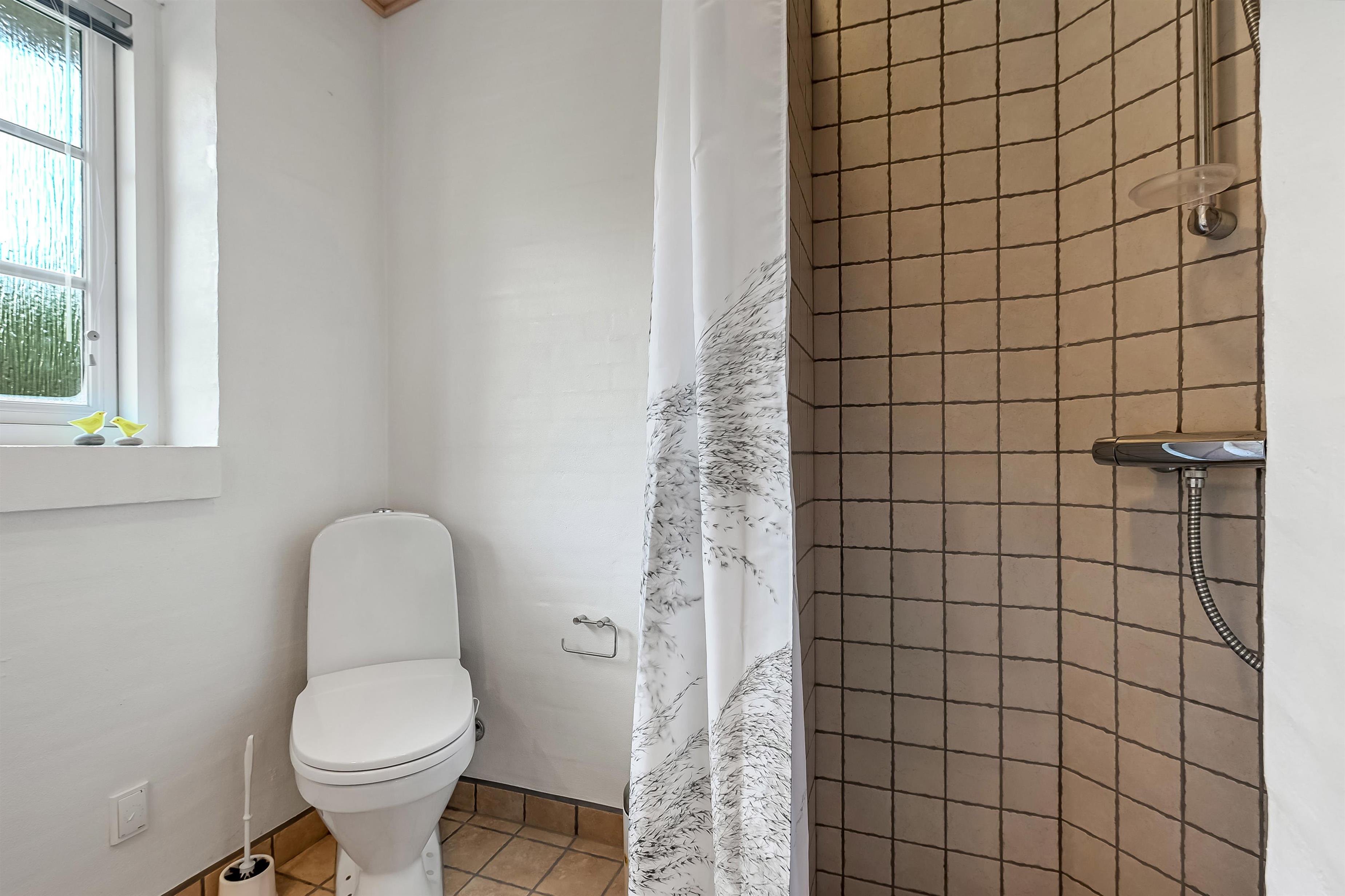 Huset har to pæne badeværelser, begge med bruser, samt to soveværelser – et med en bred dobbeltseng og et med en mindre dobbeltseng.