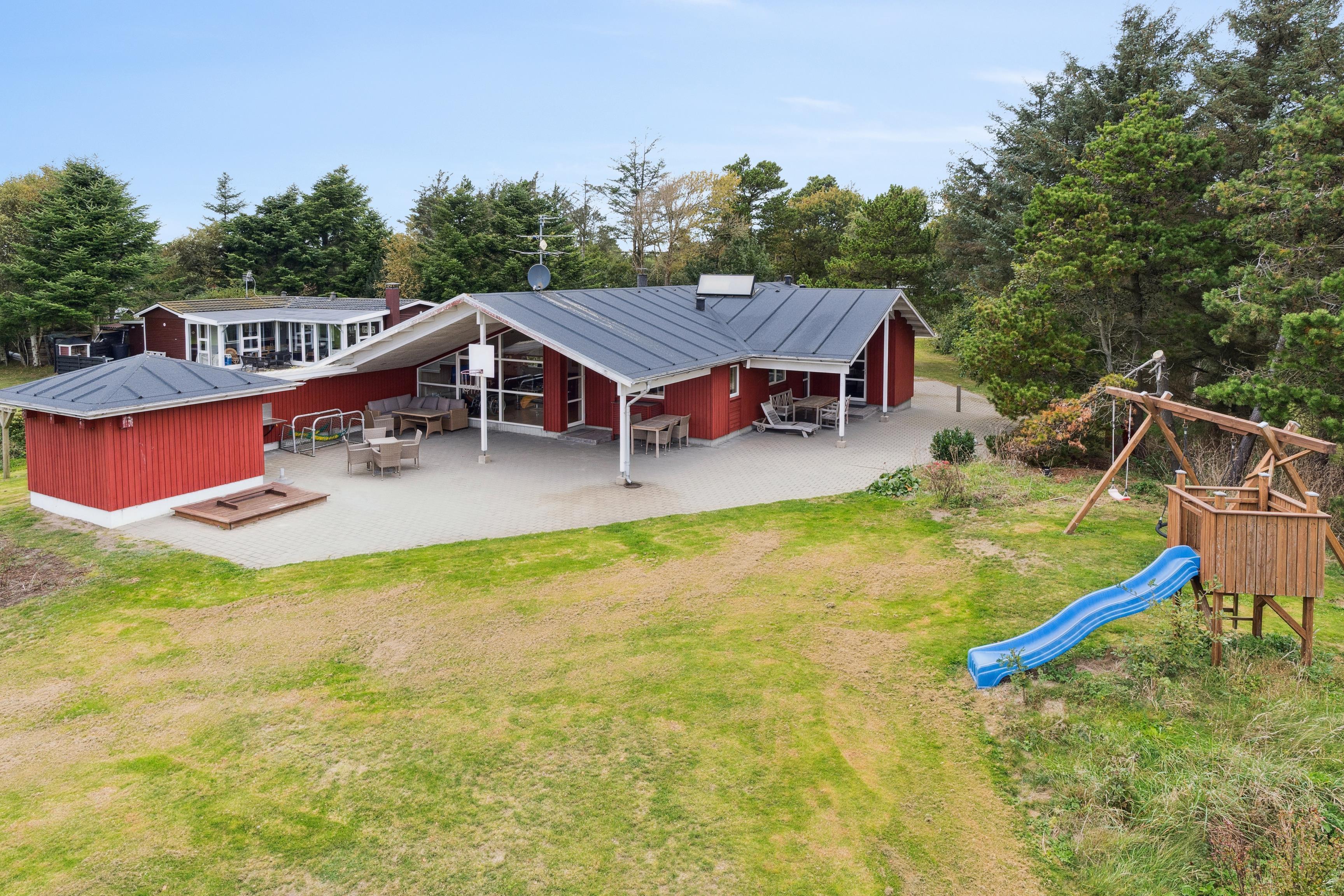 Den store, dejlige grund inviterer til masser af leg, afslapning og aktiviteter i det fri. Her kan børnene more sig på gyngerne, i sandkassen eller i legetårnet, mens de voksne nyder solen og roen. Det flotte udekøkken giver jer mulighed for at tilberede dagens måltider under åben himmel – eller rense fangsten, hvis I har været ude at fiske.