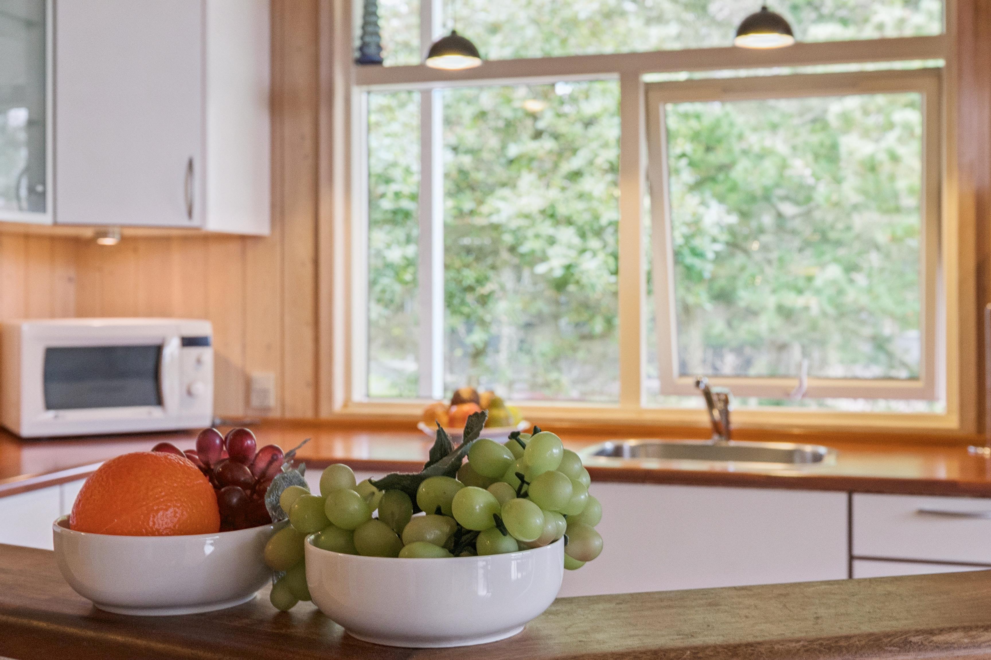 Det moderne køkken er fuldt udstyret og ligger i åben forbindelse med stuen, så man kan være sammen, mens der laves mad, spilles spil eller slappes af foran brændeovnen, som spreder varme og hyggelig stemning i de kolde måneder.