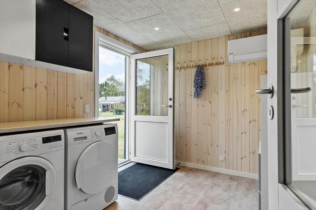 Sommerhus i Fjellerup strand og by, Østjylland, med plads til 5 voksne, 2 børn og 1 husdyr. Der er en hyggelig indretning, og du finder desuden vaskemaskine, opvaskemaskine og tørretumbler i boligen.