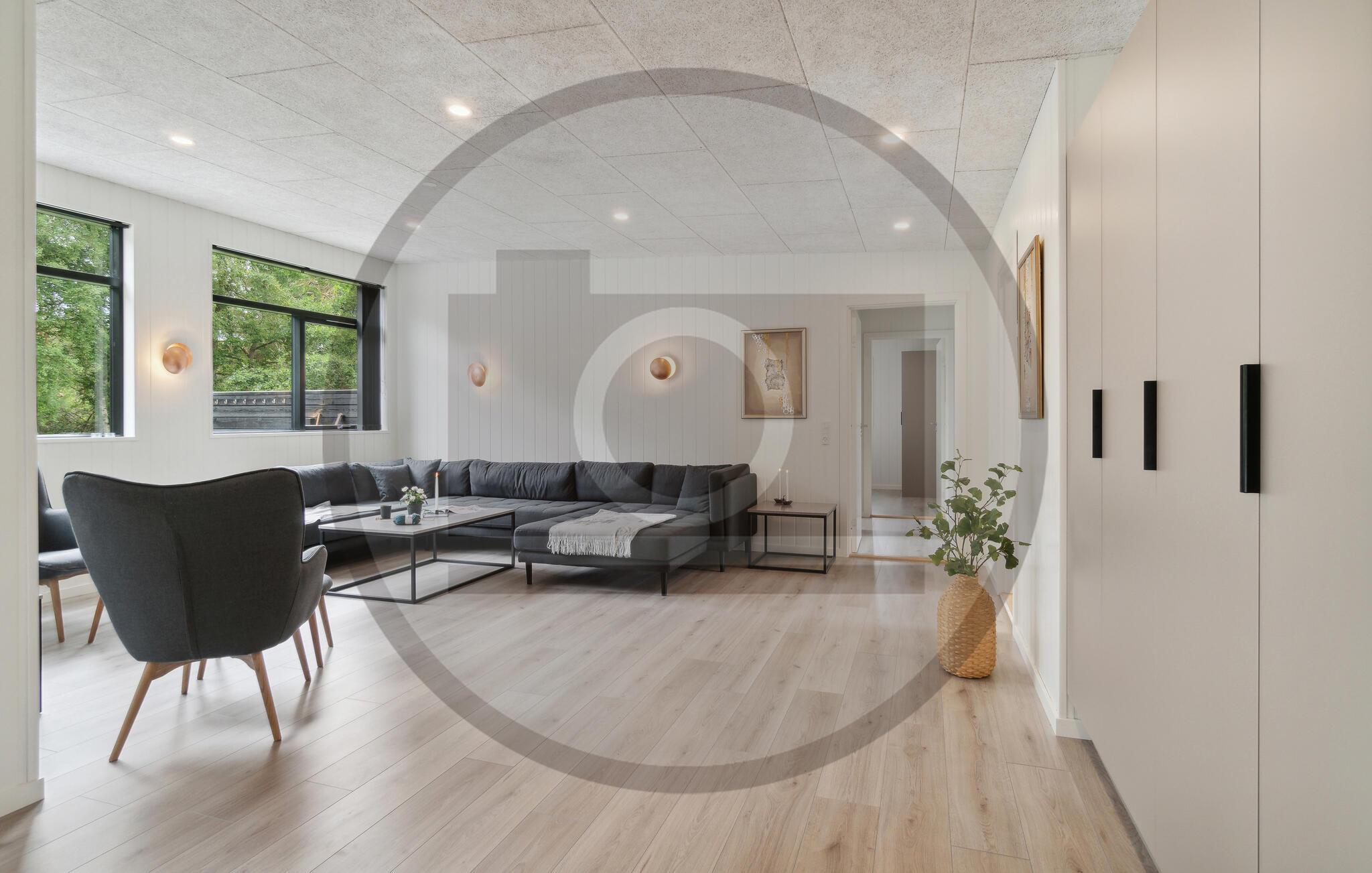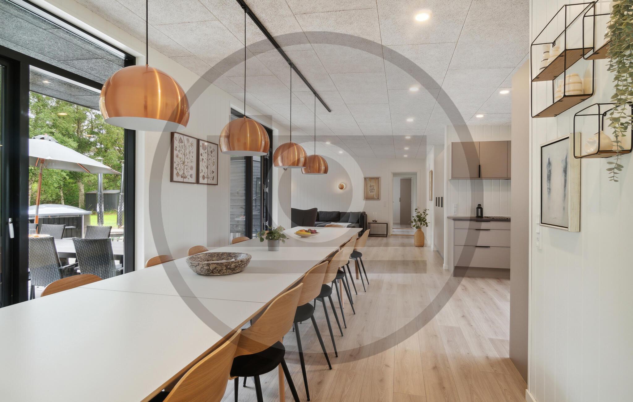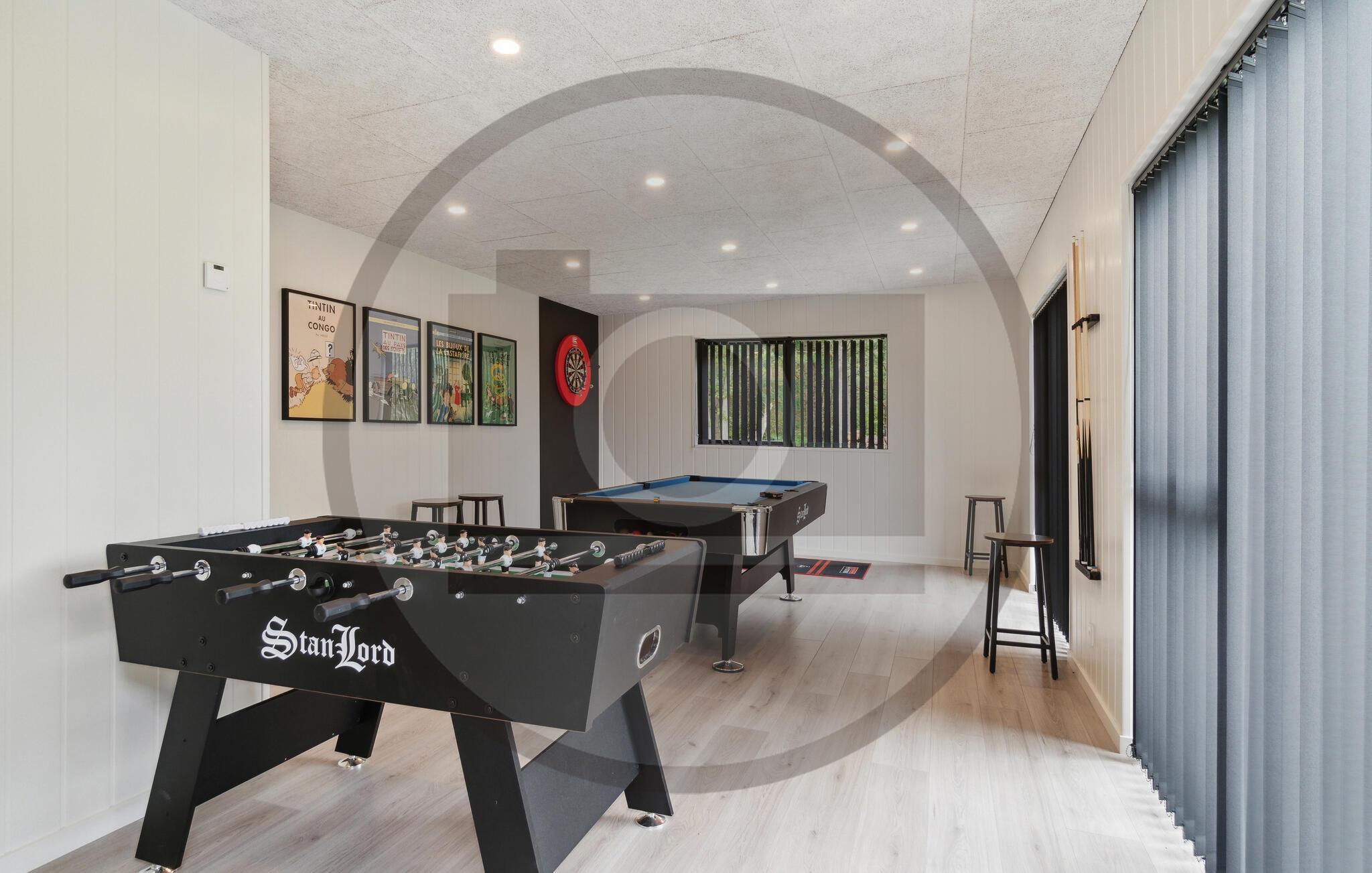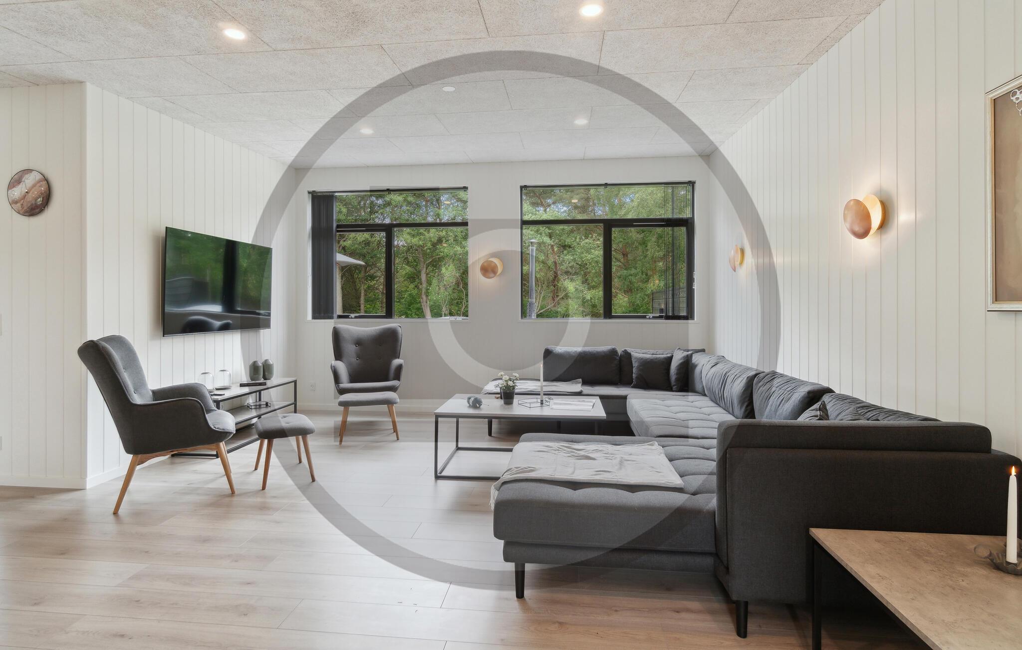 Dette moderne hus imponerer med sine rene linjer og elegante stil. Stuen med de store vinduer byder på en smuk udsigt til haven og indbyder til afslappede stunder på sofaen. I det åbne køkken med det lange spisebord kan I lave mad sammen, snakke og lade dagen runde af med et godt måltid. For afveksling sørger aktivitetsrummet, hvor I kan tilbringe mange timer og spille billard, bordfodbold eller dart.
