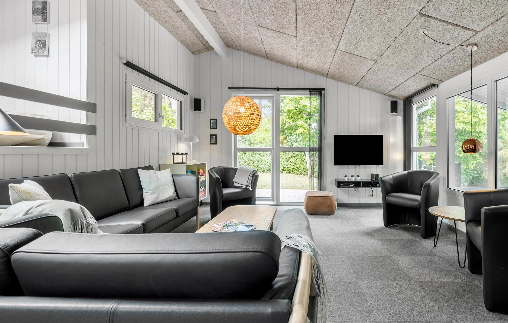 I kan se frem til et dejligt ophold i dette attraktive og moderne hus, som er særdeles velegnet til en ferie med børn. Den høje beliggenhed er med fordel integreret i husets arkitektur, og huset emmer af gode indretningsløsninger. Gulv til loft-vinduerne sørger for en skøn udsigt over haven, mens I hygger jer med indendørsaktiviteter i stuen. I poolrummet kan man pjaske løs i vandet i al slags vejr, og her er der også både børnebassin og sauna. Glæd jer til dagens måltider rundt om det lange spisebord. Herfra fører et par trin op til stuen, hvor I alle sammen kan finde jer godt til rette, mens ilden knitrer i brændeovnen.