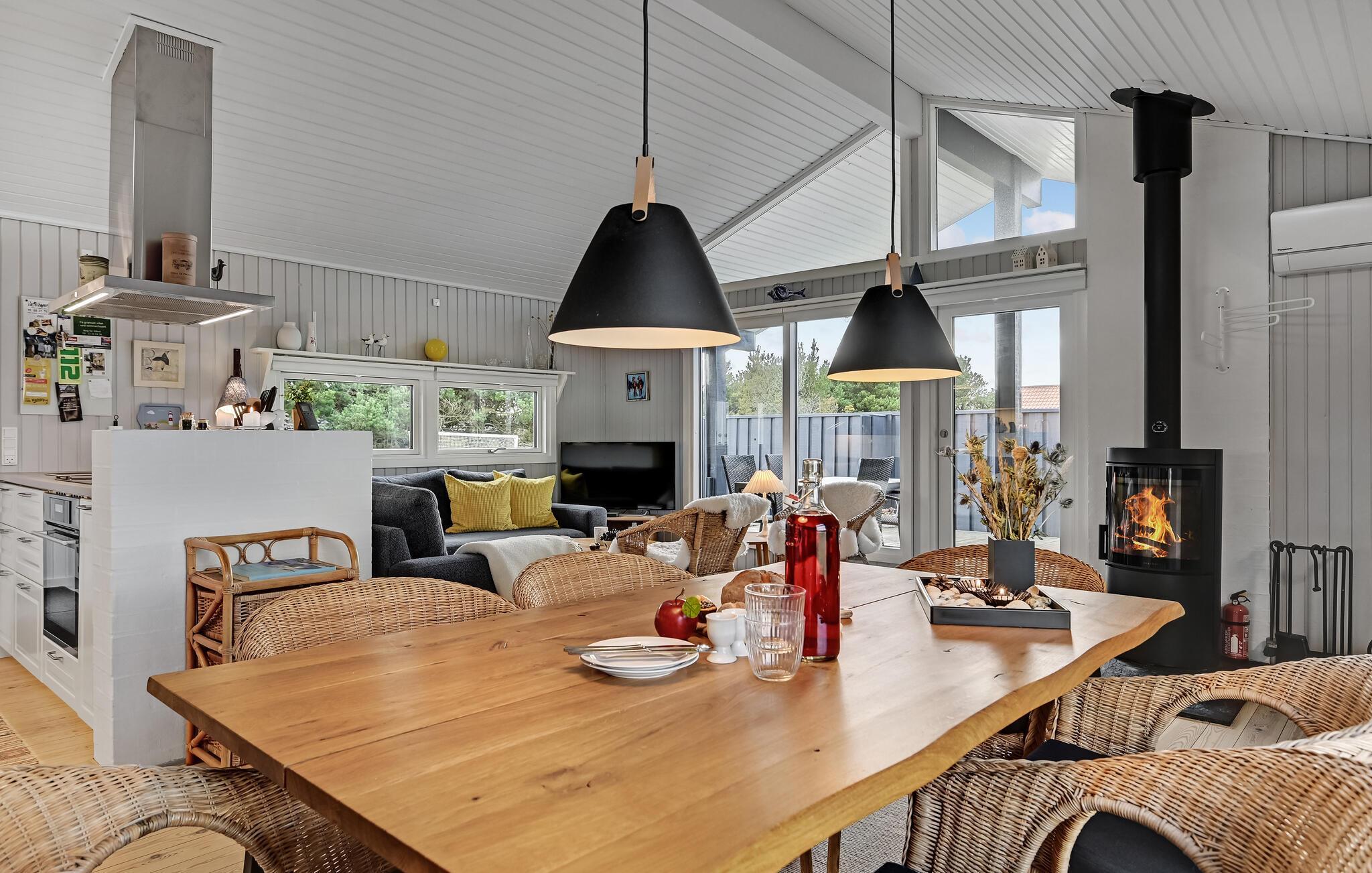 Der er lagt op til nogle skønne dage med hele den store familie eller jeres gode venner, for huset her er en god ramme om nogle rolige dage på Djursland. I kan se frem til en god indretning med de fire soveværelser og et åbent fællesrum, hvor I kan slappe af med hyggelige aktiviteter efter en lang dag på farten. Brændeovnen og de store vinduespartier sørger for, at både de grå efterårsdage og klare forårsdage bliver nydt til fulde. På den store terrasse kan I sidde ugenert med sommerens grillretter og nyde solen, mens børnene sidder i sandskassen eller spiller fodbold på græsplænen.