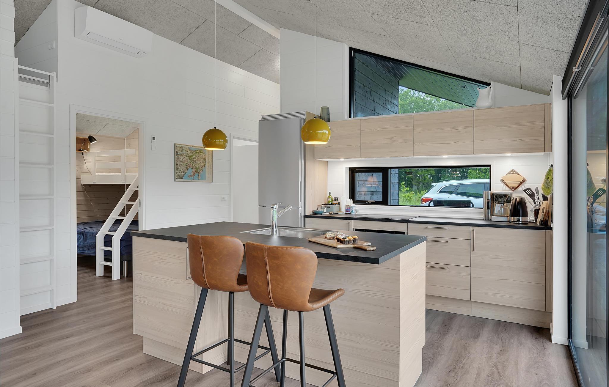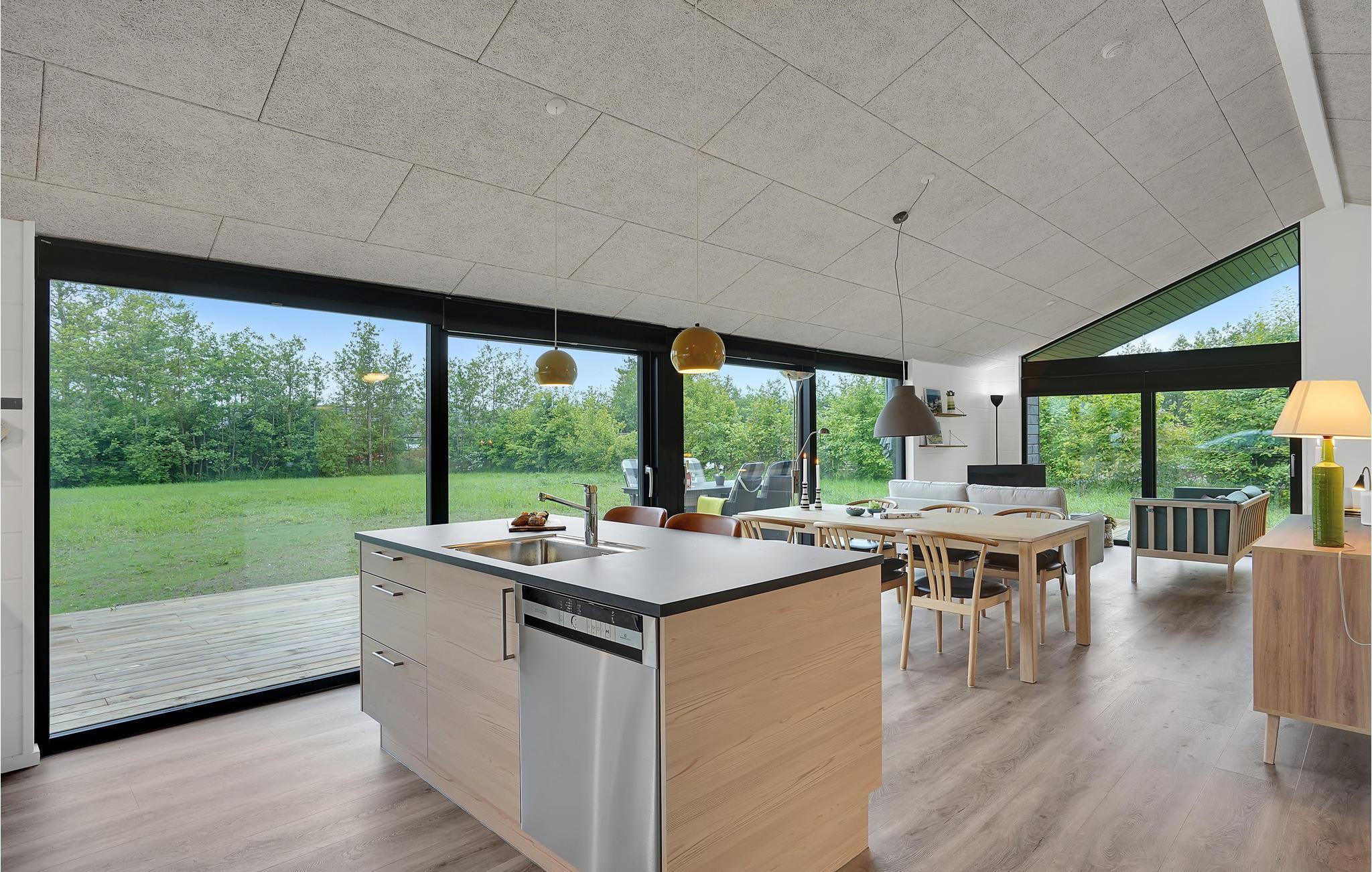 Det moderne træhus er ideelt til 7 personer med et kæledyr, for eksempel en gruppe venner eller en stor familie, der ønsker at holde en afslappende ferie på Djursland sammen. I kommer ind i en åben stue, som er udstyret med store vinduespartier og frem for alt komfortabelt indrettet. På den åbne og delvist overdækkede terrasse med havemøbler kan I samles om en afslappende middag eller nyde en lækker morgenmad, mens I planlægger dagens aktiviteter.