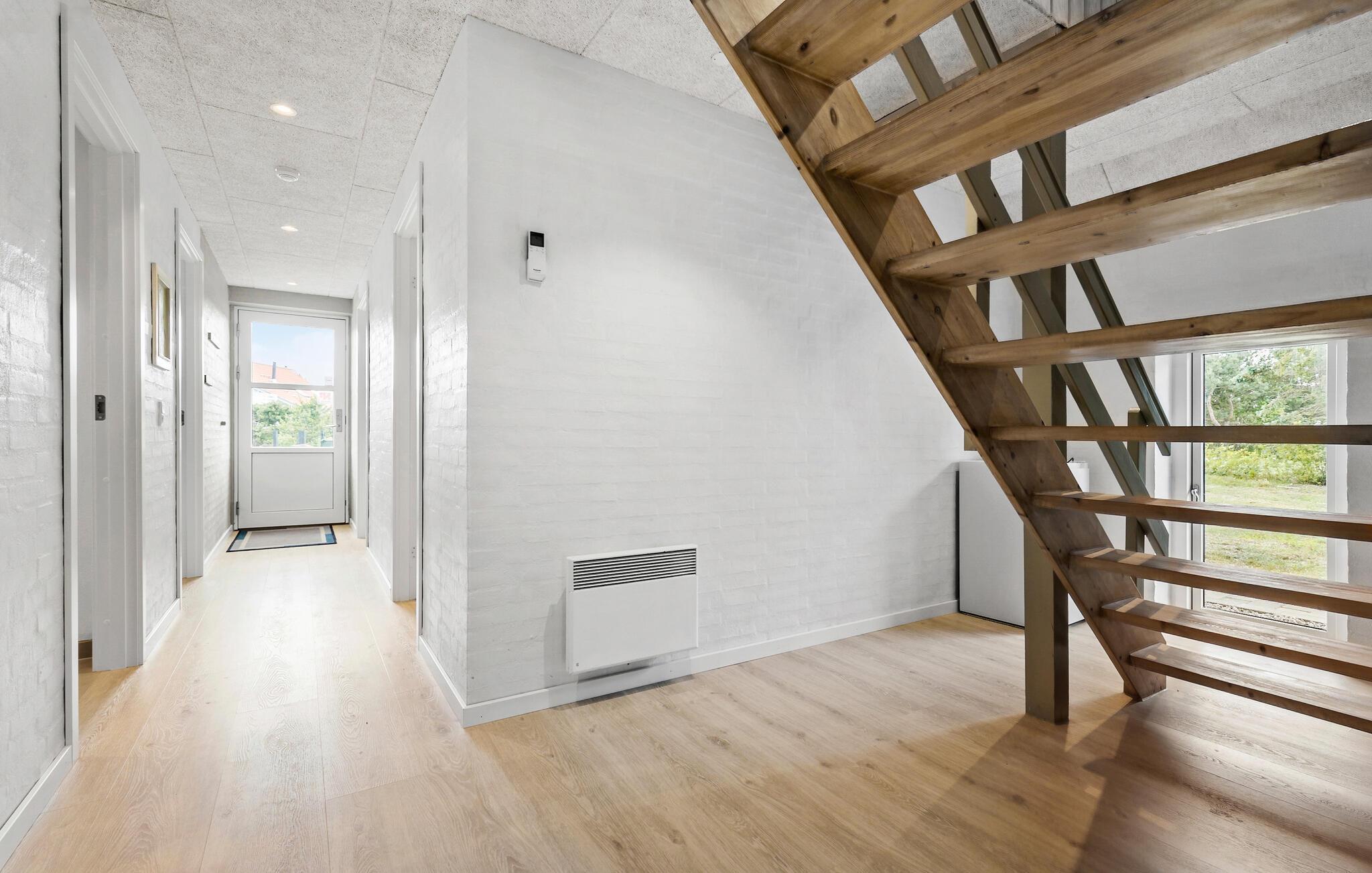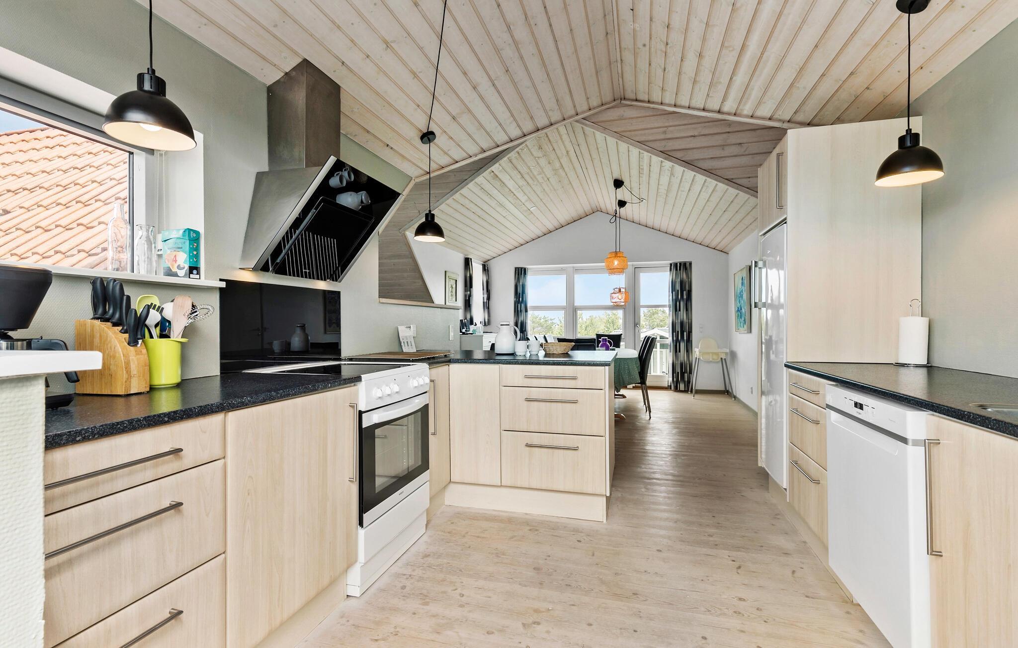 Dette indbydende sommerhus med plads til 10 personer venter jer kun ca. 100 m fra stranden - ideelt hvis I vil tilbringe en ferie med flere familier eller venner nær havet. Huset har alt I behøver for at få en perfekt ferie - et dejligt åbent køkken, hyggelige opholdsstuer, to badeværelser med toilet og bruser og fire dejlige soveværelser. Det dejlige, rummelige køkkenalrum ligger på 1. sal og byder god plads til hele selskabet. Herfra er der også adgang til en overdækket terrasse med fantastisk udsigt over vandet, hvor I kan nyde morgenkaffen eller en god aftente, mens solen går ned.