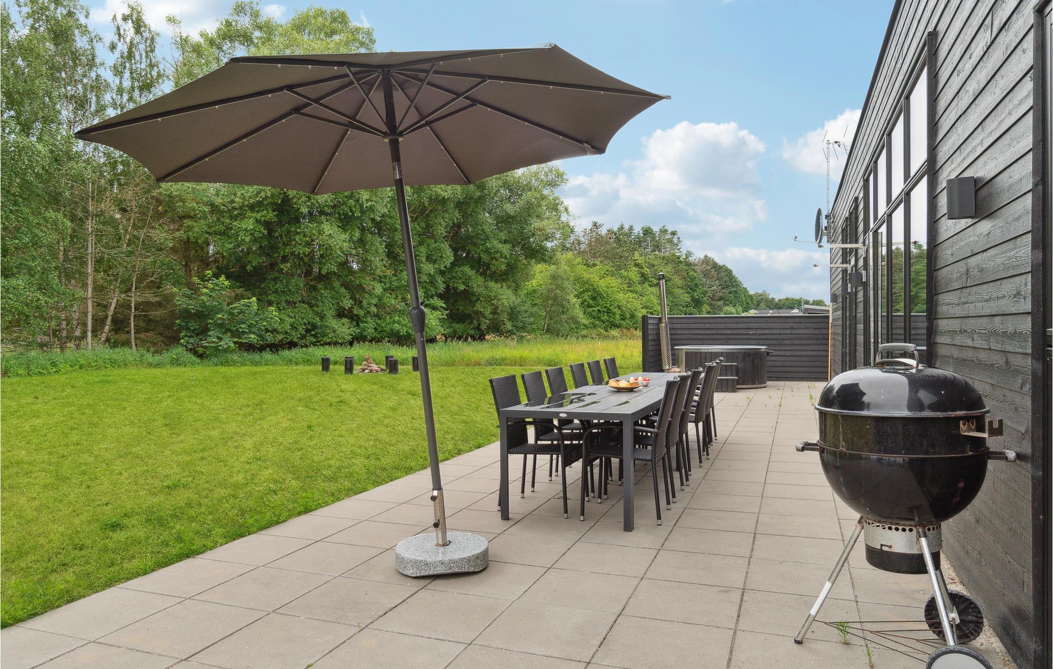 Huset er moderne og indrettet i skandinavisk stil og giver masser af plads til en vellykket ferie med familien og jeres kæledyr. I den kombinerede stue og spisestue med åbent køkken kan I samles rundt om det store spisebord til hyggelige aftener foran tv'et eller til måltider. Takket være aktivitetsrummet med billard, bordtennis og dart bliver det bestemt ikke kedeligt.