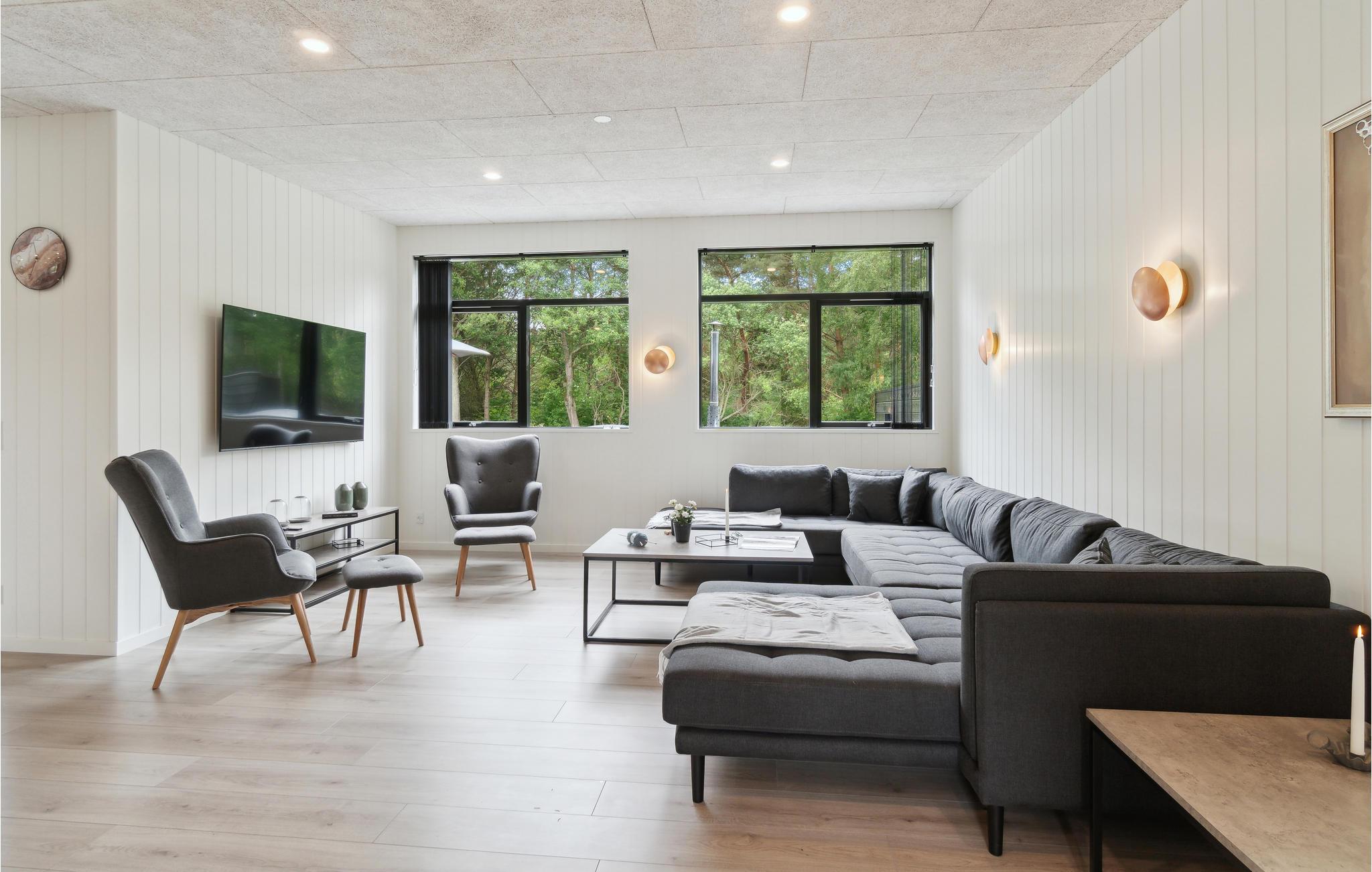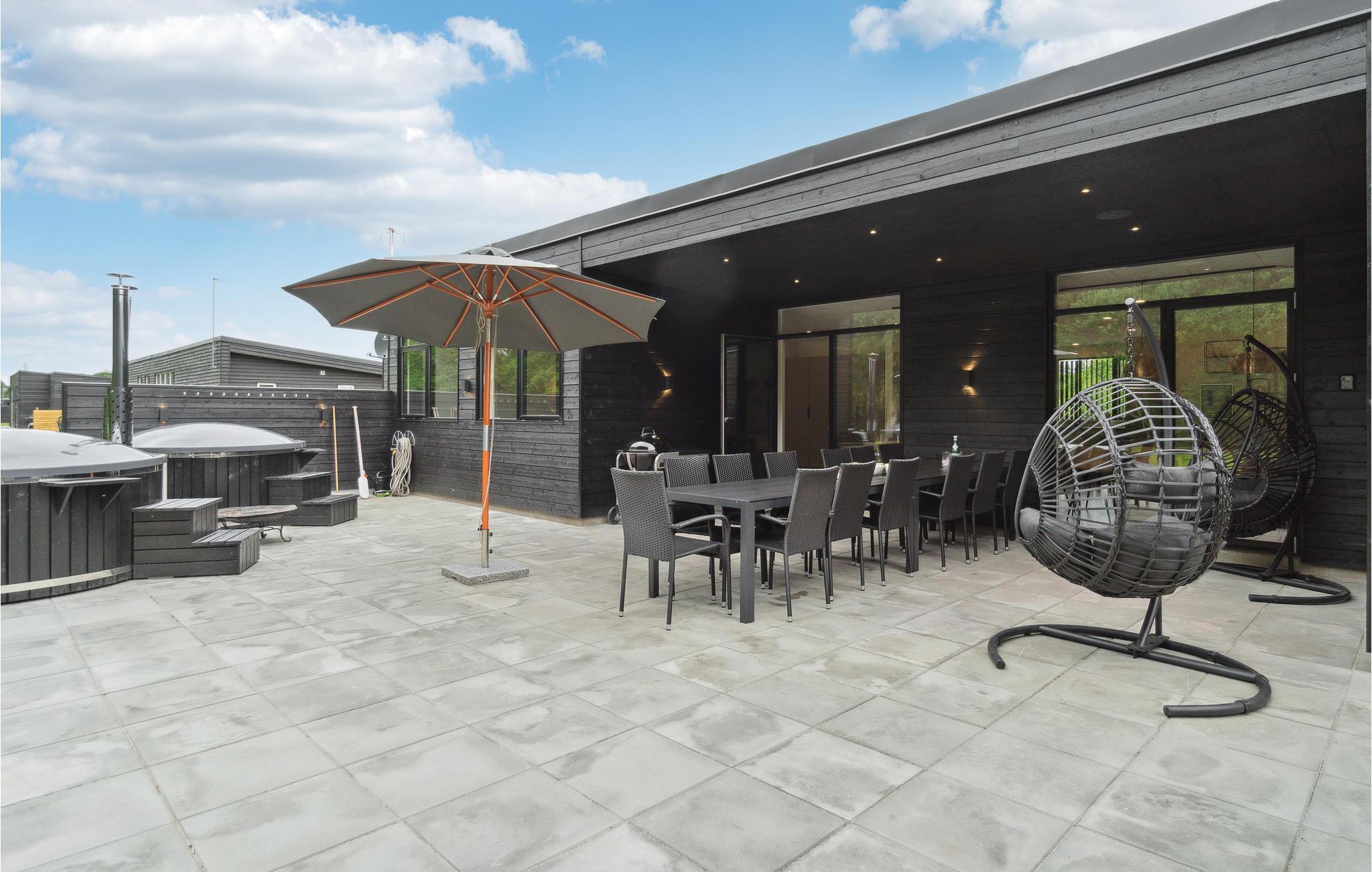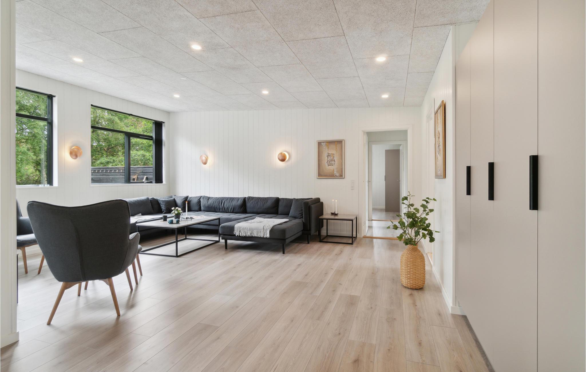 Stort sommerhus ved Fjellerup med vildmarksbad, aktivitetsrum og stor terrasse til familieferie.