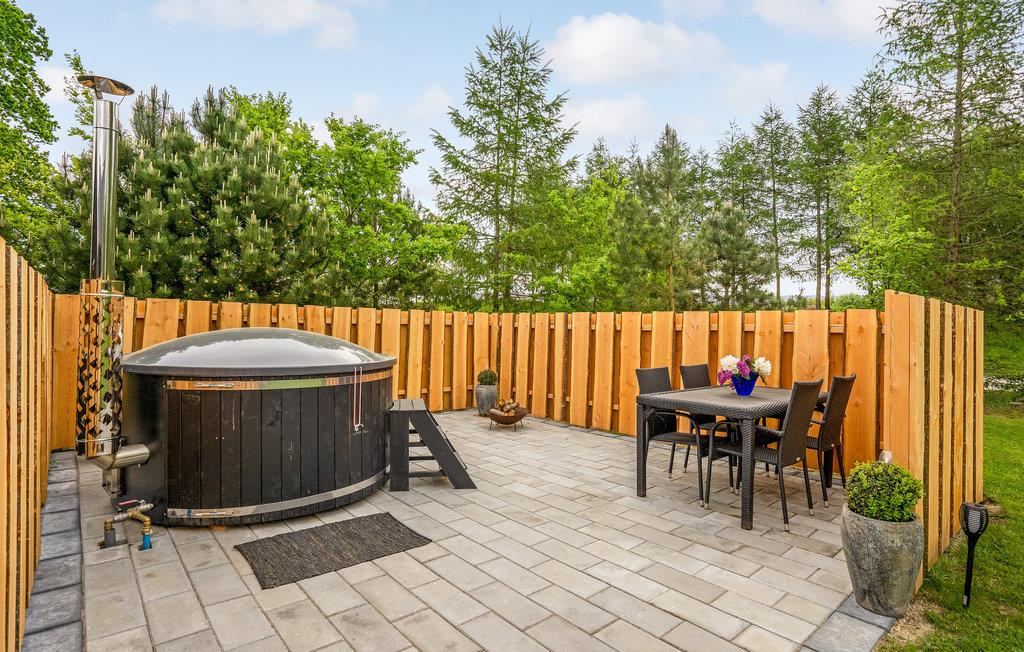 Huset er lyst og venligt indrettet og fra køkken/alrummet er der udgang til den delvis overdækkede terrasse med vildmarksbad.