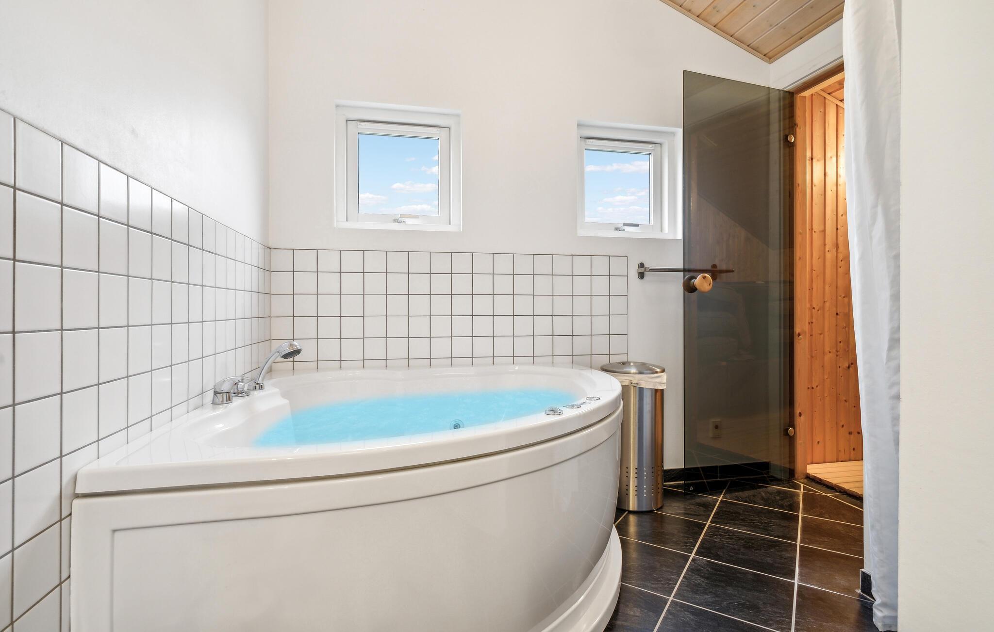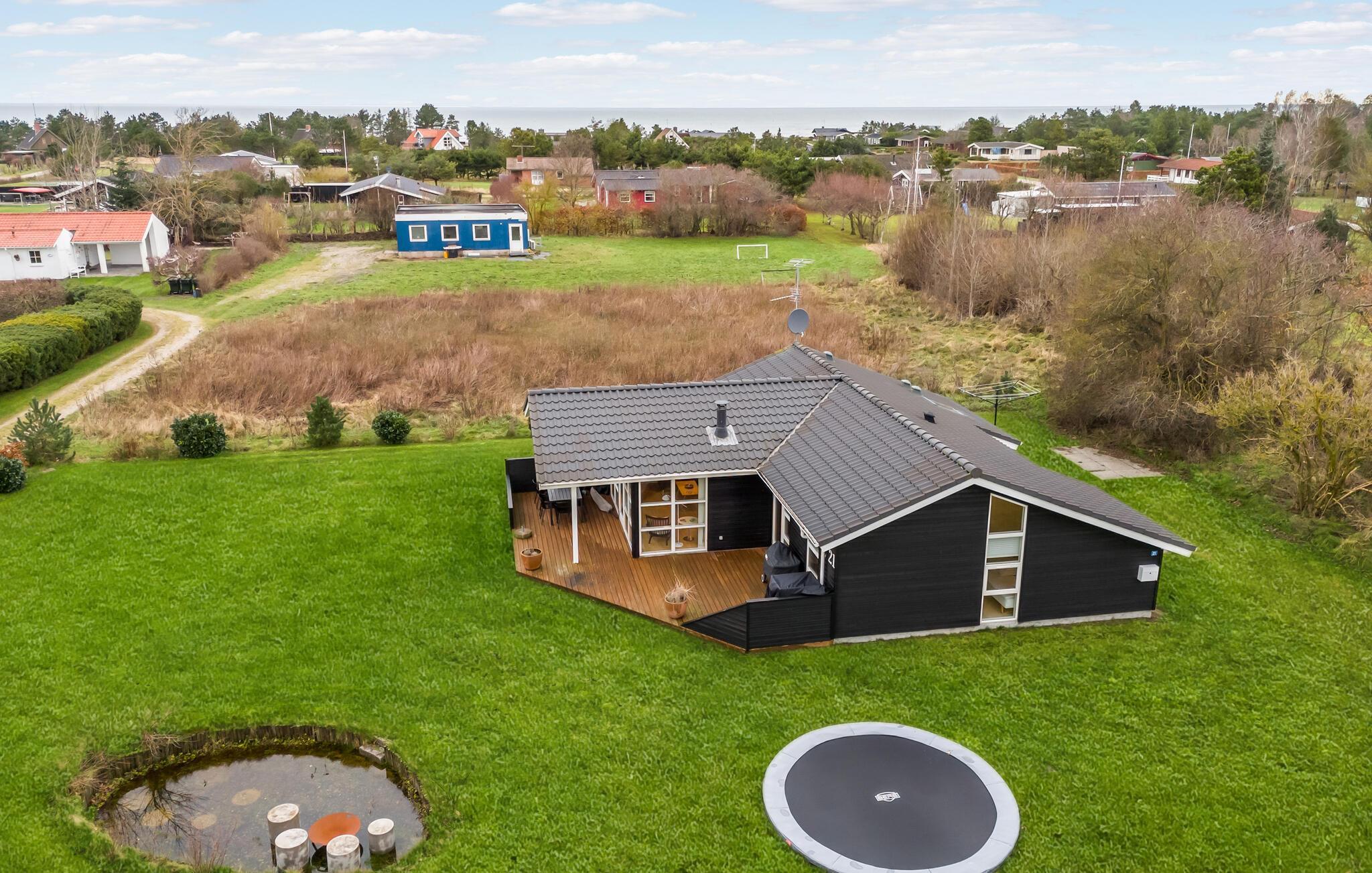 Hyggeligt feriehus i Fjellerup med sauna, spabad og trampolin tæt på børnevenlig strand.