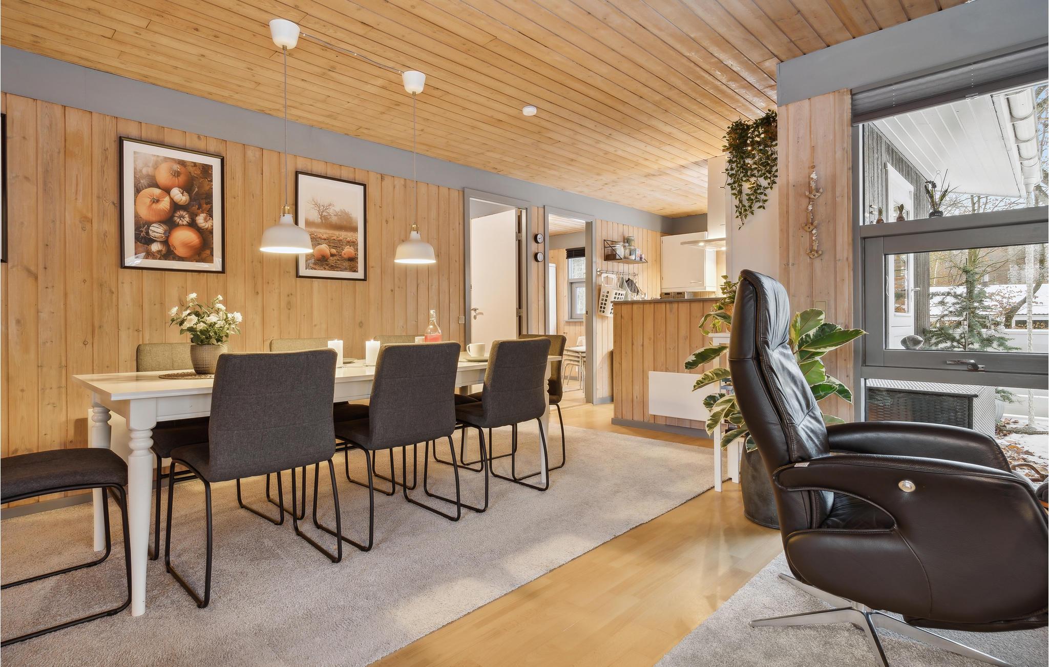 Velkommen til dette indbydende sommerhus i Fjellerup, som ligger ud til store skove og tæt på stranden. Det store køkken-alrum er klassisk og enkelt indrettet med moderne boligløsninger. Fyld dagene med hyggelige aktiviteter, find sammen om et brætspil ved spisebordet, giv jer i kast med hyggelige madprojekter og bliv siddende lidt længere efter måltiderne. Der er mange sovepladser, så huset har god plads til en stor familie, også i den brede sofa og på den indhegnede terrasse i sommersæsonen. På den store naturgrund er der carport, gynger og sandkasse, så de små kommer heller ikke til at kede jer.