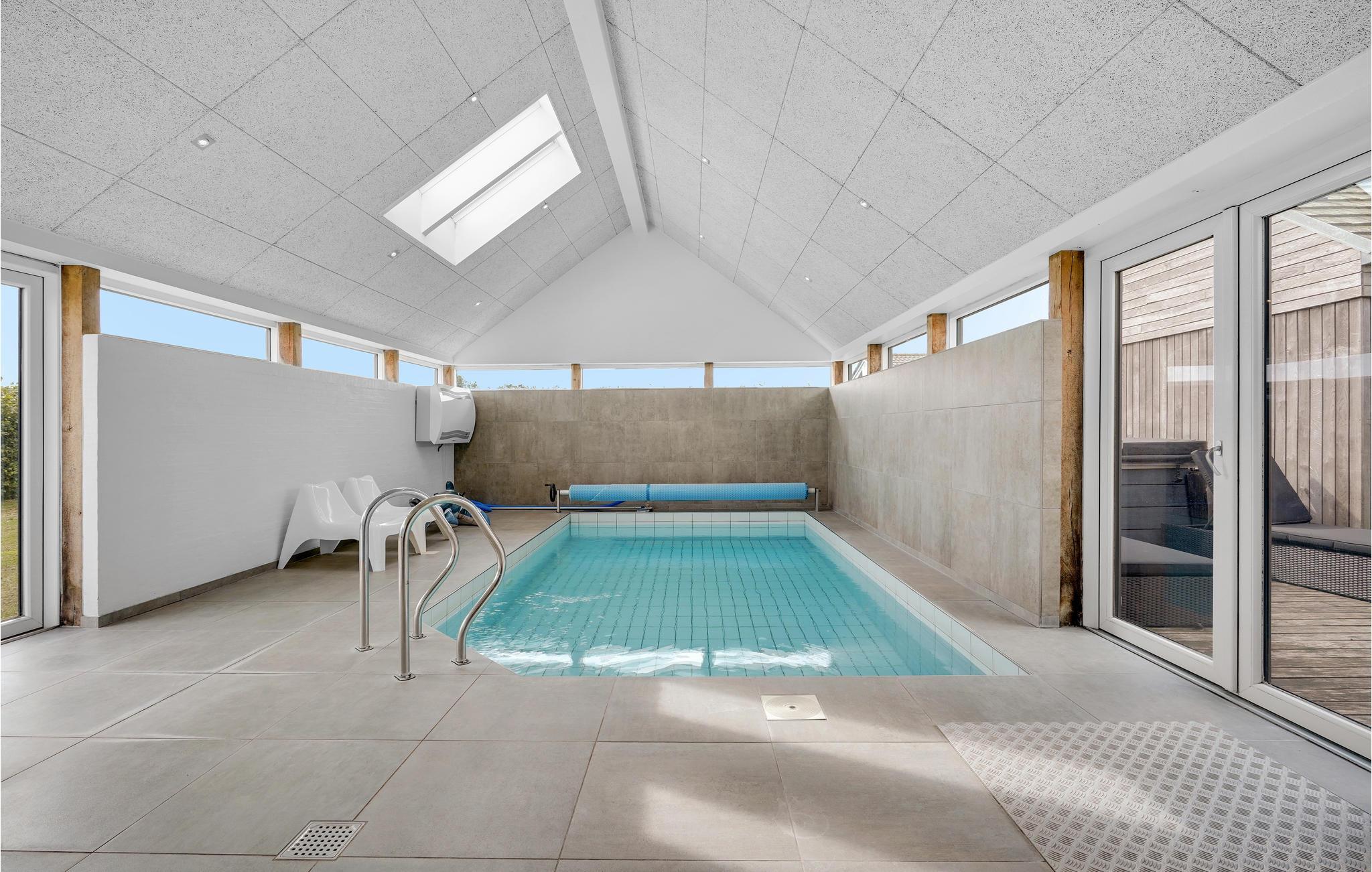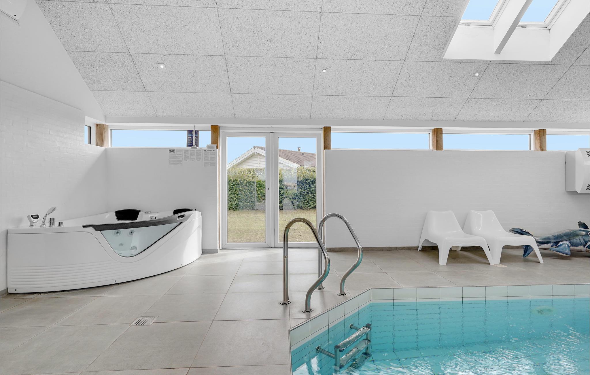 Pragtfuldt og lyst feriehus med indendørs pool og spa ved Flovt strand, perfekt til aktiv ferie og afslapning.