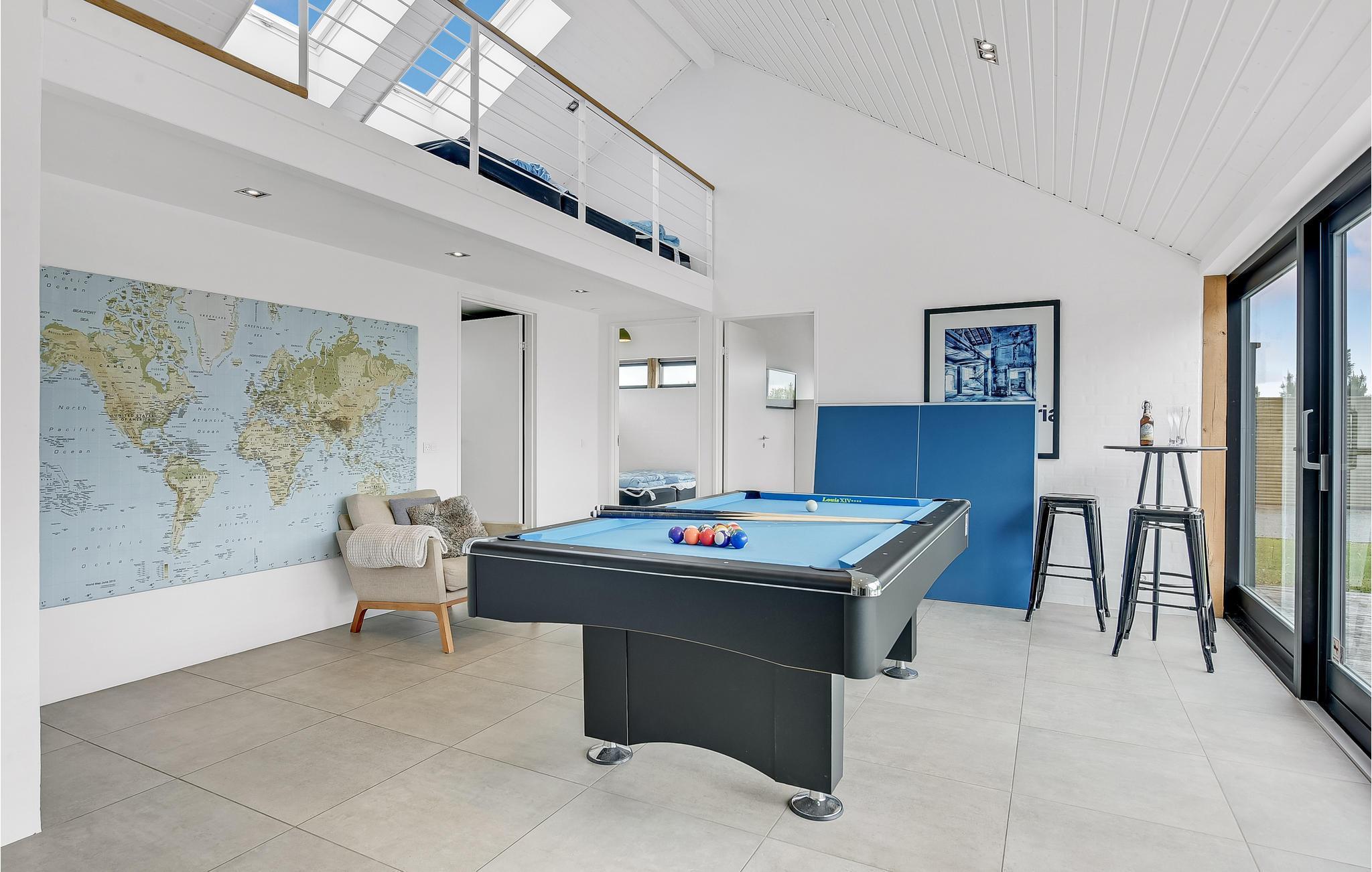 Moderne feriehus tæt på Flovt Strand med poolbord, sauna og spabad for aktive og afslappende ferier.