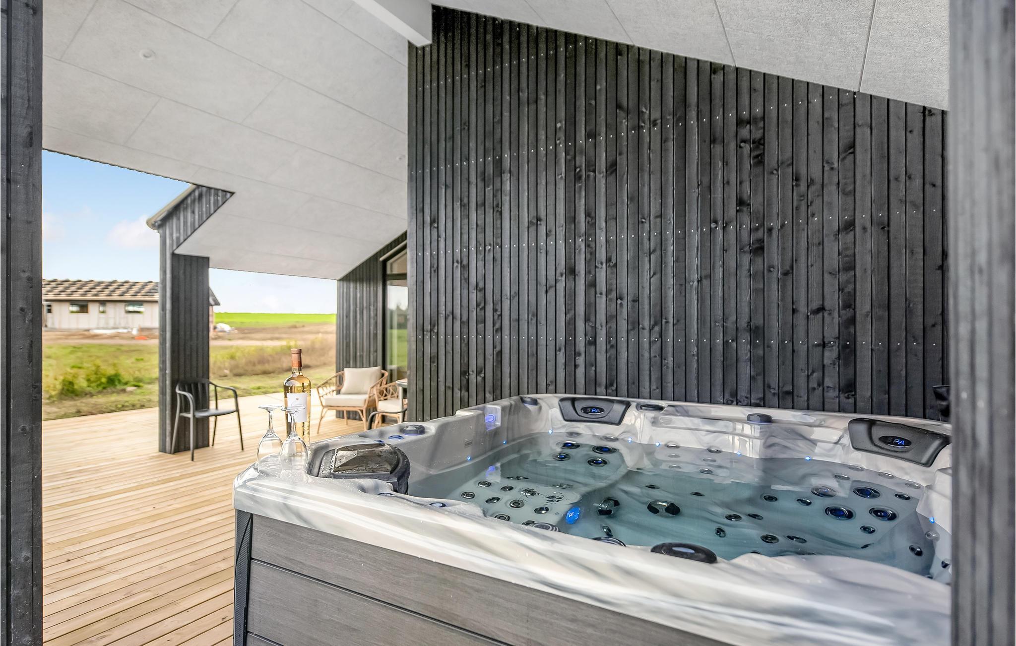 Behageligt sommerhus med indendørs og udendørs jacuzzi til en afslappende ferie.