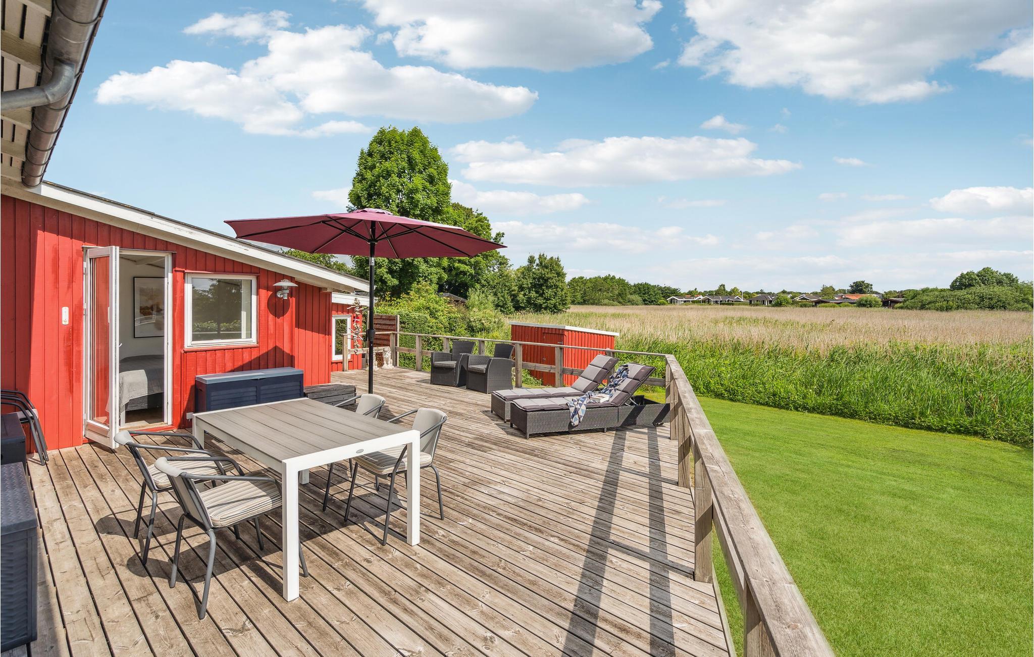 Hyggeligt feriehus ved Flovt Strand med havudsigt, stor terrasse og tæt på sandstrand.