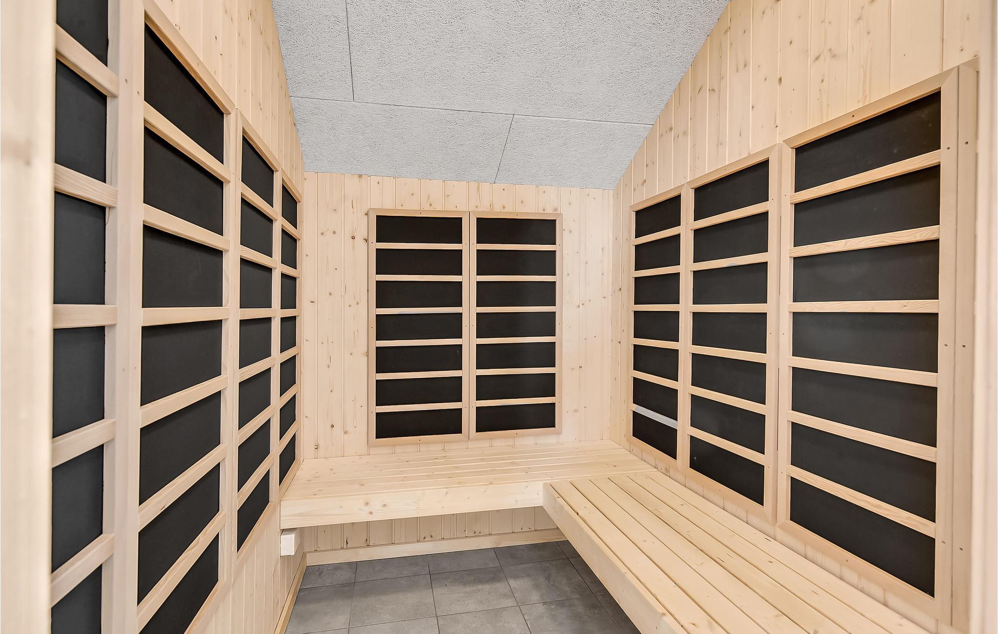 Wellness-feriehus ved Flovt Strand med udendørs spabad, sauna og aktivitetsrum for en aktiv og afslappende ferie.