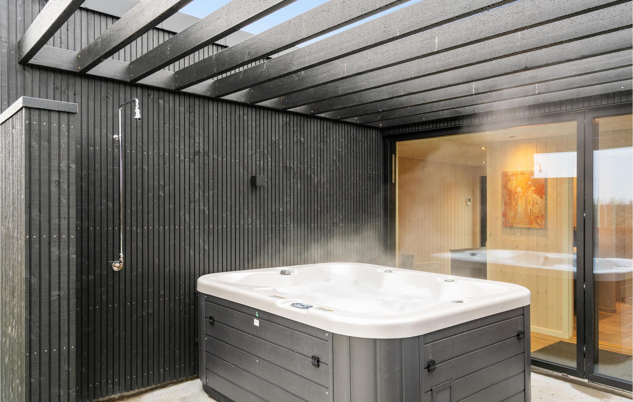 Udenfor venter en stor og solrig terrasse med liggestole, hvor du kan tilbringe mange behagelige timer i den friske luft. Et højdepunkt er spabadet til 5 personer, hvor du kan se frem til ren afslapning udenfor og i det varme vand.