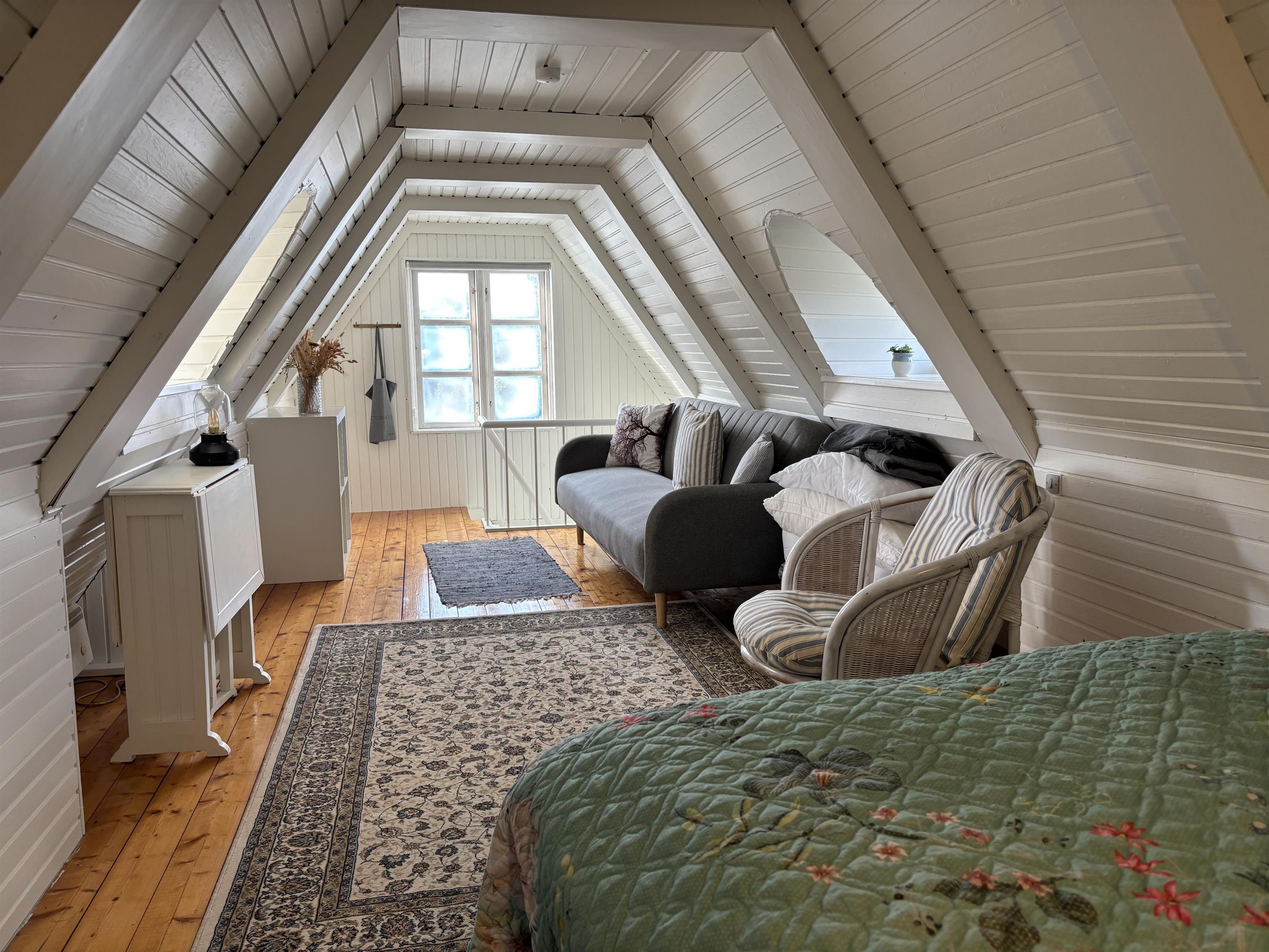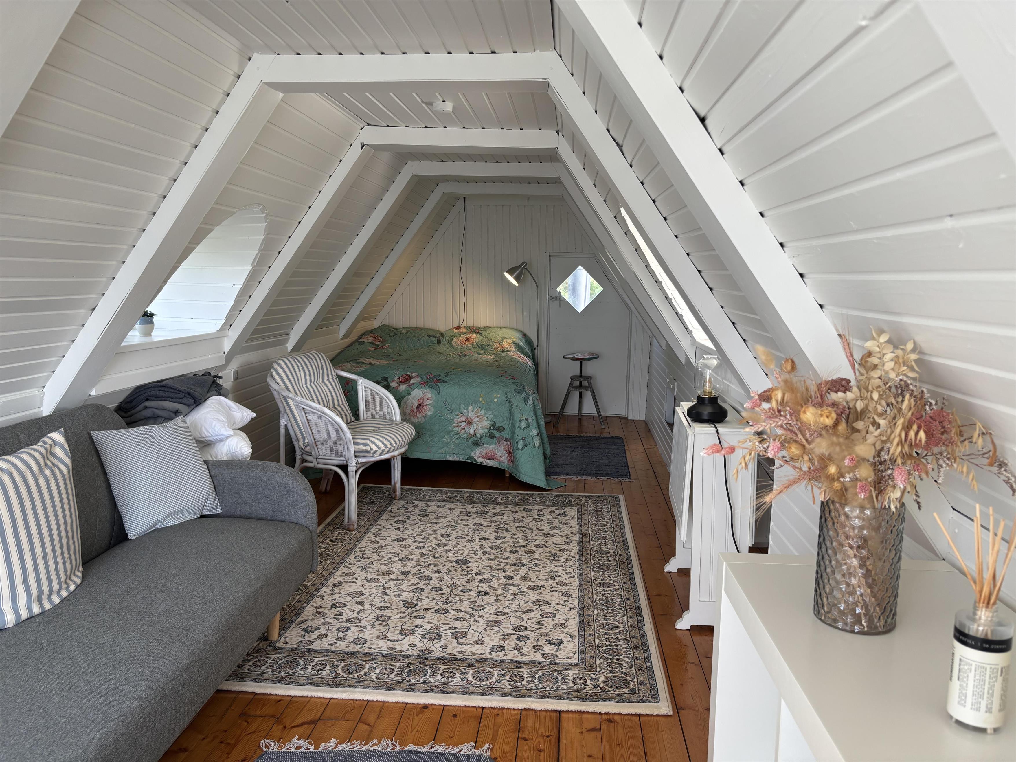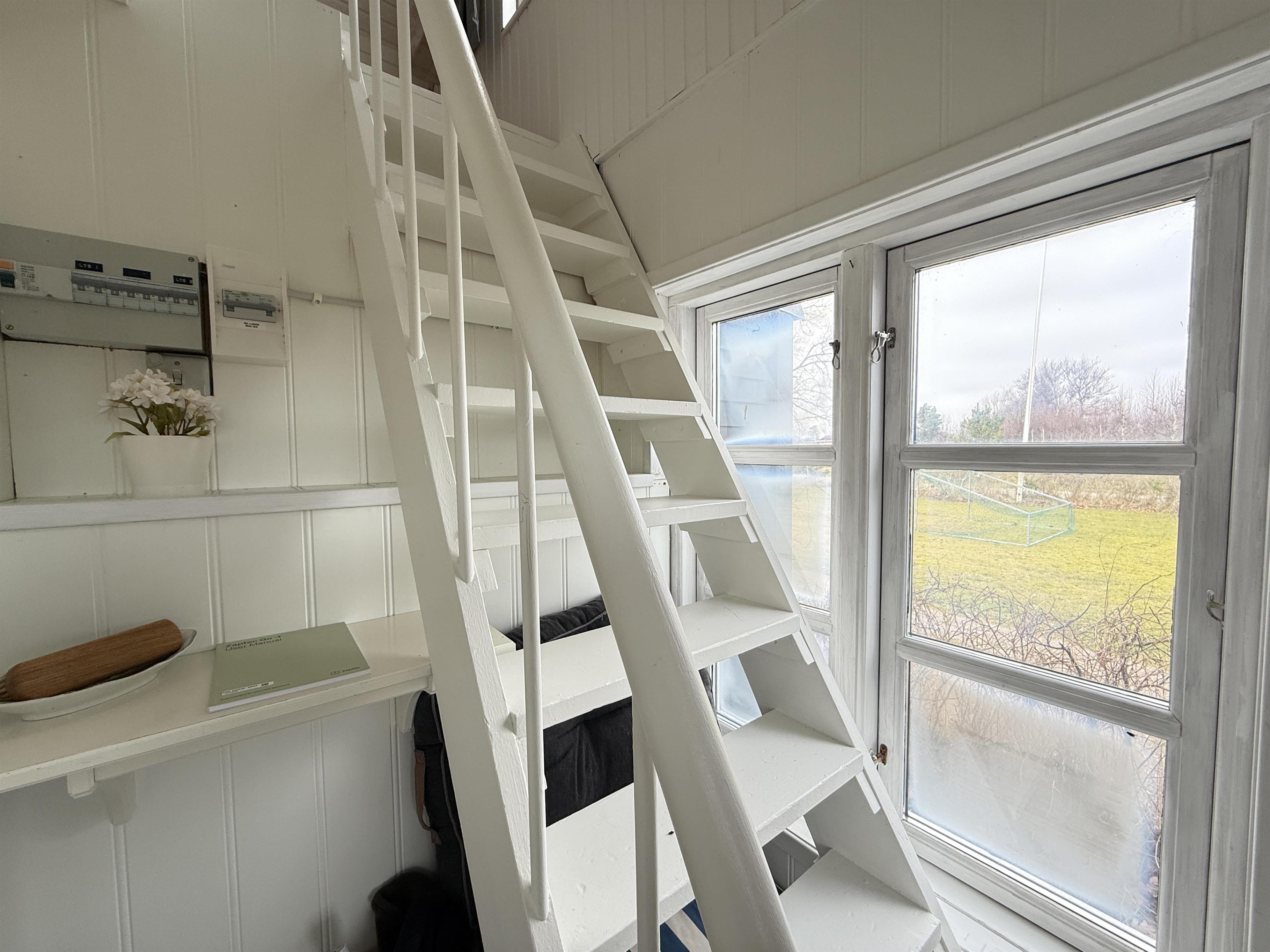 En forholdsvis stejl trappe fører op til overetagen, hvor pladsen er optimalt udnyttet med en 3/4-seng i den ene ende og en sovesofa i den anden.