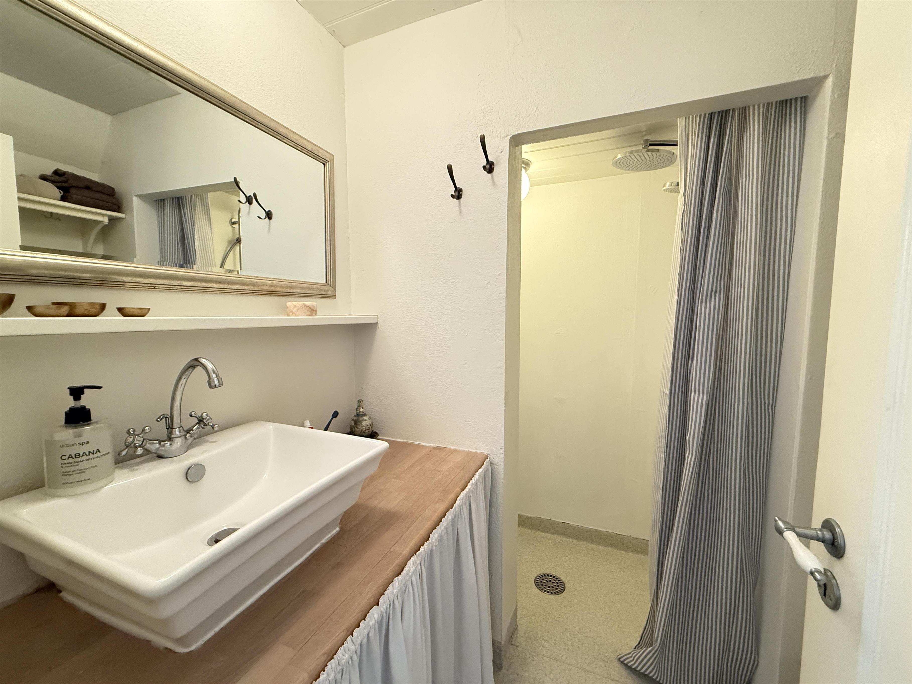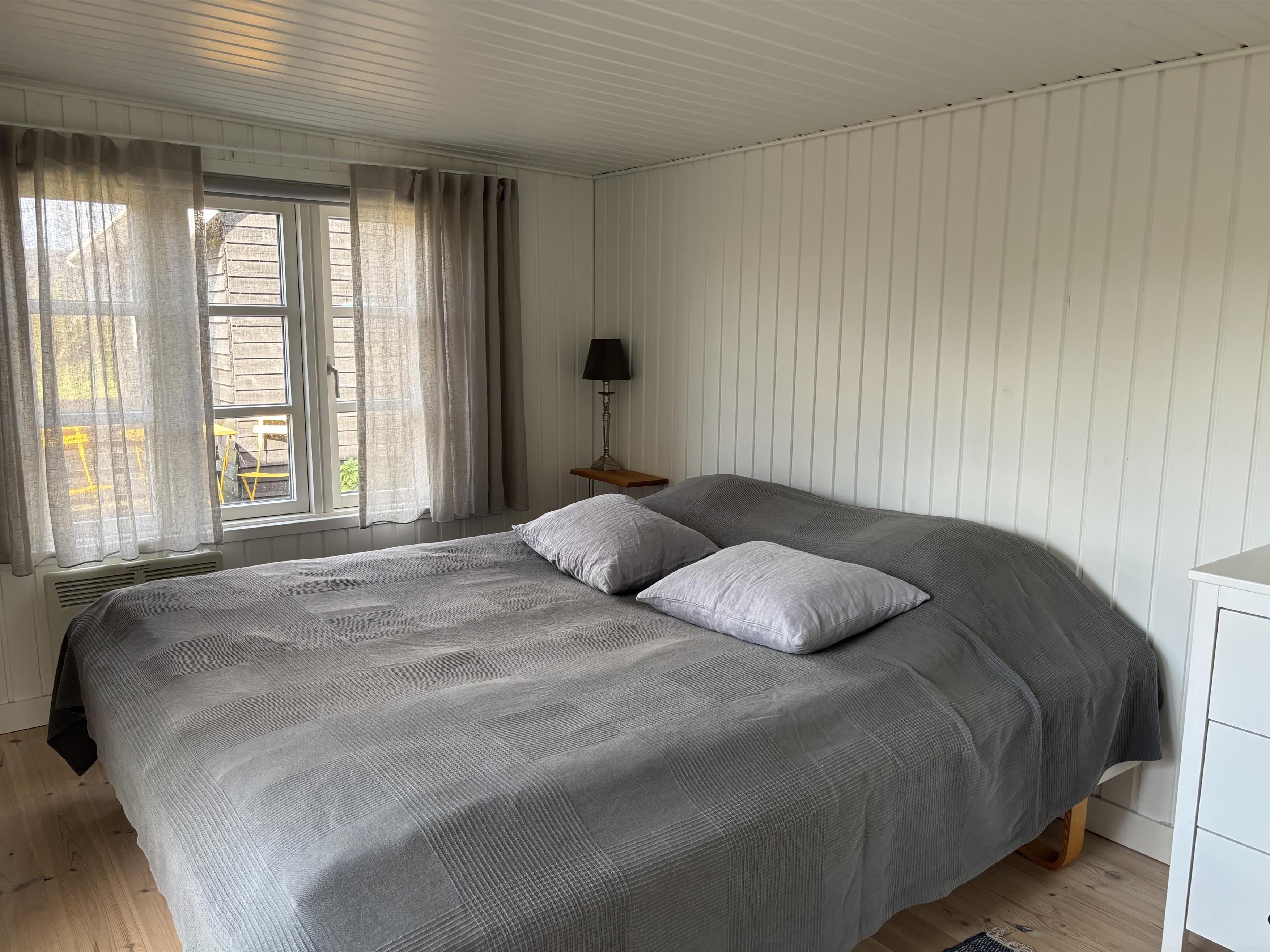Sommerhuset er romantisk og funktionelt indrettet, med et rummeligt alrum, hvor spiseplads og sofaområde skaber en hyggelig atmosfære – ideelt til samvær efter en dag på stranden. I stueetagen finder du desuden et soveværelse med dobbeltseng samt et mindre, men fuldt funktionelt badeværelse med bruseniche.