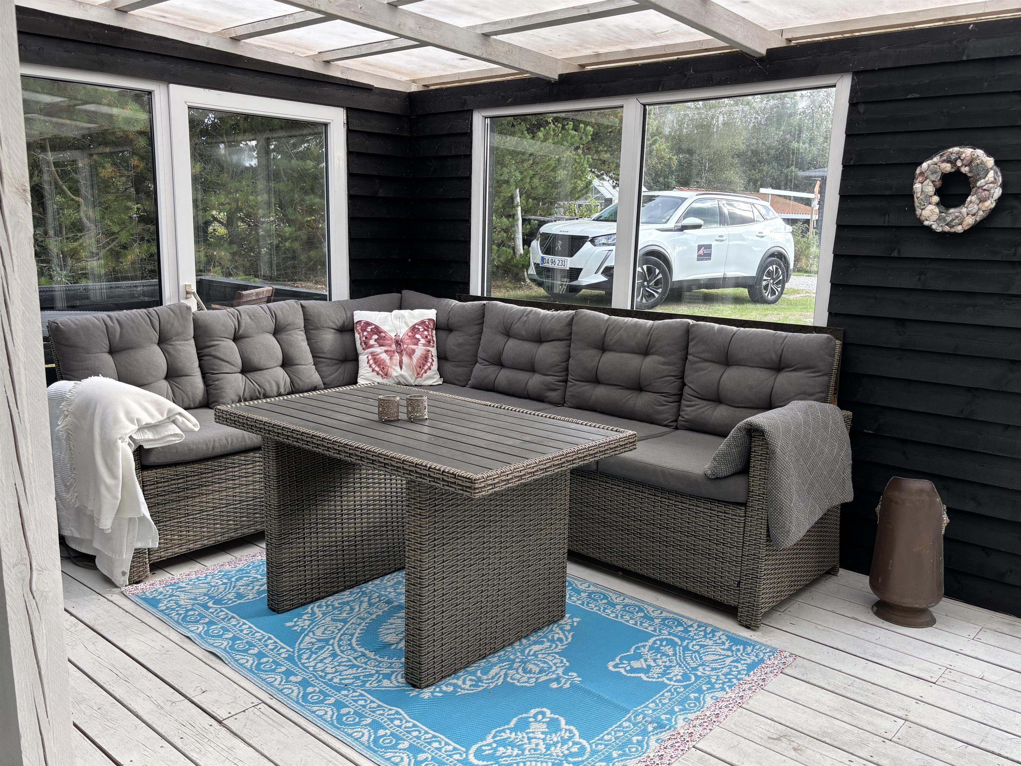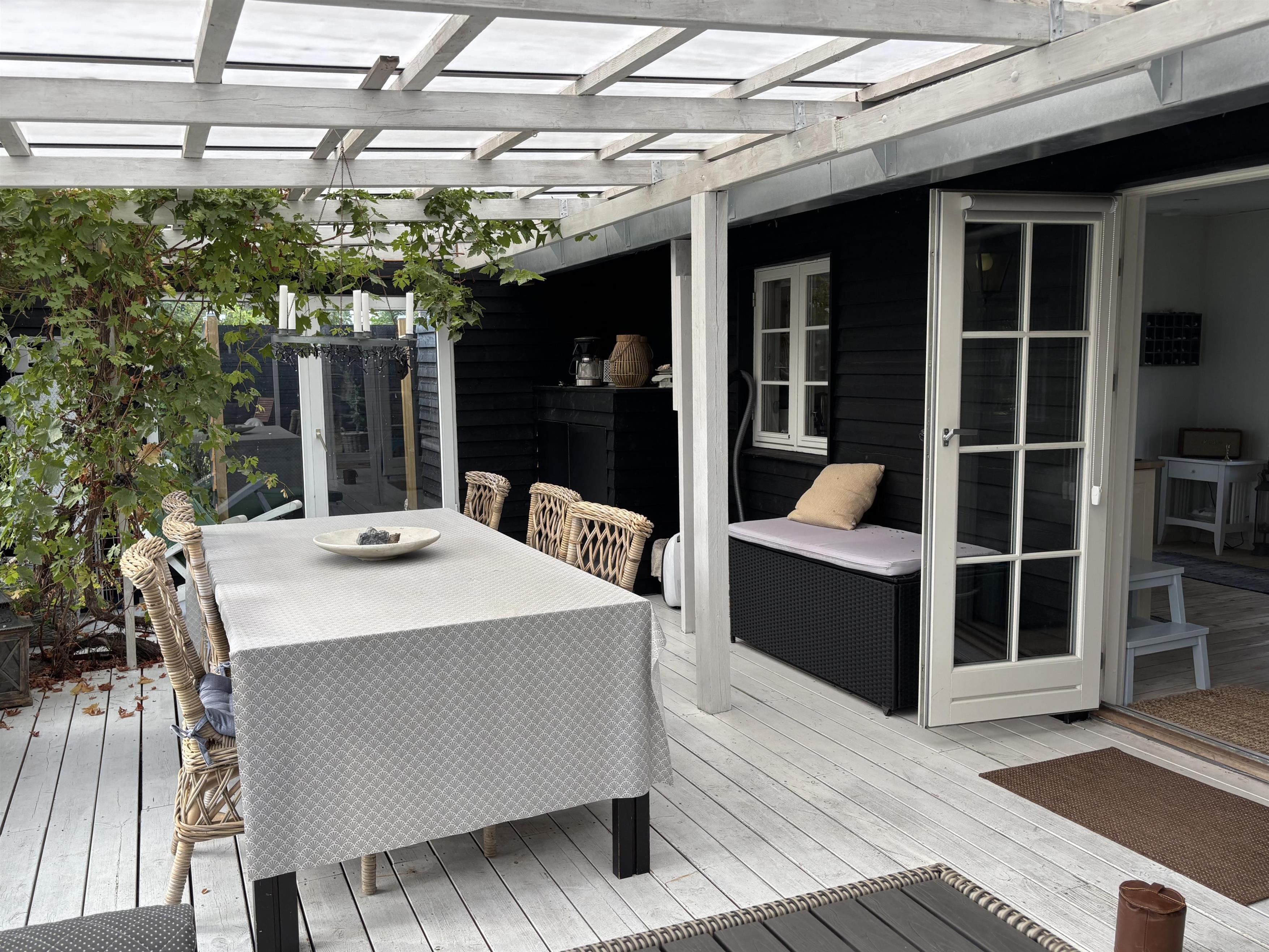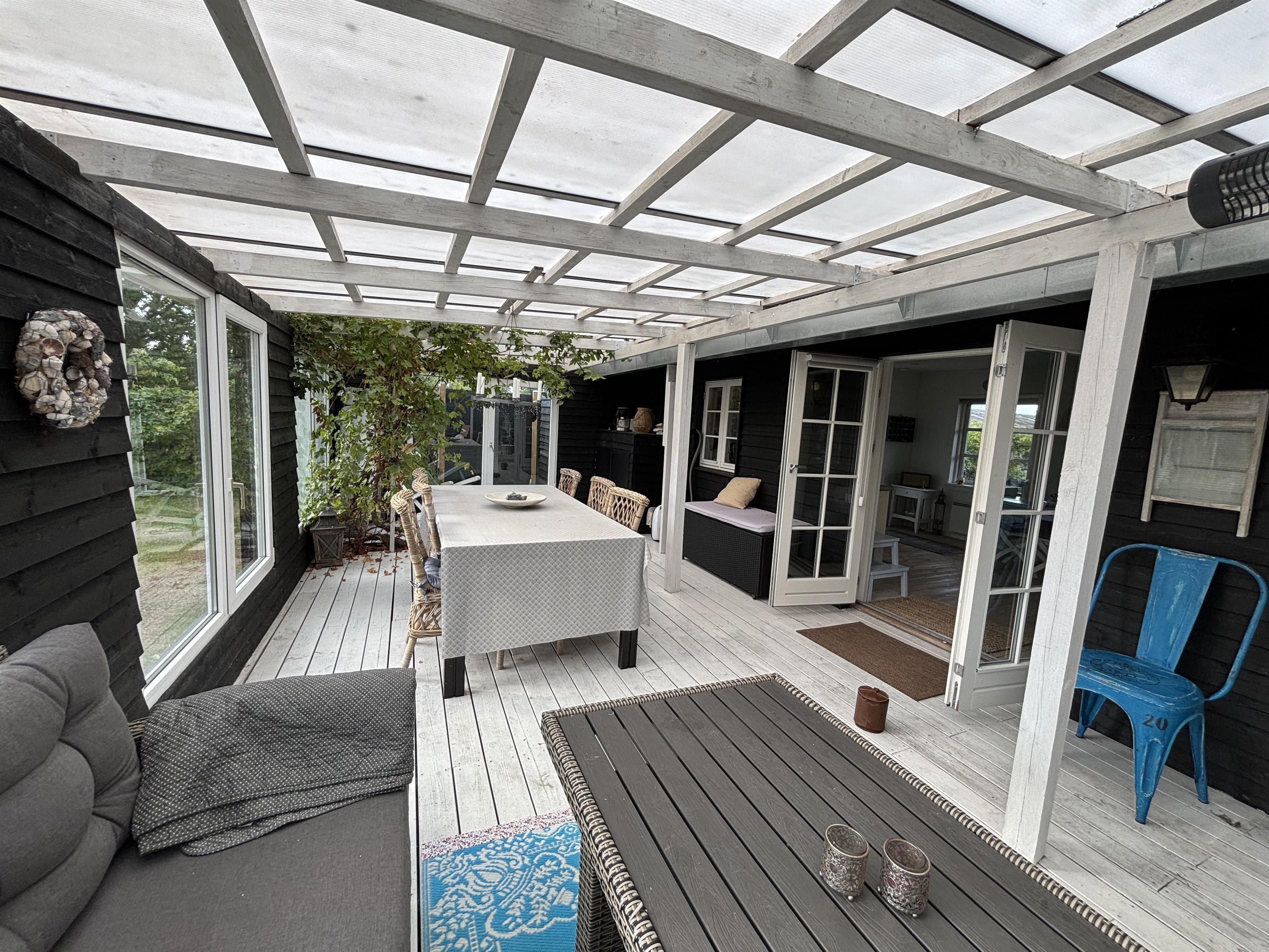Fra stuen træder du ud i en skøn, lys udestue med spiseplads til 6 personer. Her kan familien nyde lange sommeraftener, hygge sig med brætspil eller slappe af i loungesofaen med en god bog. Den frodige vinduesplante, der slynger sig op langs taget, skaber en helt særlig stemning.