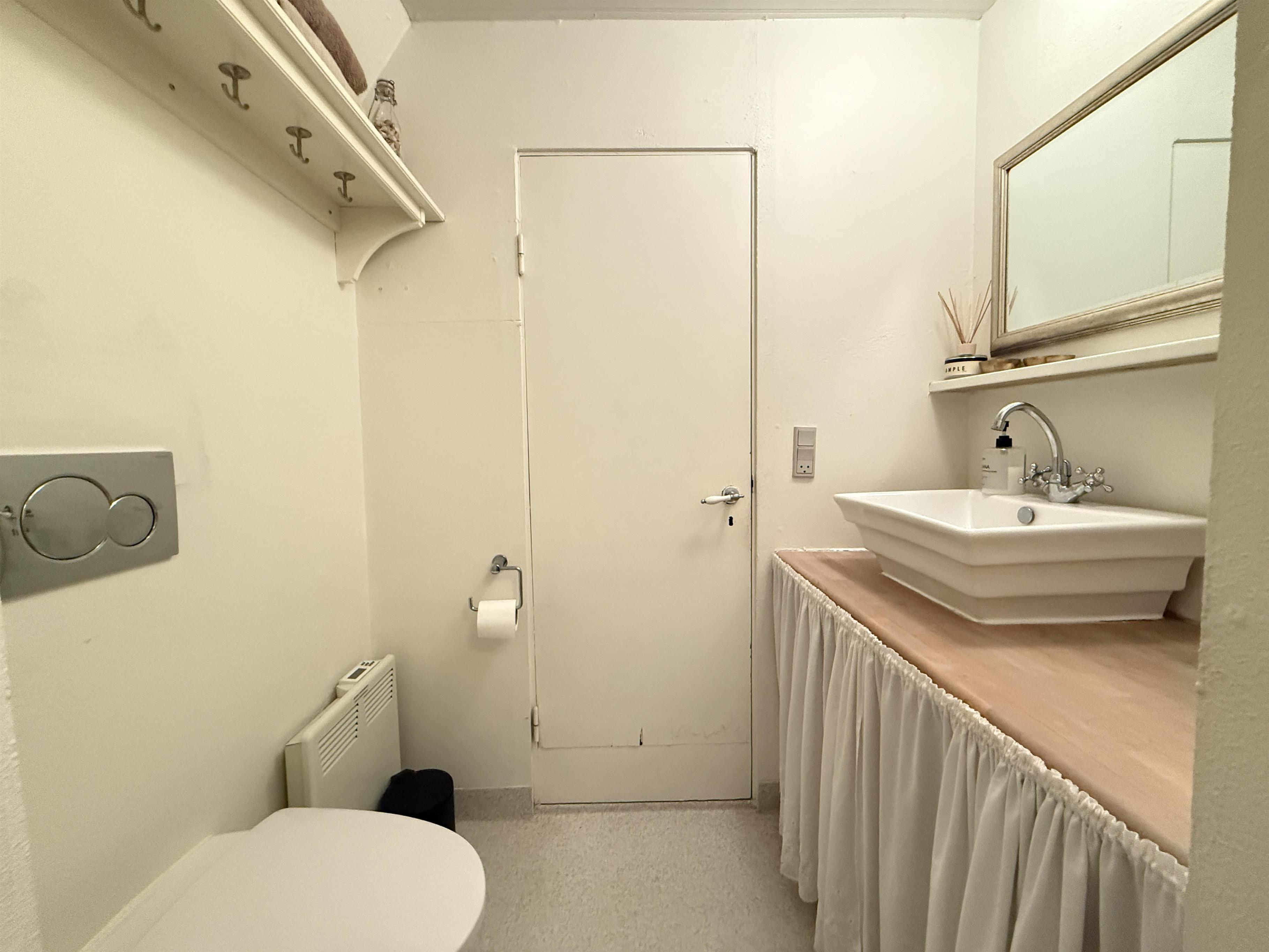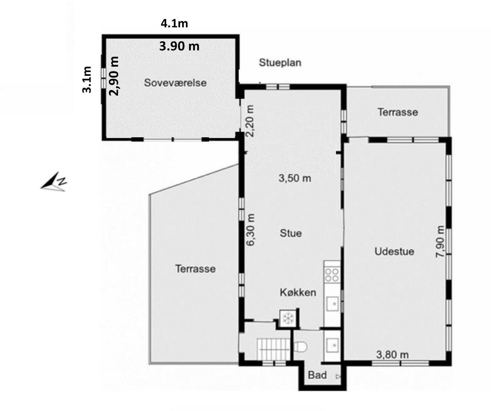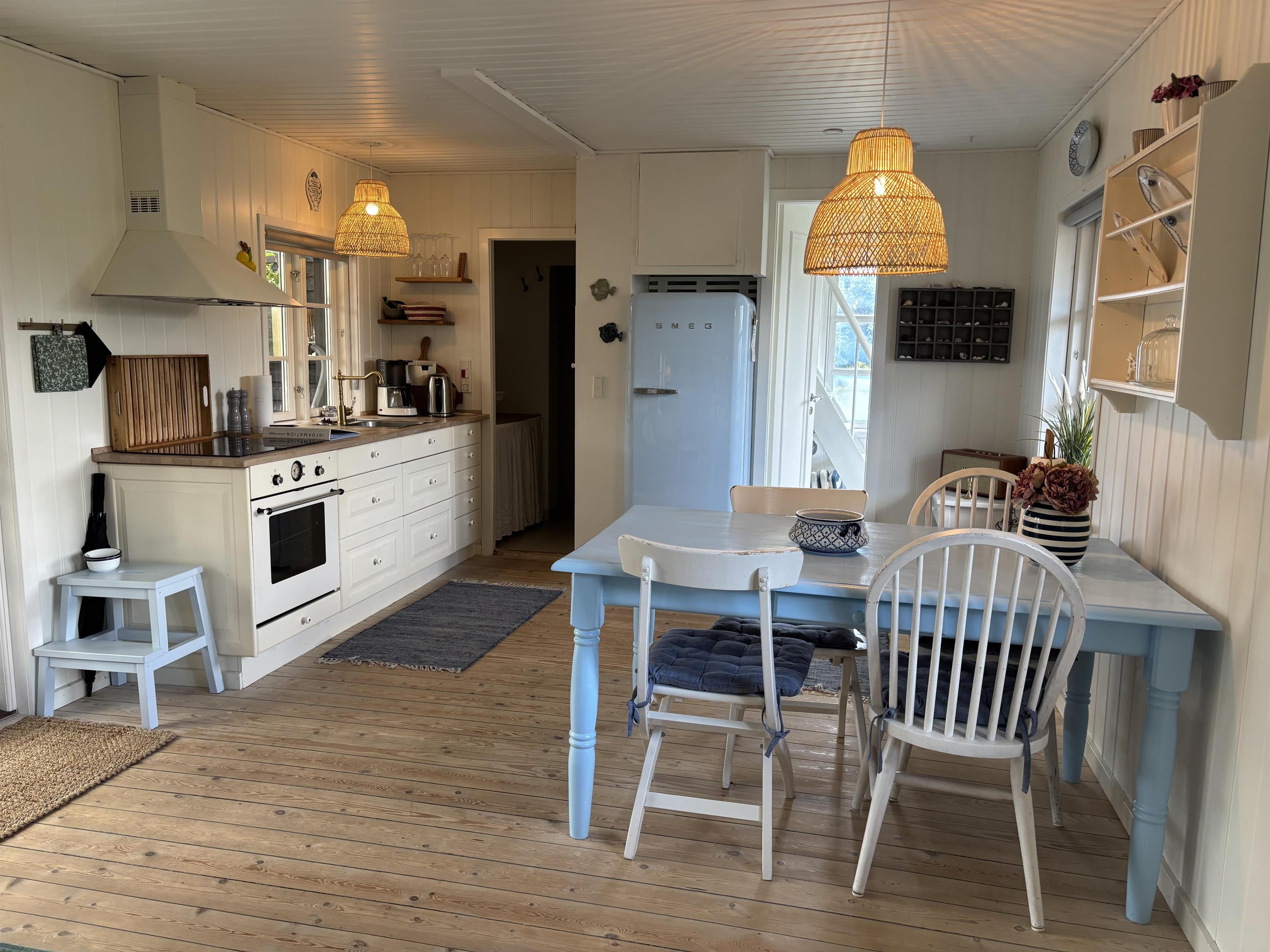 Fra stuen træder du ud i en skøn, lys udestue med spiseplads til 6 personer. Her kan familien nyde lange sommeraftener, hygge sig med brætspil eller slappe af i loungesofaen med en god bog. Den frodige vinduesplante, der slynger sig op langs taget, skaber en helt særlig stemning.