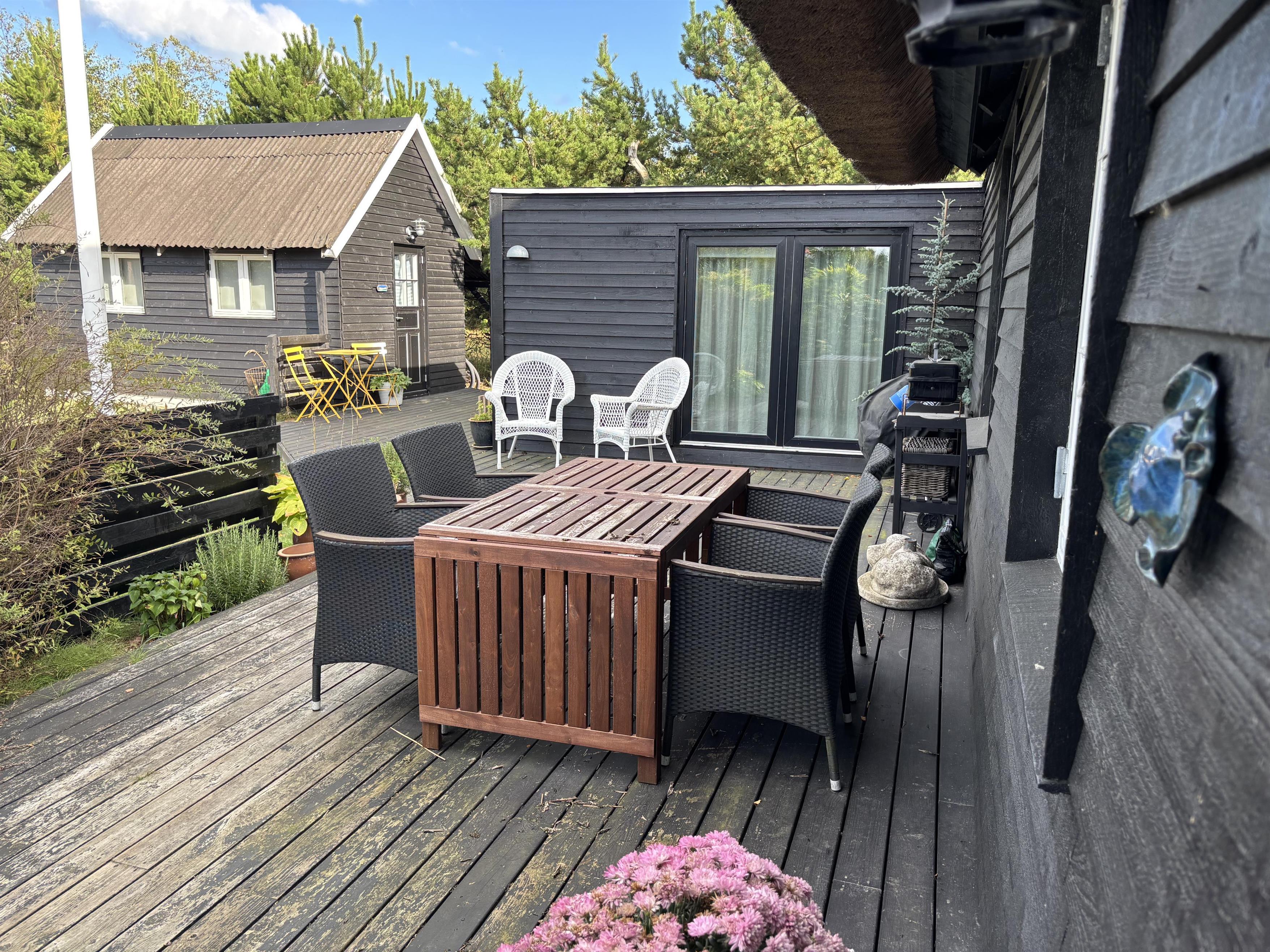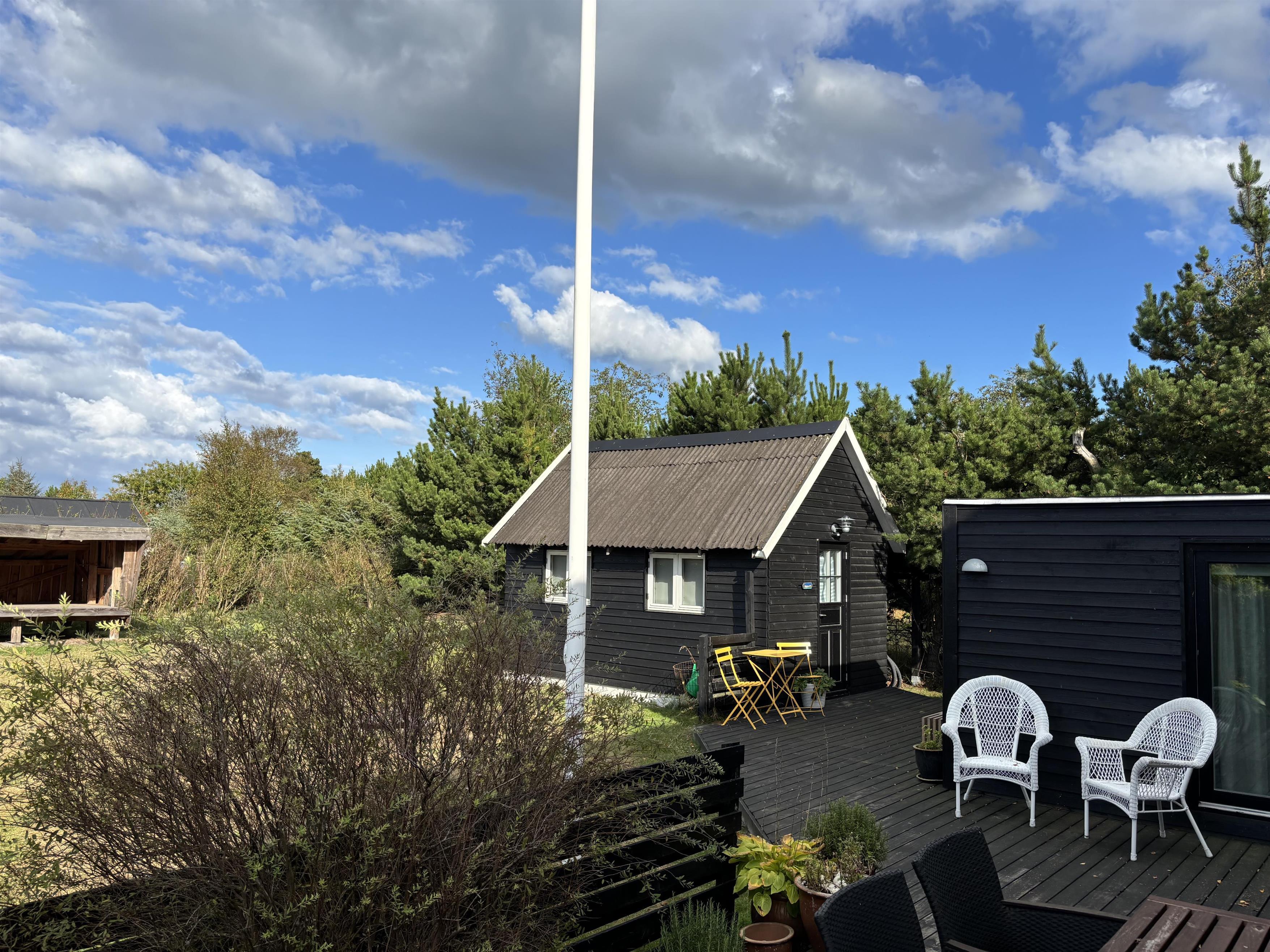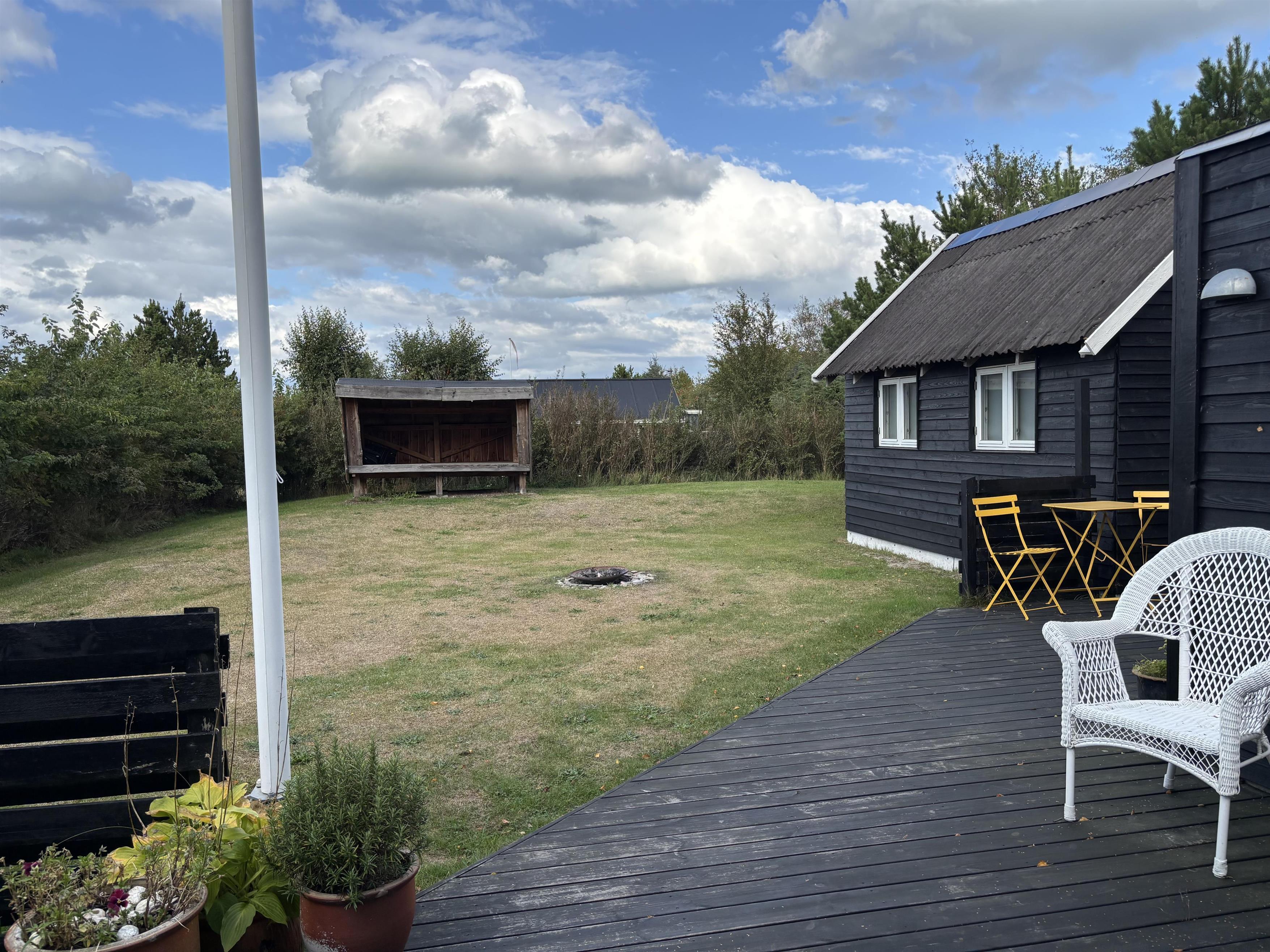 Udenfor venter flere hyggelige opholdsområder: En mindre terrasse med spiseplads, en stor træterrasse med bålplads og små kroge til afslapning. Den grønne plæne giver masser af plads til leg og udendørs aktiviteter for både børn og voksne. Ydermere bydes der også på en udebruser, så man nemt kan skylde sandet af, efter en tur ved stranden.