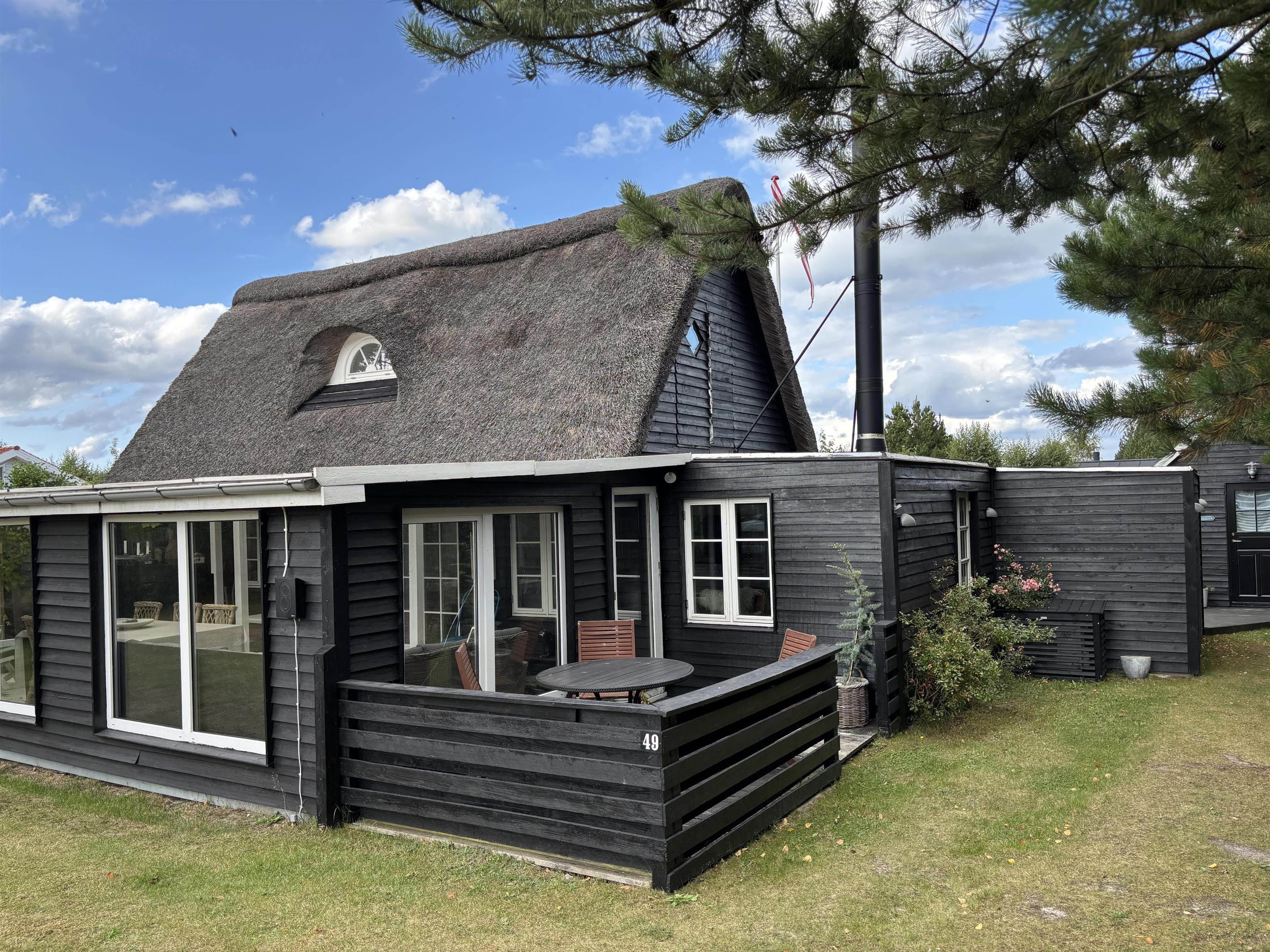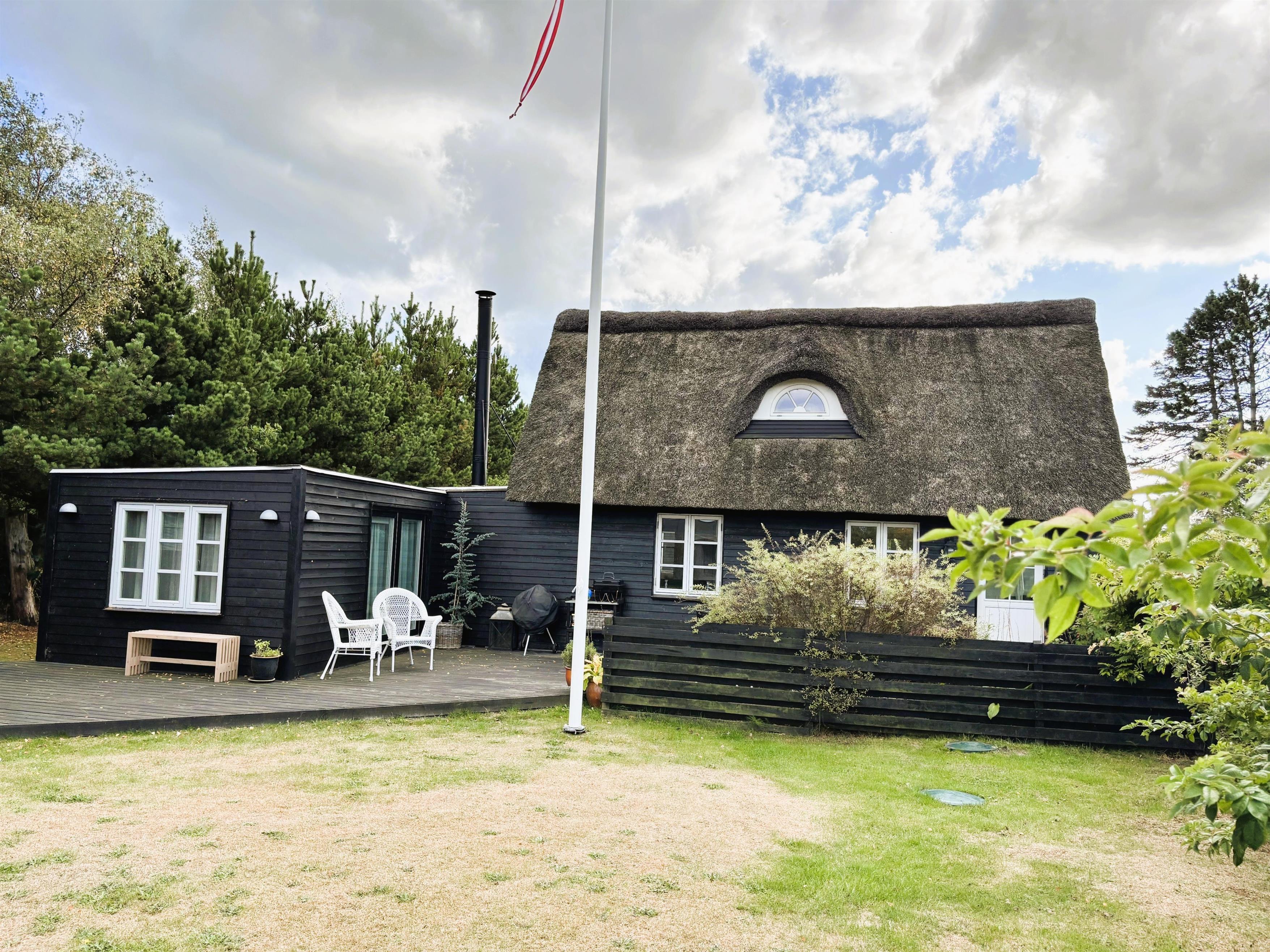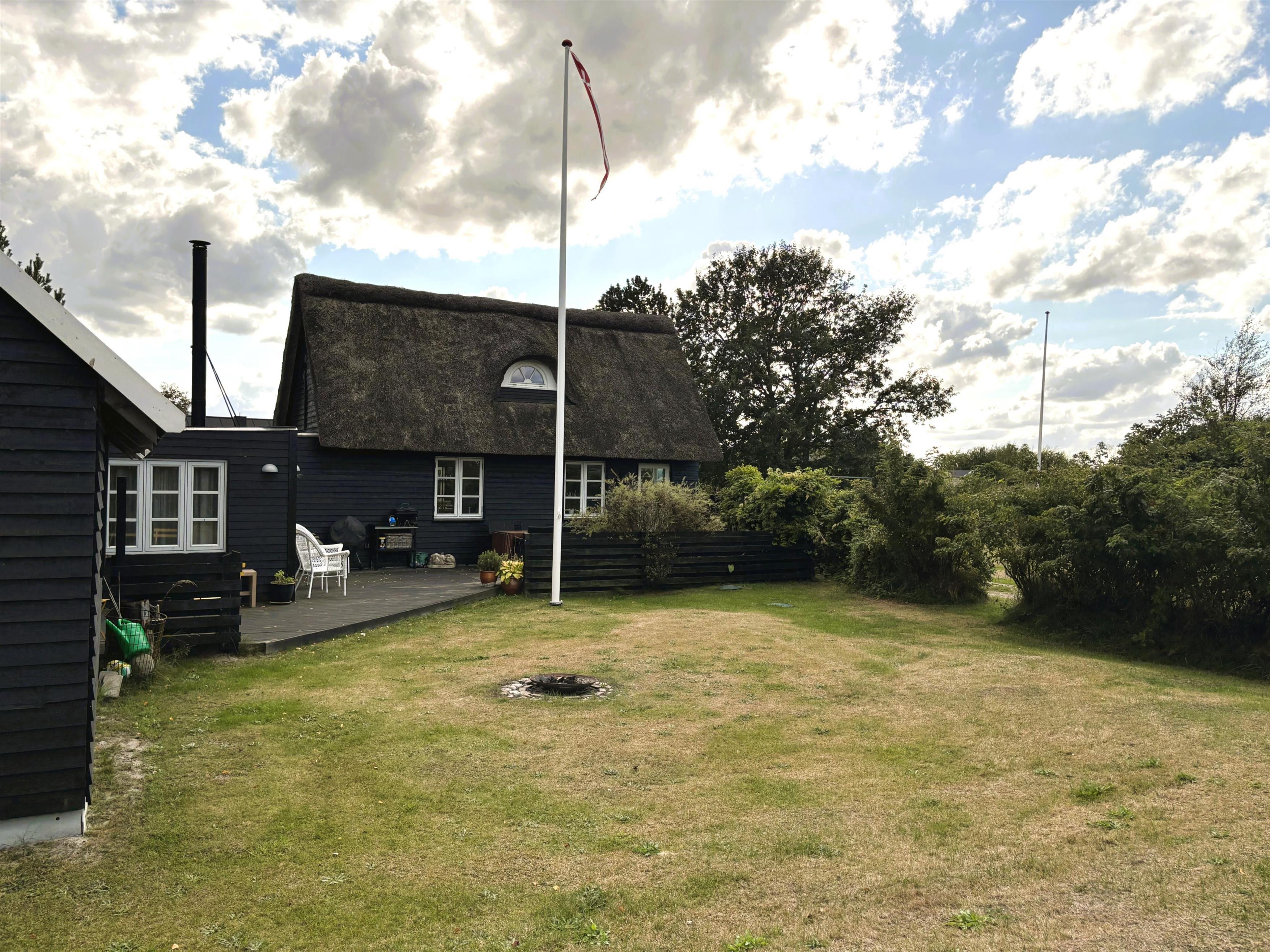 Udenfor venter flere hyggelige opholdsområder: En mindre terrasse med spiseplads, en stor træterrasse med bålplads og små kroge til afslapning. Den grønne plæne giver masser af plads til leg og udendørs aktiviteter for både børn og voksne. Ydermere bydes der også på en udebruser, så man nemt kan skylde sandet af, efter en tur ved stranden.