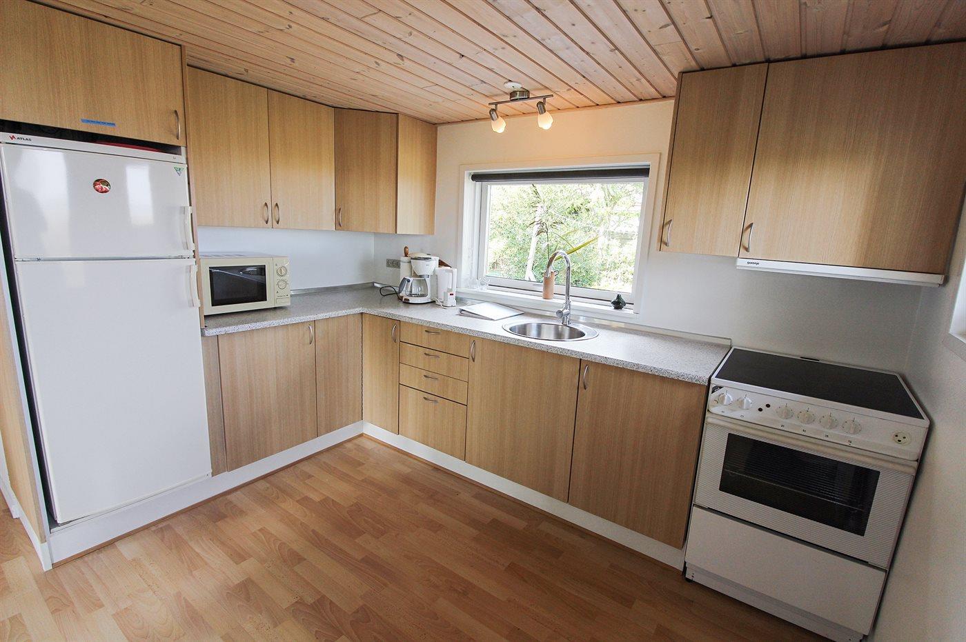 Køkkenet er udstyret med 1 køleskab. Der er 4 keramiske kogeplader, bageovn, mikrobølgeovn.
