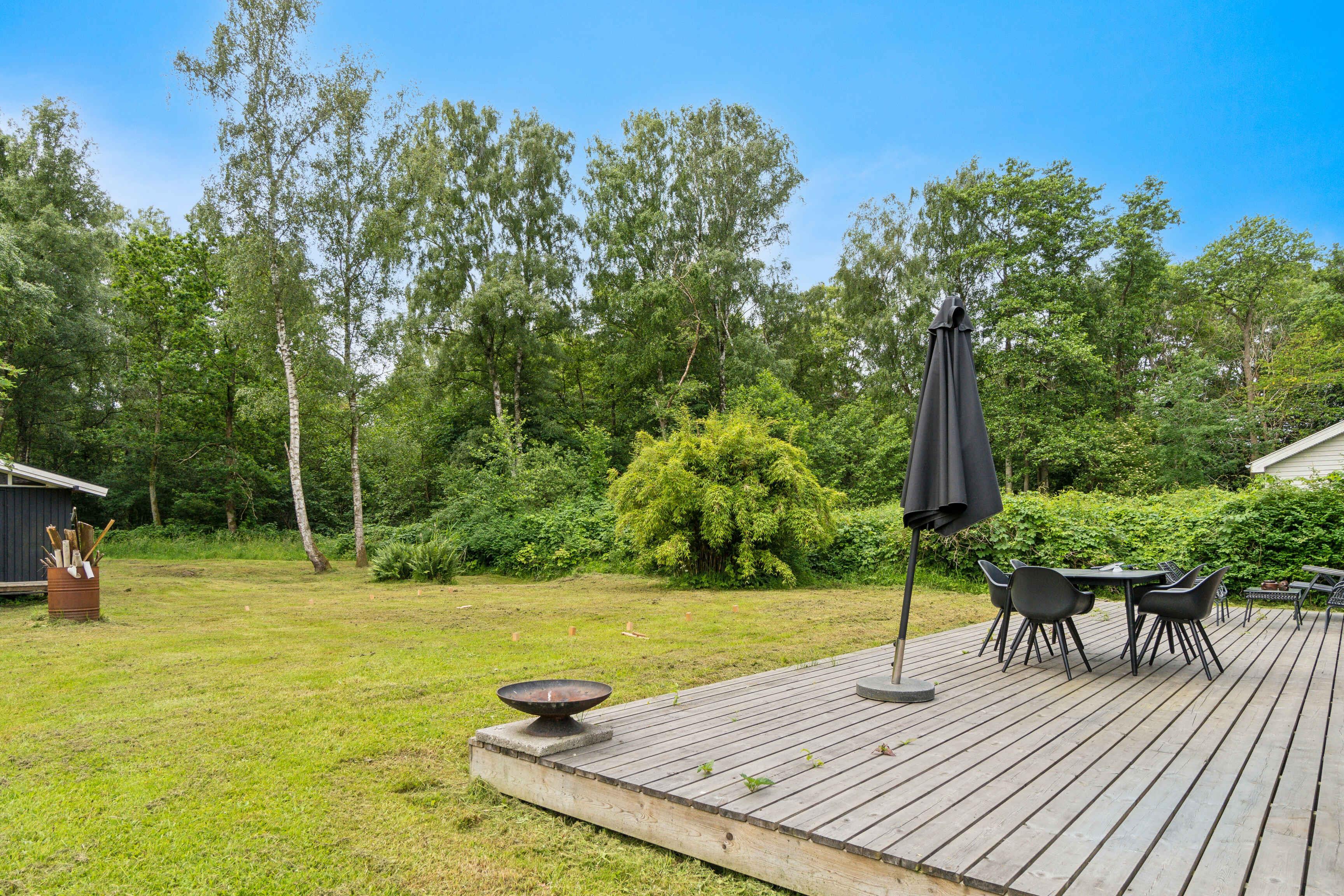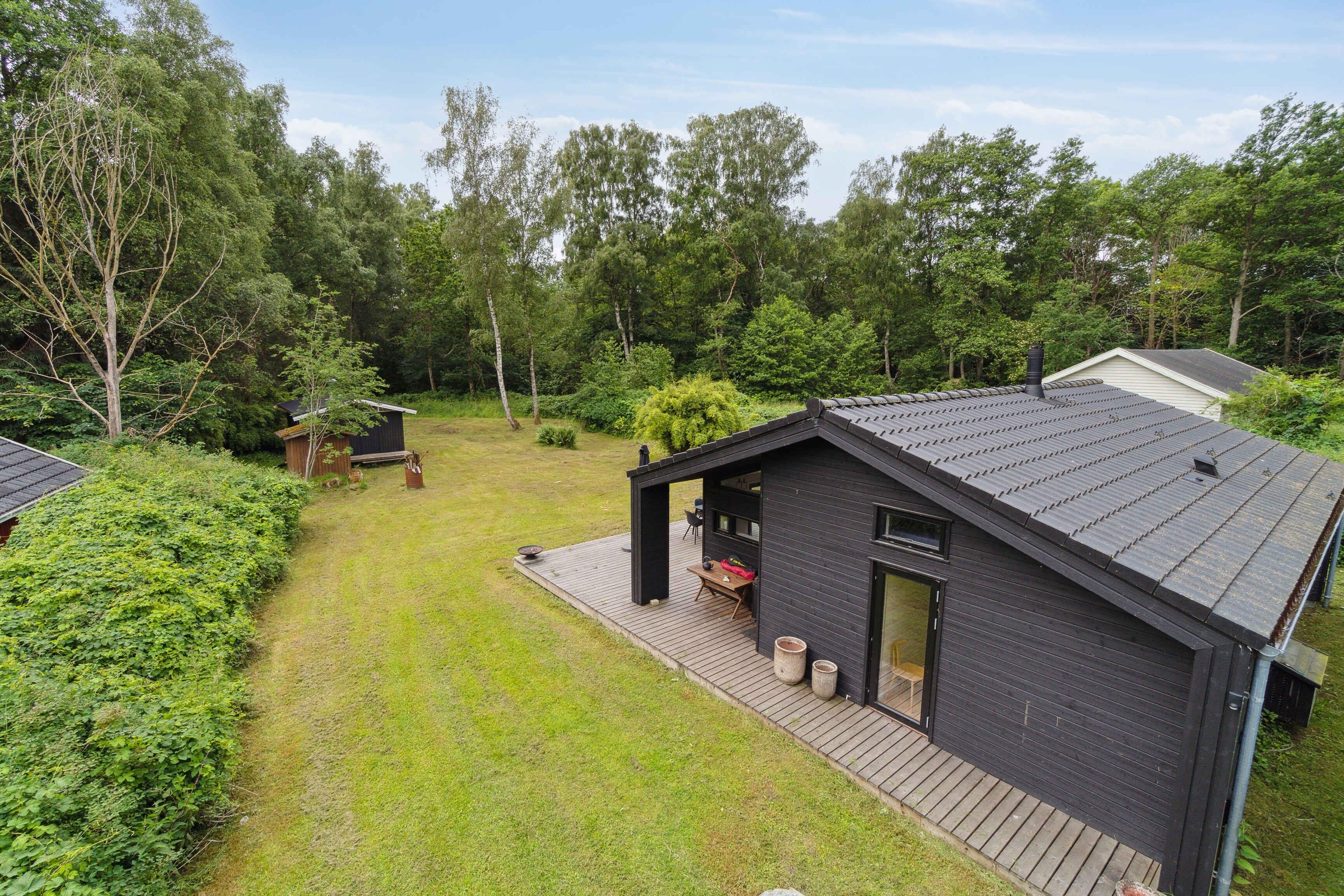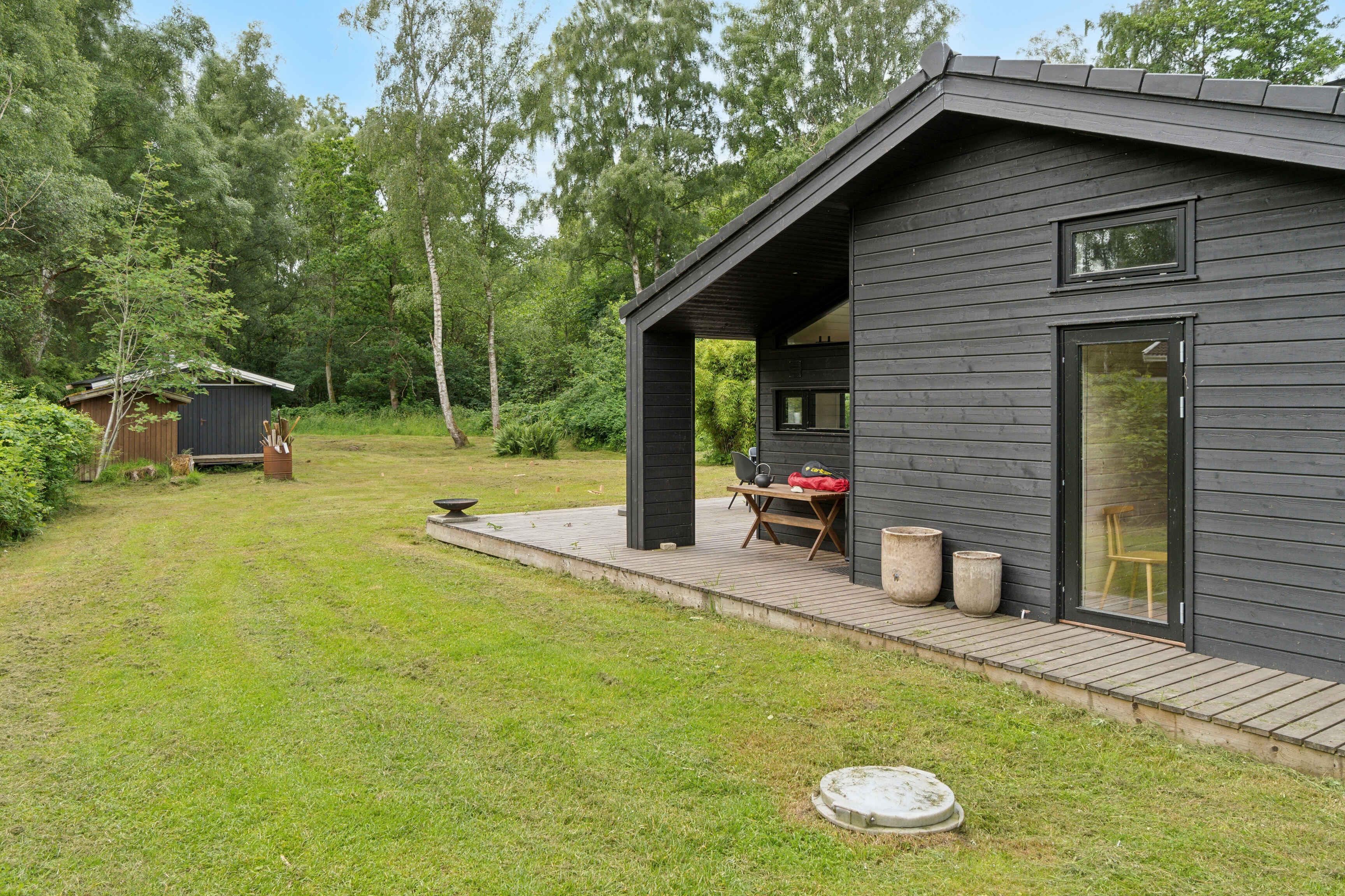Moderne sommerhus i Asserbo med terrasse, bålplads og naturskøn beliggenhed tæt på skov.