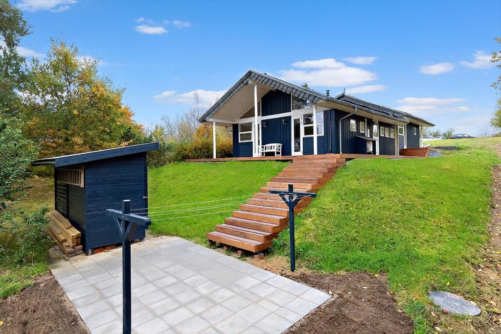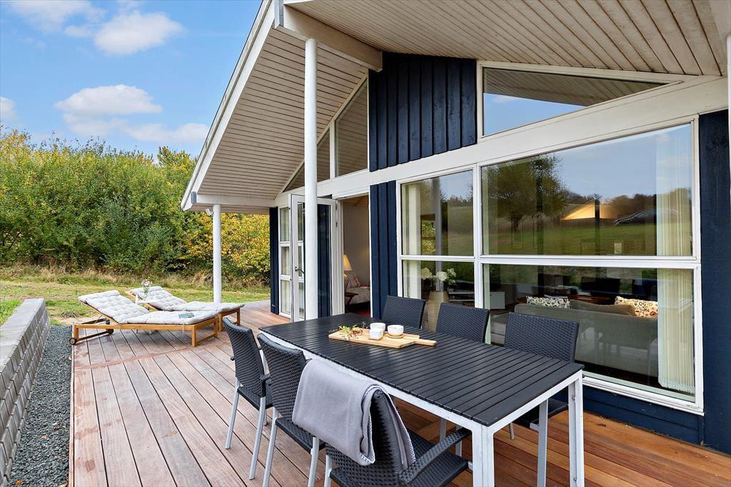Den store nye træterrasse, som er delvist overdækket, gør det nemt at nyde udendørslivet uanset vejret. Her kan I samles omkring de smukke havemøbler og nyde fælles måltider eller en stille stund med en god bog. Terrassen indbyder til hygge og afslapning, mens børnene trygt kan lege omkring huset. Der er Weber kuglegrill i haveskuret, og fin ny flise-terrasse ved siden af, som er anlagt mhp. grill aktivitet under trygge forhold. Når mørket falder på, skaber den lune aftens luft og naturens lyde en rolig afslutning på dagen.