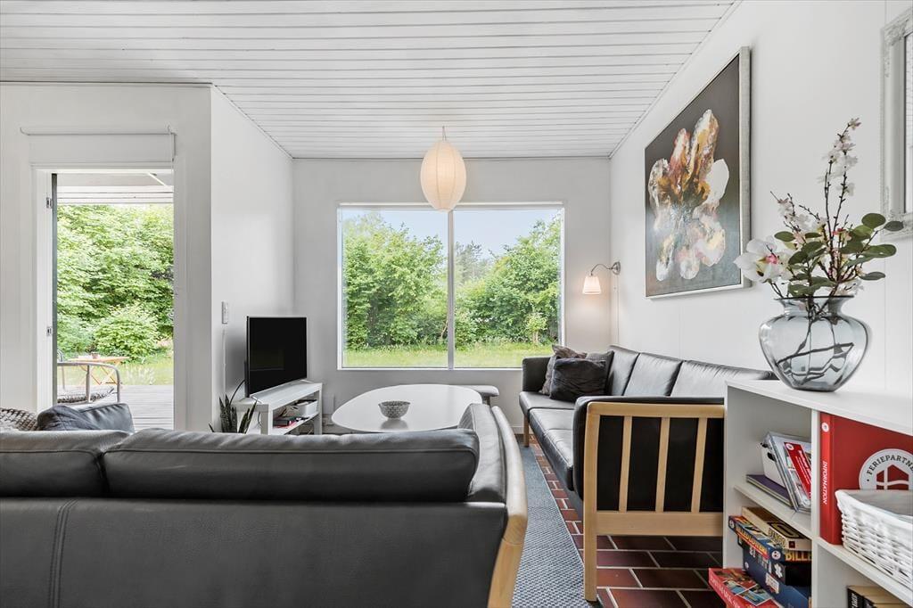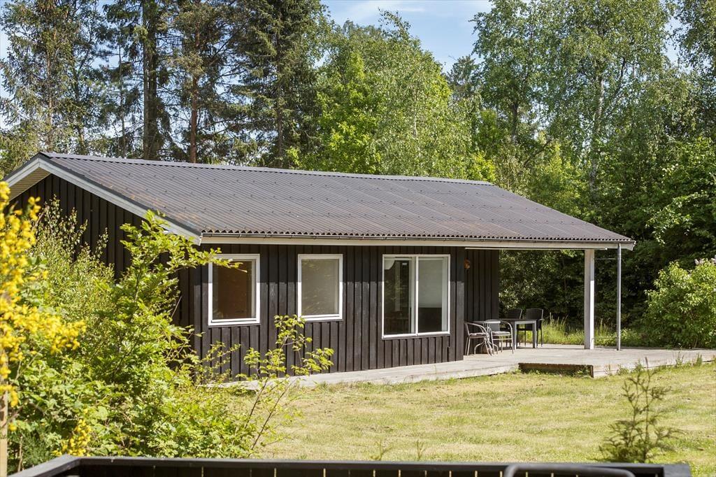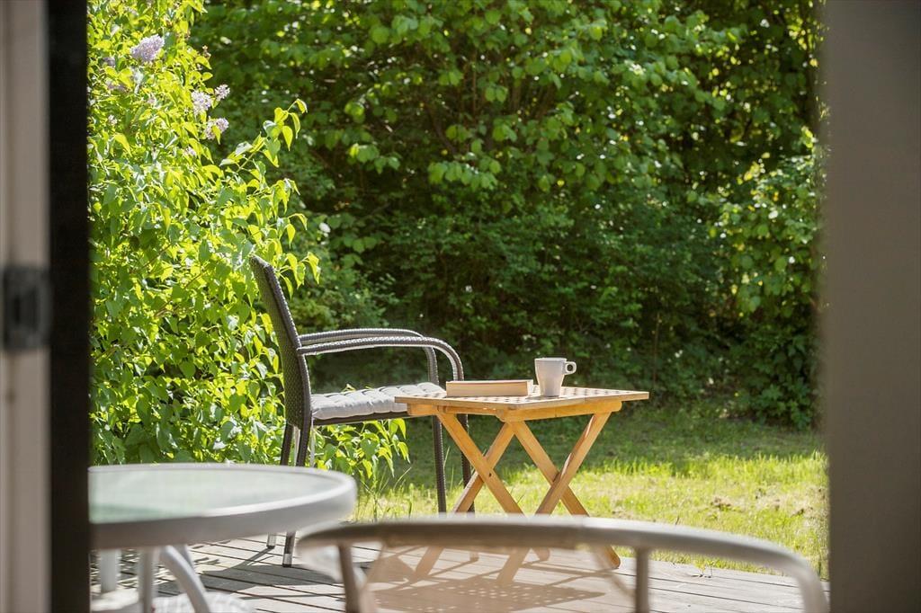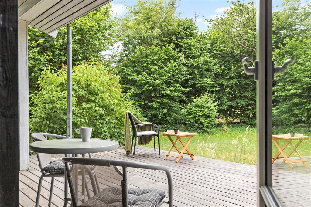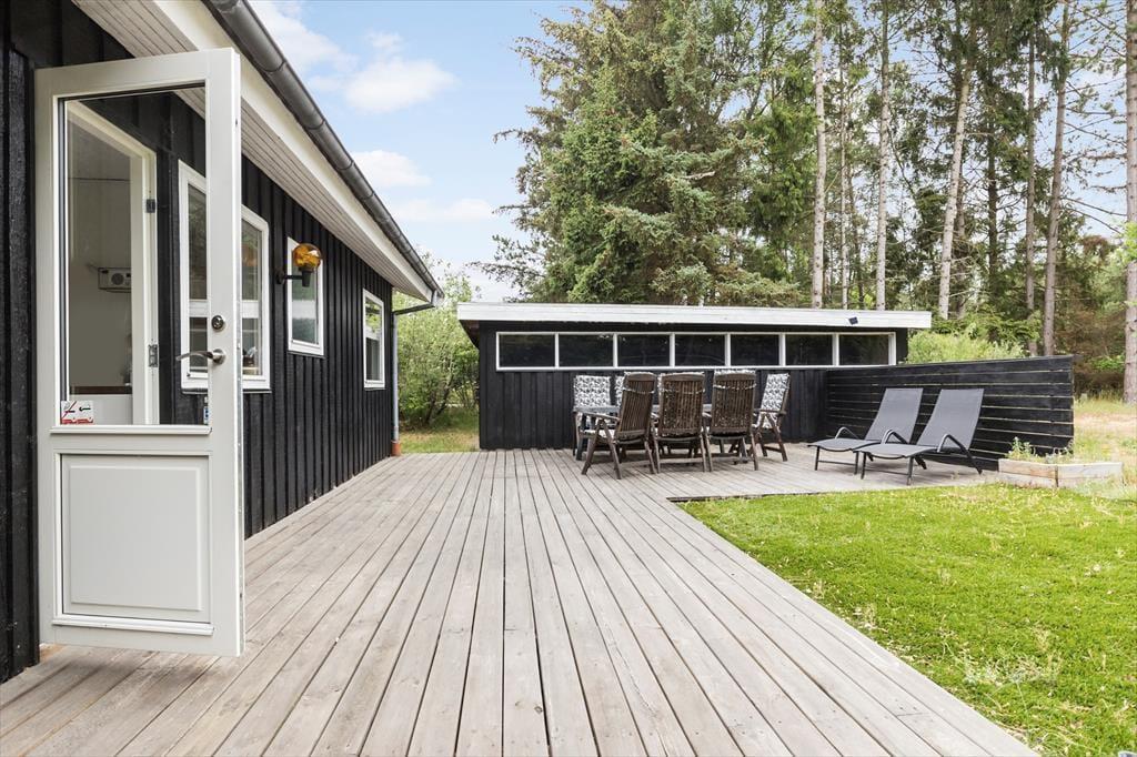 Feriehuset ligger på en stor og indbydende grund med masser af plads til leg og udendørsaktiviteter. Den rummelige terrasse, som er delvist overdækket, giver mulighed for at nyde udendørs måltider uanset vejret. Terrassen er udstyret med havemøbler og indbyder til afslapning i solen eller hyggelige grillaftener. For de mindste er der et hyggeligt legeområde på grunden, hvor de kan lade fantasien få frit spil. Der er også en carport tilknyttet huset, så bilen kan stå i ly.