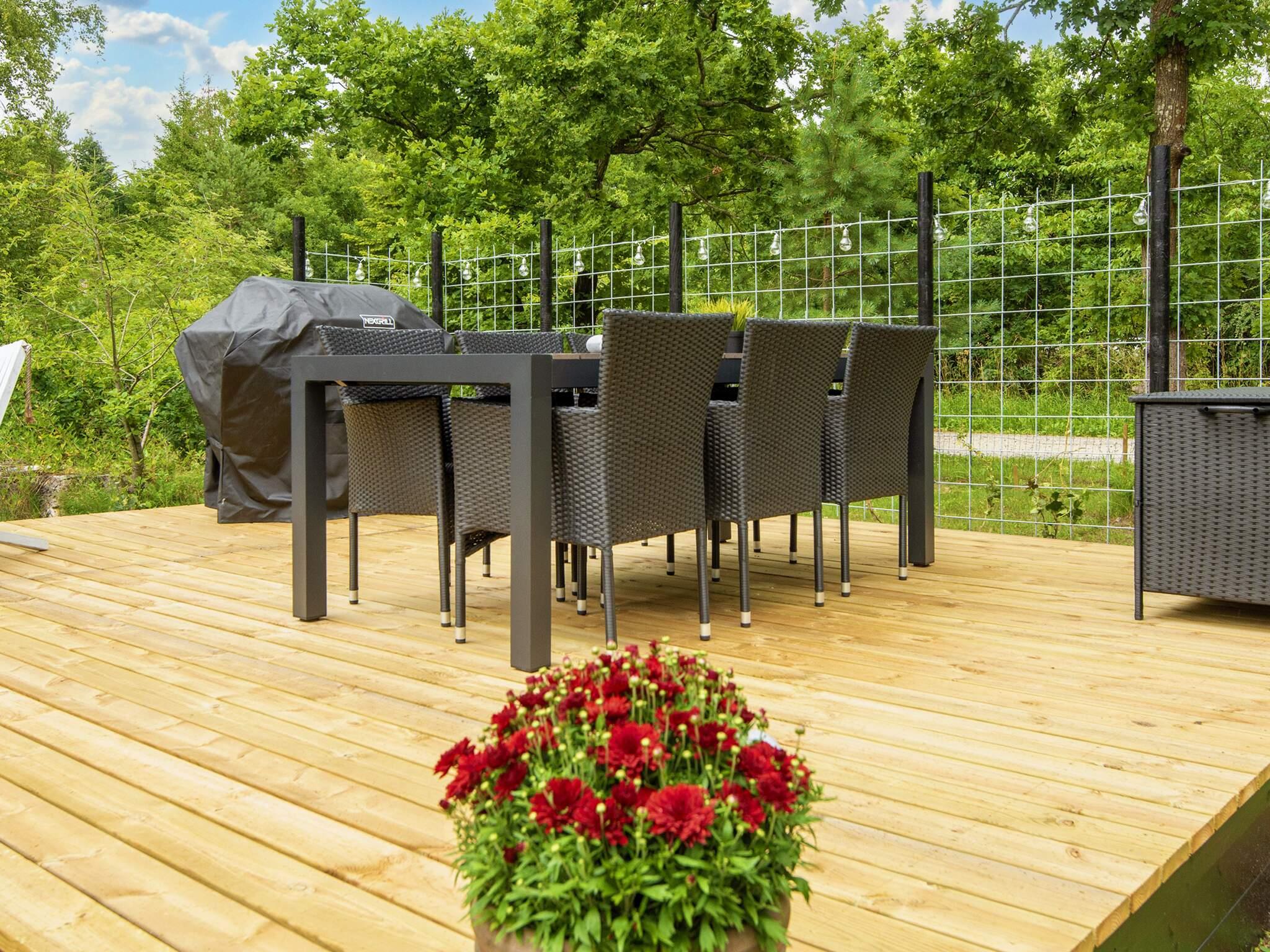 Terrassen er udstyret med hyggelige siddepladser og det træopvarmede spabad, hvilket skaber et ideelt sted til at nyde solen eller slappe af efter en dag med udforskning. Ejendommen er fuldt indhegnet og har modne træer, der giver naturlig skygge og et behageligt miljø for både børn og voksne. Den store græsplæne byder på rigelig plads til spil, solbadning eller blot at nyde den friske luft i fuldstændig privatliv.