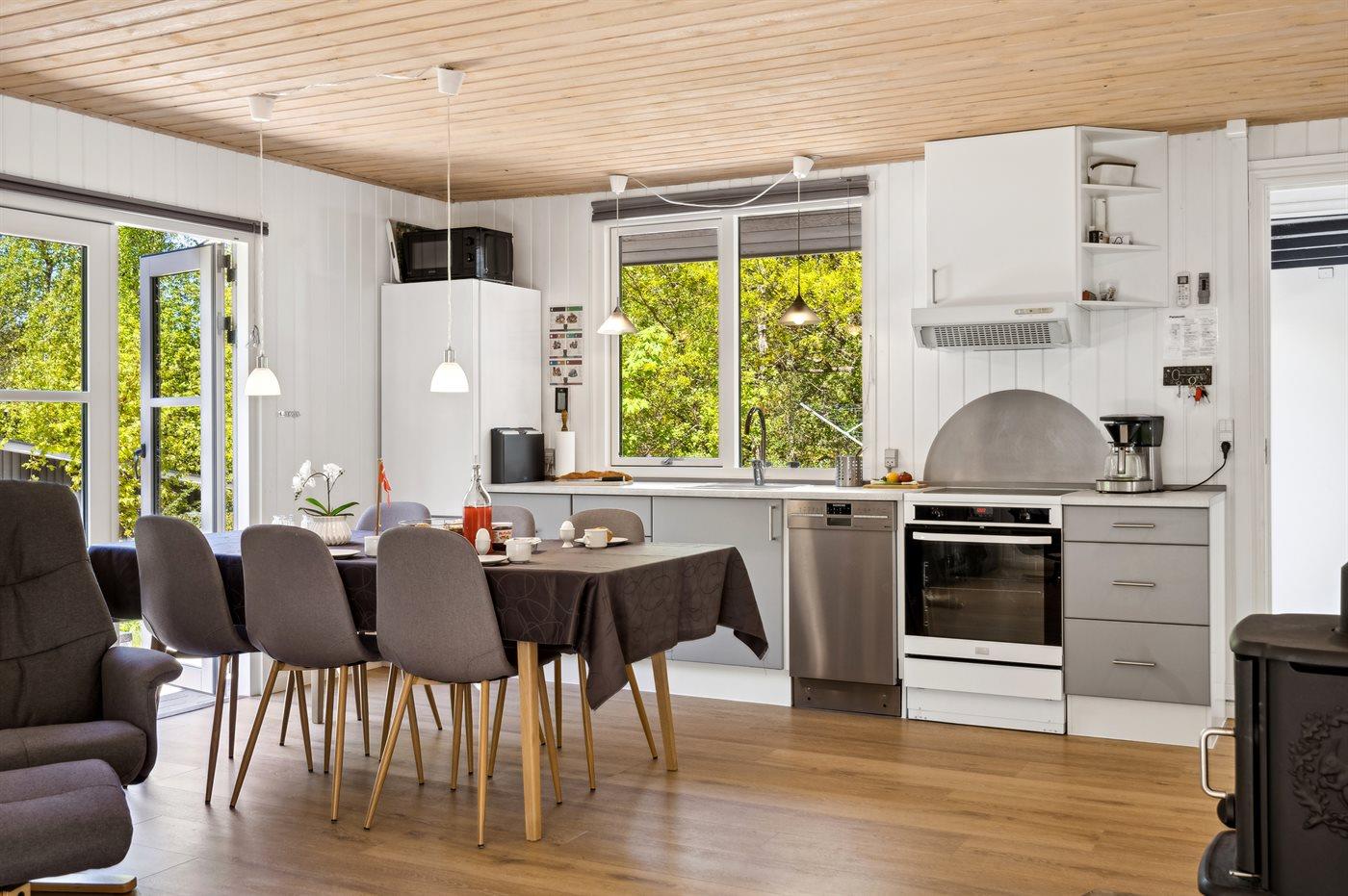 Køkkenet er udstyret med køleskab og fryser med en kapacitet på 70 liter. Der er 4 keramiske kogeplader, varmluftovn, mikrobølgeovn samt opvaskemaskine.