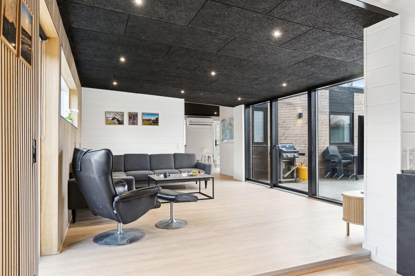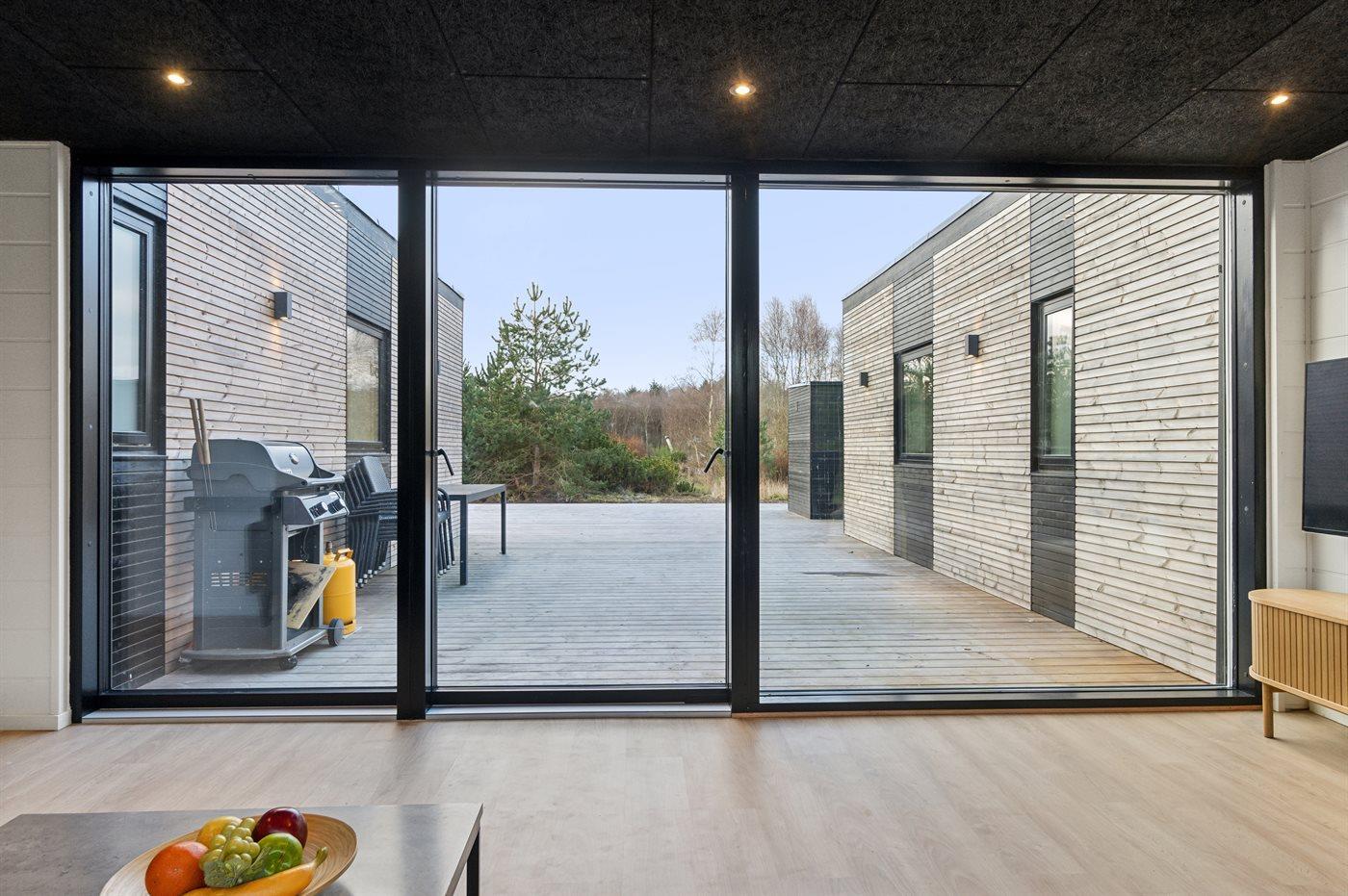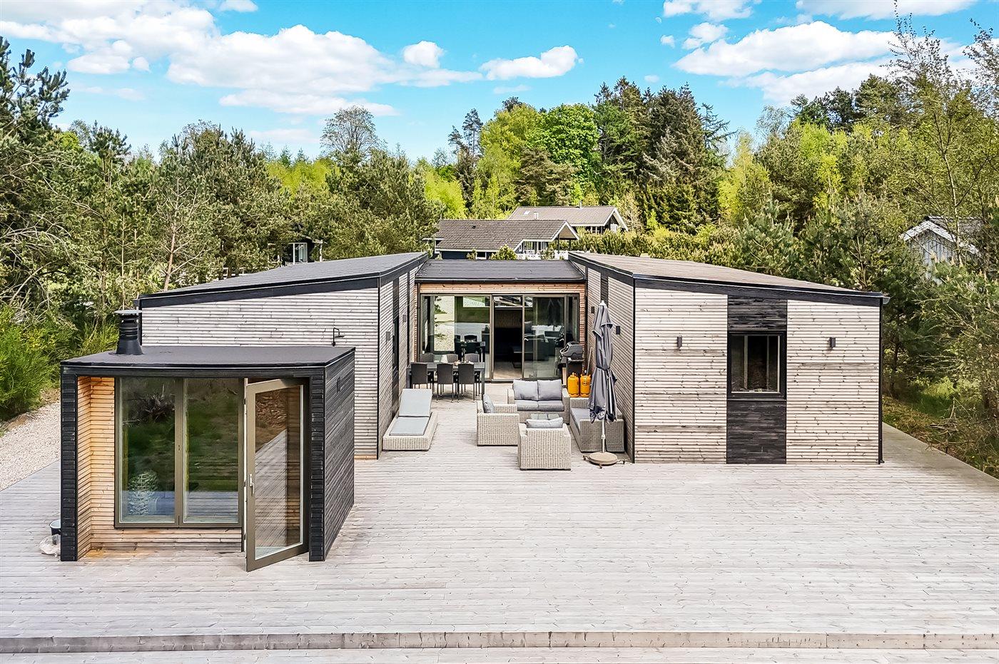 Sommerhuset i tre længer er det oplagte udgangspunkt for flere familier, der gerne vil have hver sin afdeling. Udenfor er der en stor og dejlig terrasse samt en skøn udendørs sauna med udsigt over landskabet.
