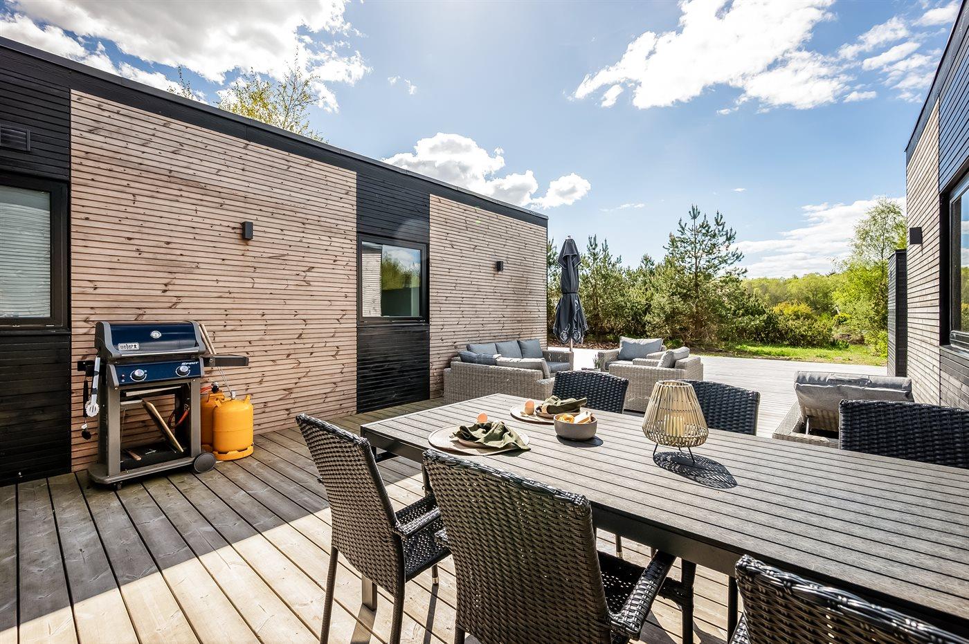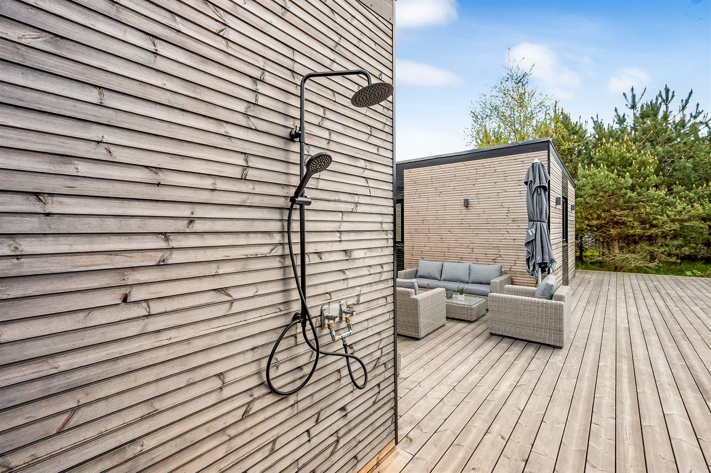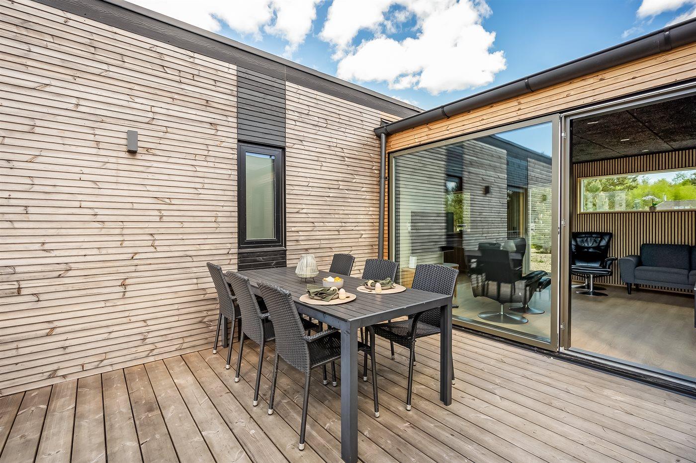 Sommerhuset i tre længer er det oplagte udgangspunkt for flere familier, der gerne vil have hver sin afdeling. Udenfor er der en stor og dejlig terrasse samt en skøn udendørs sauna med udsigt over landskabet.