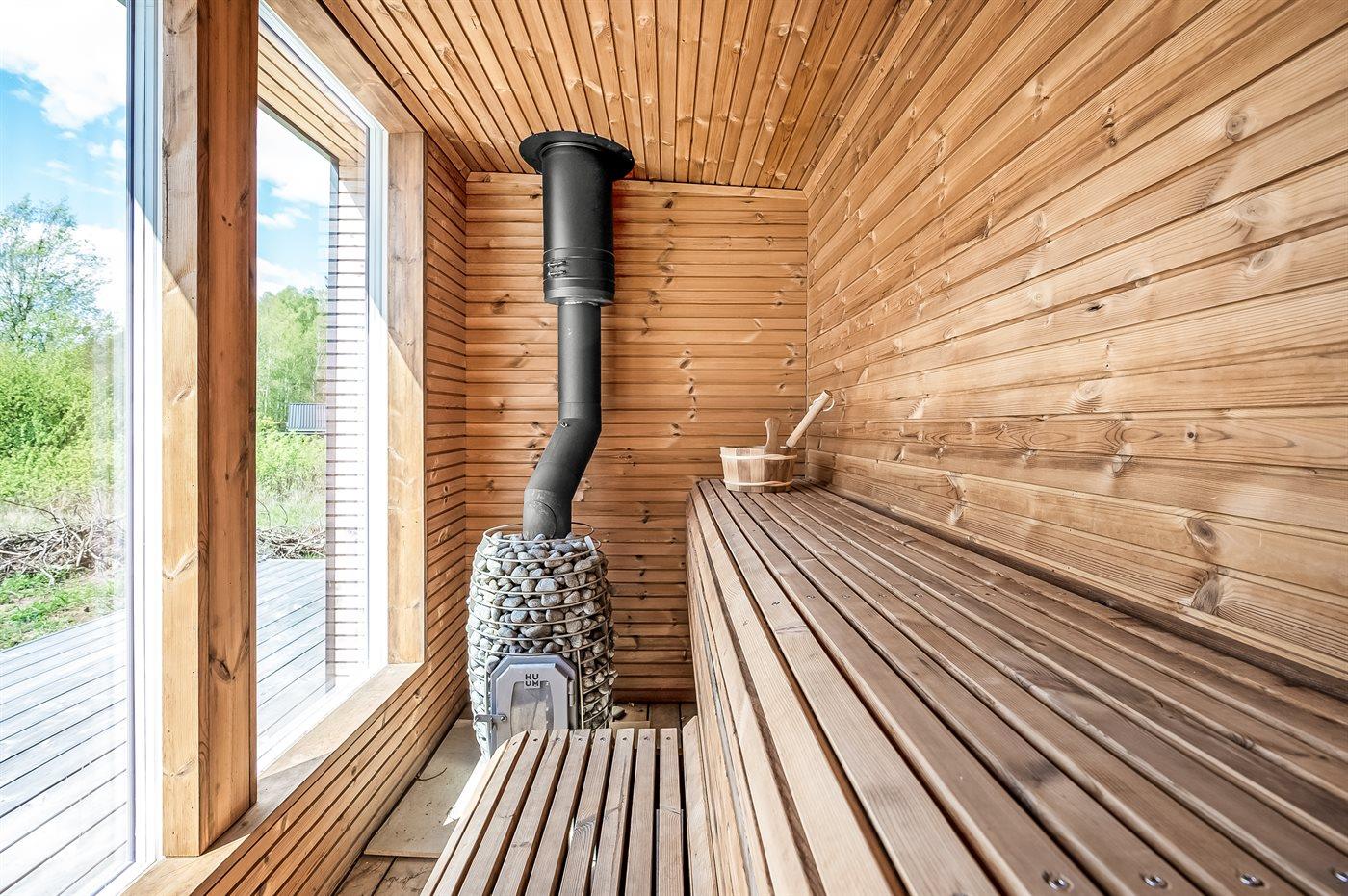 Ferieboligen er beliggende på en 1200 m² stor naturgrund. Der er 6800 m til havet. Nærmeste forretning er beliggende i en afstand af 2500 m. Til ferieboligen hører åbent terrasseareal. Gynge. Udendørs sauna. Grill til rådighed. Parkering ved ferieboligen.