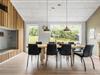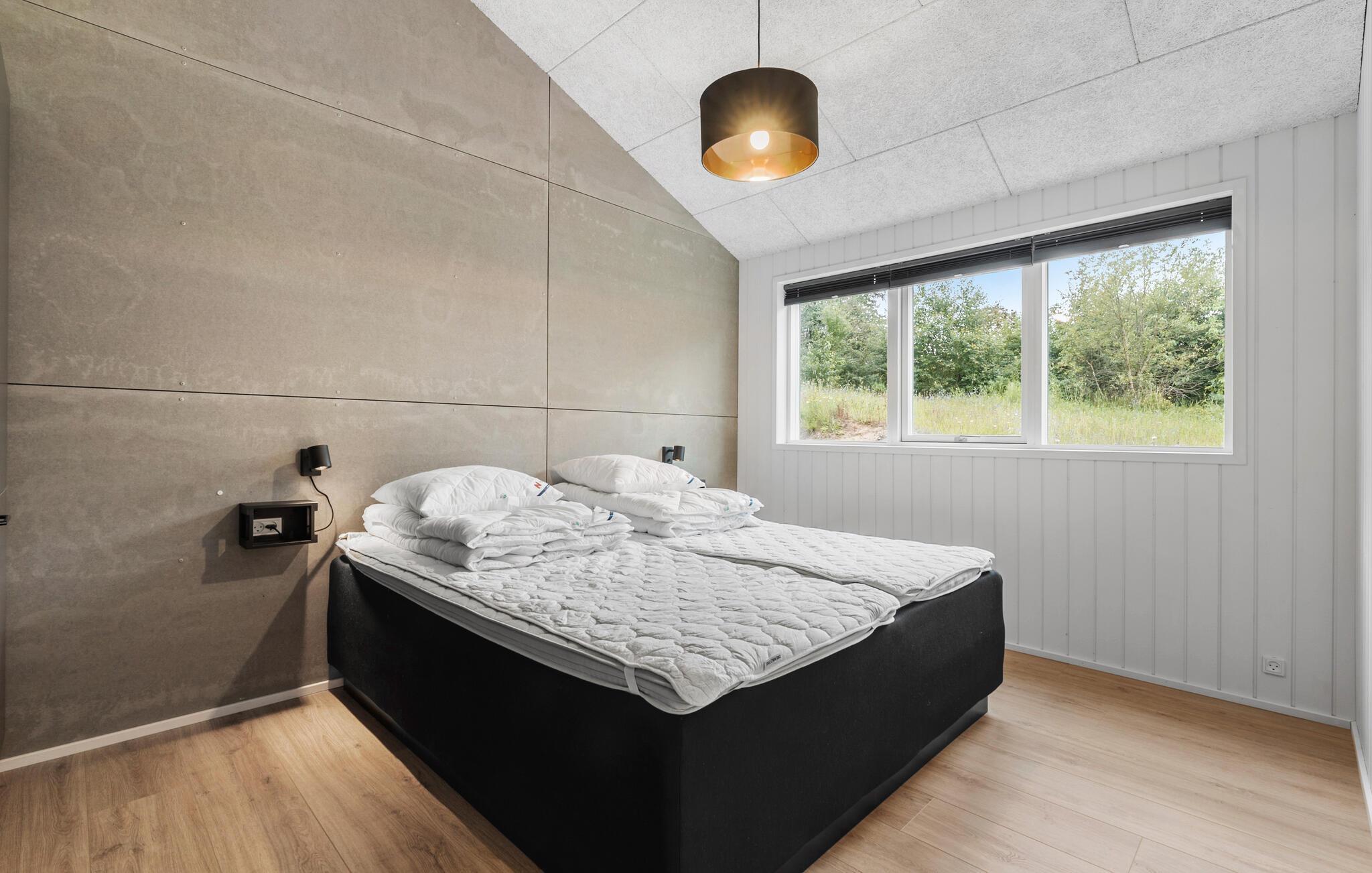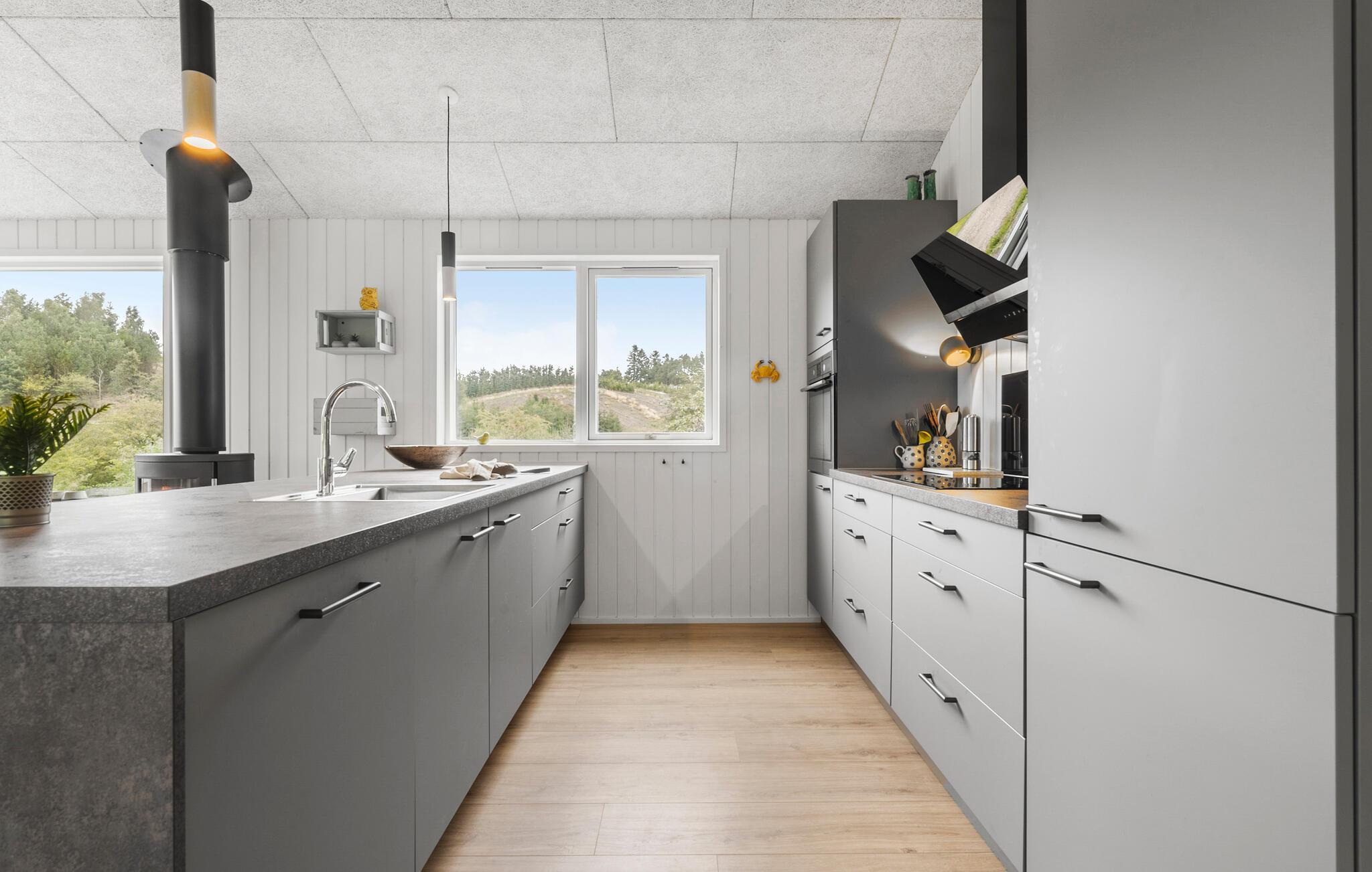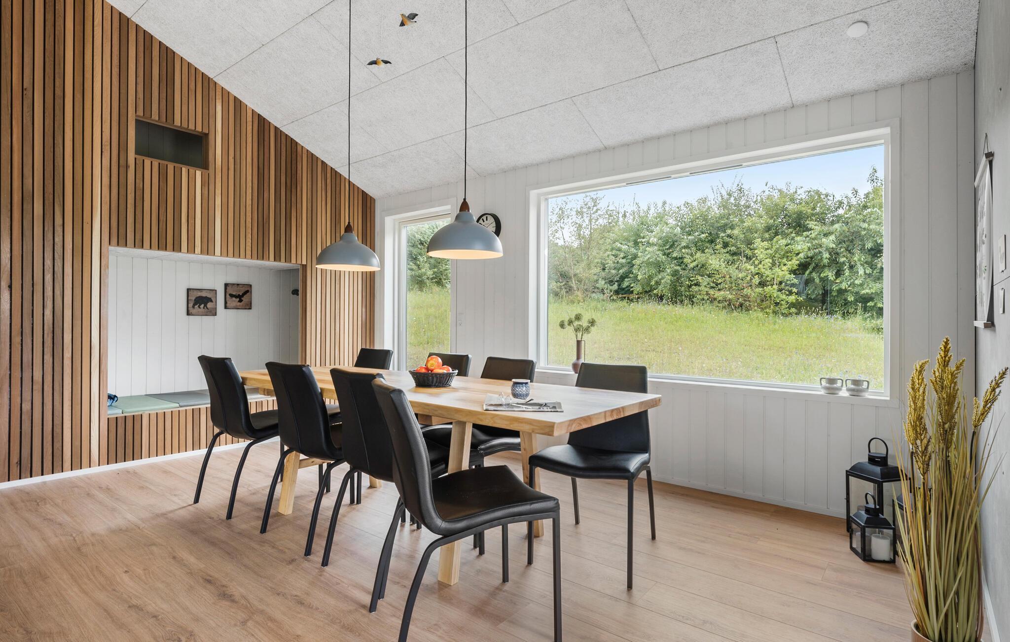 Dette moderne sommerhus med skønt lysindfald kan danne de oplagte rammer for jeres næste ferie. De store vinduespartier åbner op for udsigten til det grønne natur, mens den stilfulde indretning og den hyggelige brændeovn skaber en hjemlig stemning. Slap af i sofakrogen med en god bog i hånden eller tag dagens eftermiddagslur. Oven over alkoven er der en hems, hvor børnene kan hygge sig med brætspil, mens I forbereder aftensmad i det åbne køkken.