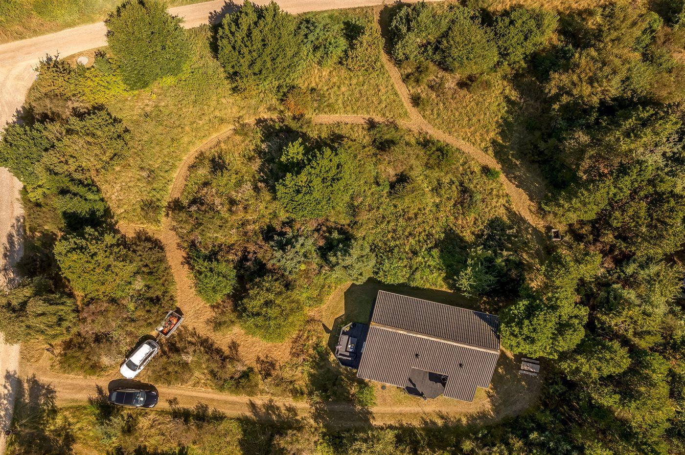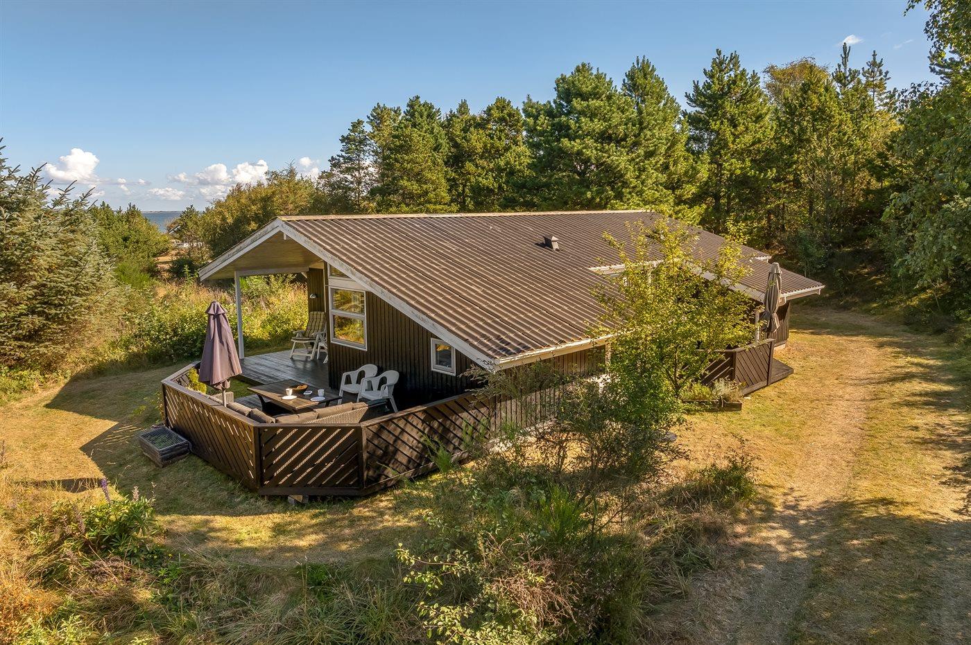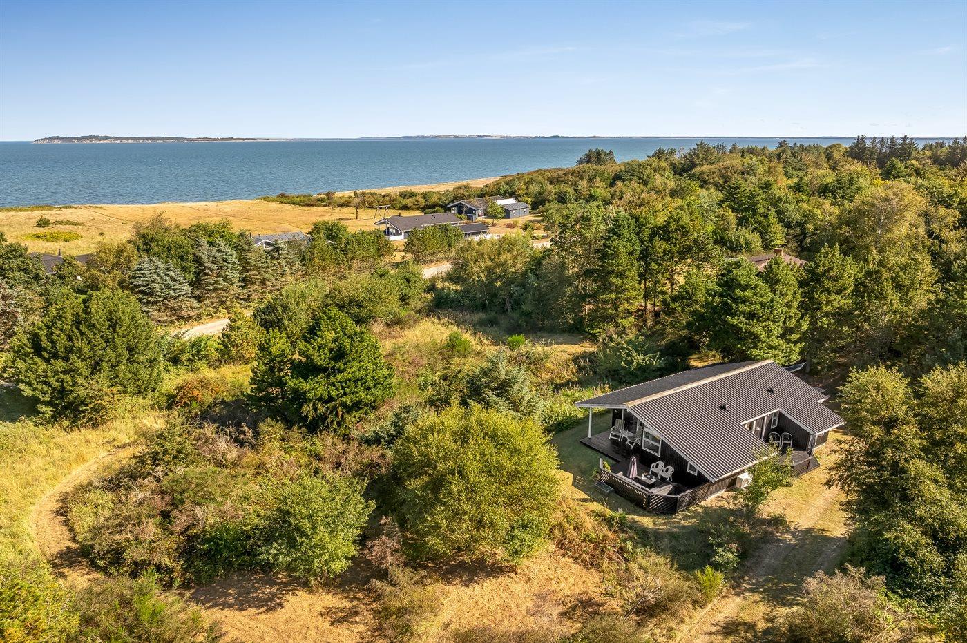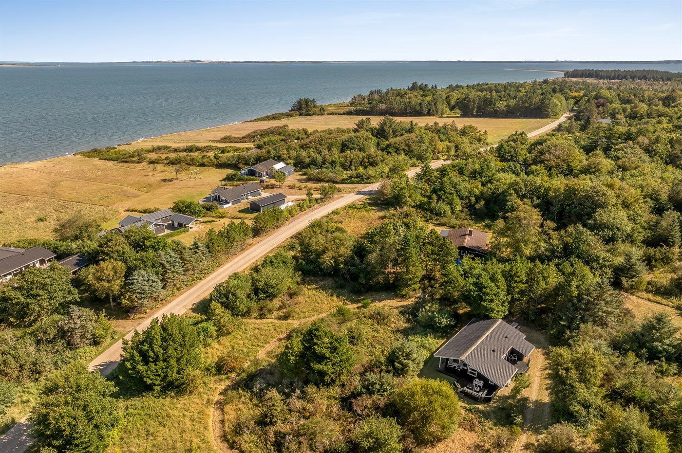 Ferieboligen er beliggende på en 3263 m² stor grund i skov/plantage. Der er 250 m til fjorden. Nærmeste forretning er beliggende i en afstand af 7500 m. Til ferieboligen hører åbent terrasseareal. Desuden er der overdækket terrasse. Parkering ved ferieboligen.
