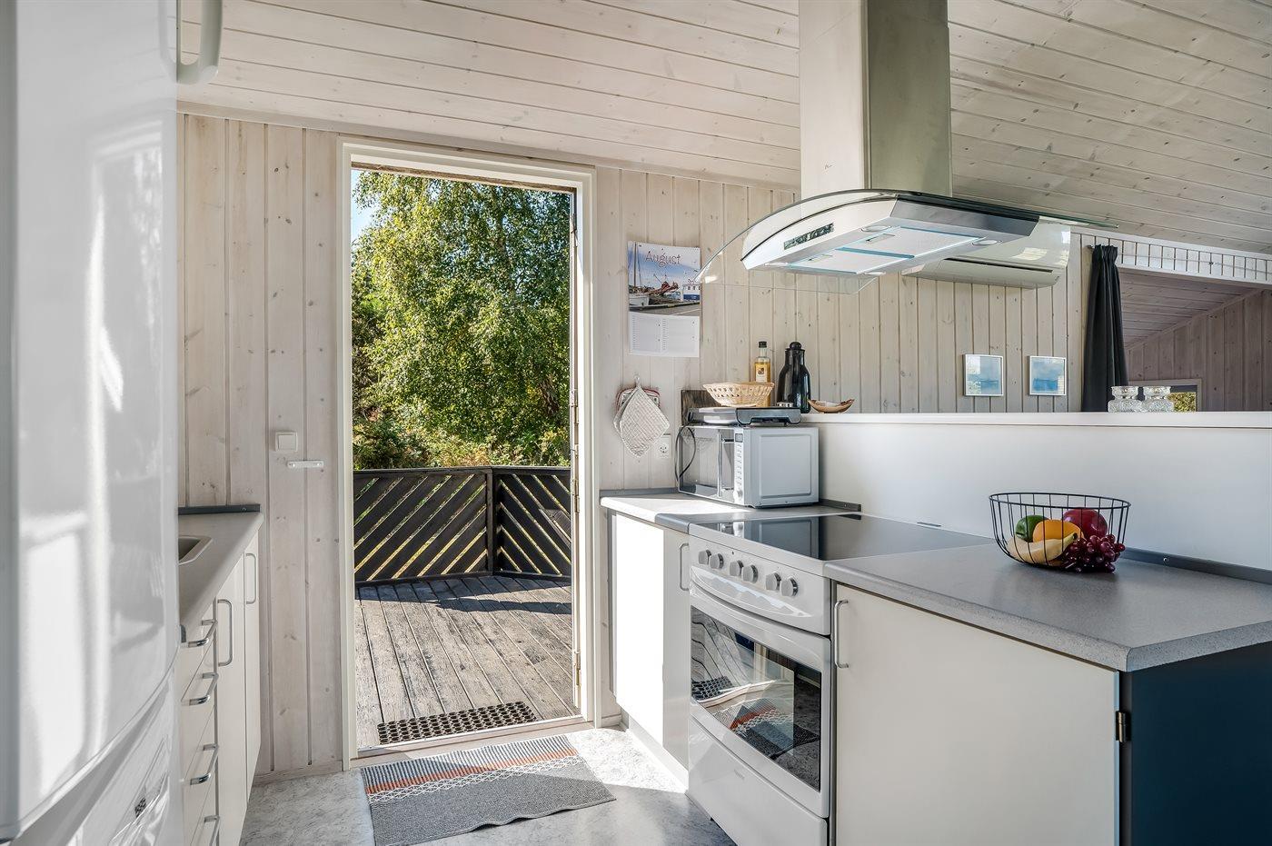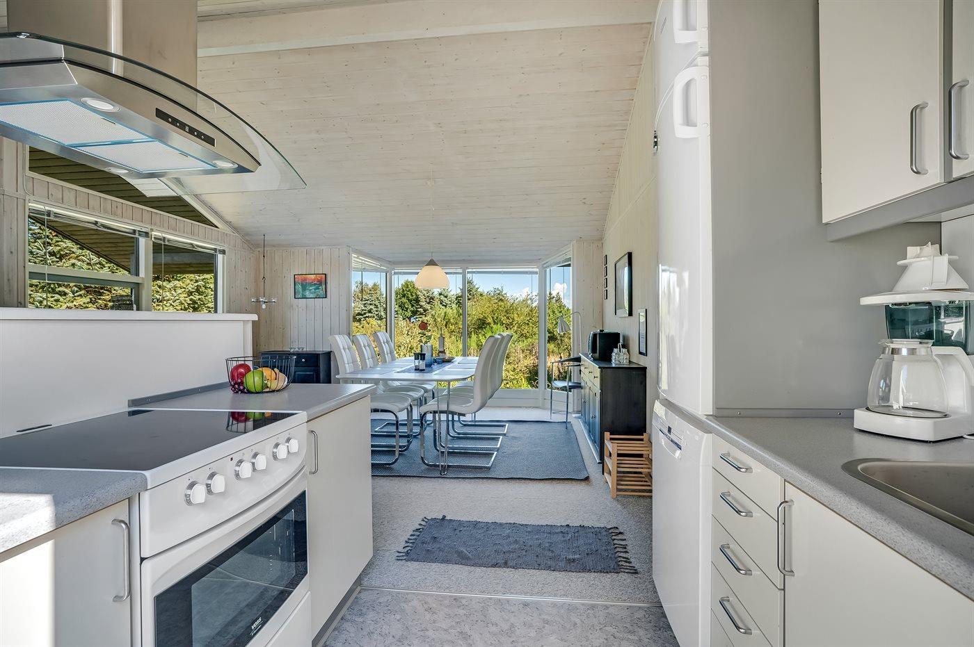 Køkkenet er udstyret med 1 køleskab. Der er 4 elkogeplader, varmluftovn, mikrobølgeovn samt opvaskemaskine.