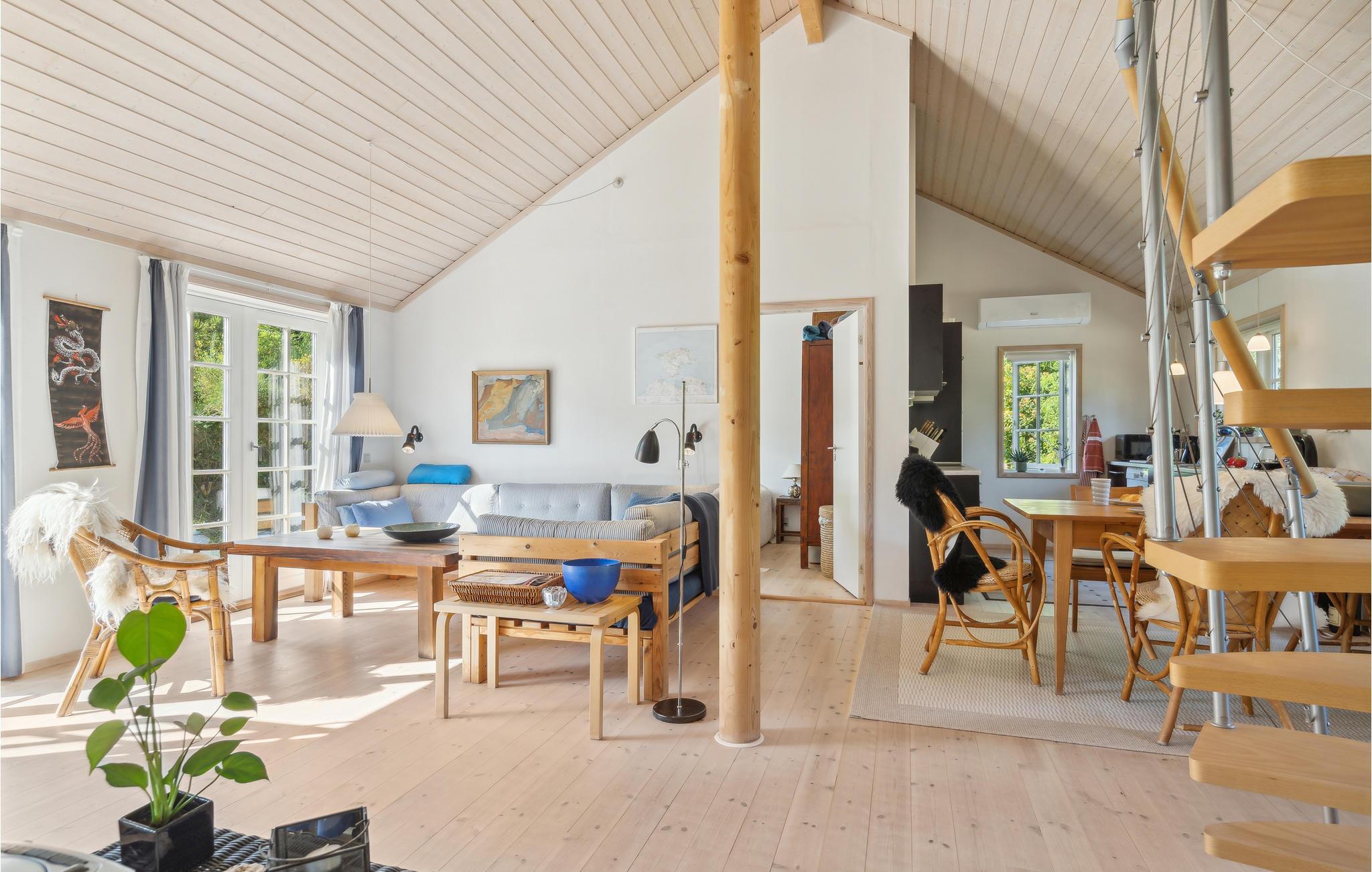 Velkommen til denne fredfyldte grund, som har en helt enestående beliggenhed på limfjordsøen Fur, blot 100 meter fra vandet. Midt på den skovklædte grund ligger dette elegante sommerhus, som kan blive jeres base i nogle feriedage, hvor I kan komme helt ned i tempo. Huset er indrettet med flotte kvalitetsløsninger og mange hyggekroge, så I kan se frem til gode timer, hvor alle hygger sig med fælles aktiviteter eller en lille alenestund. Tænd op i brændovnen på de kølige aftener og find sammen om brætspil. køkkenet har en dejlig udsigt til de grønne omgivelser, som I kan nyde, mens I står og laver mad.