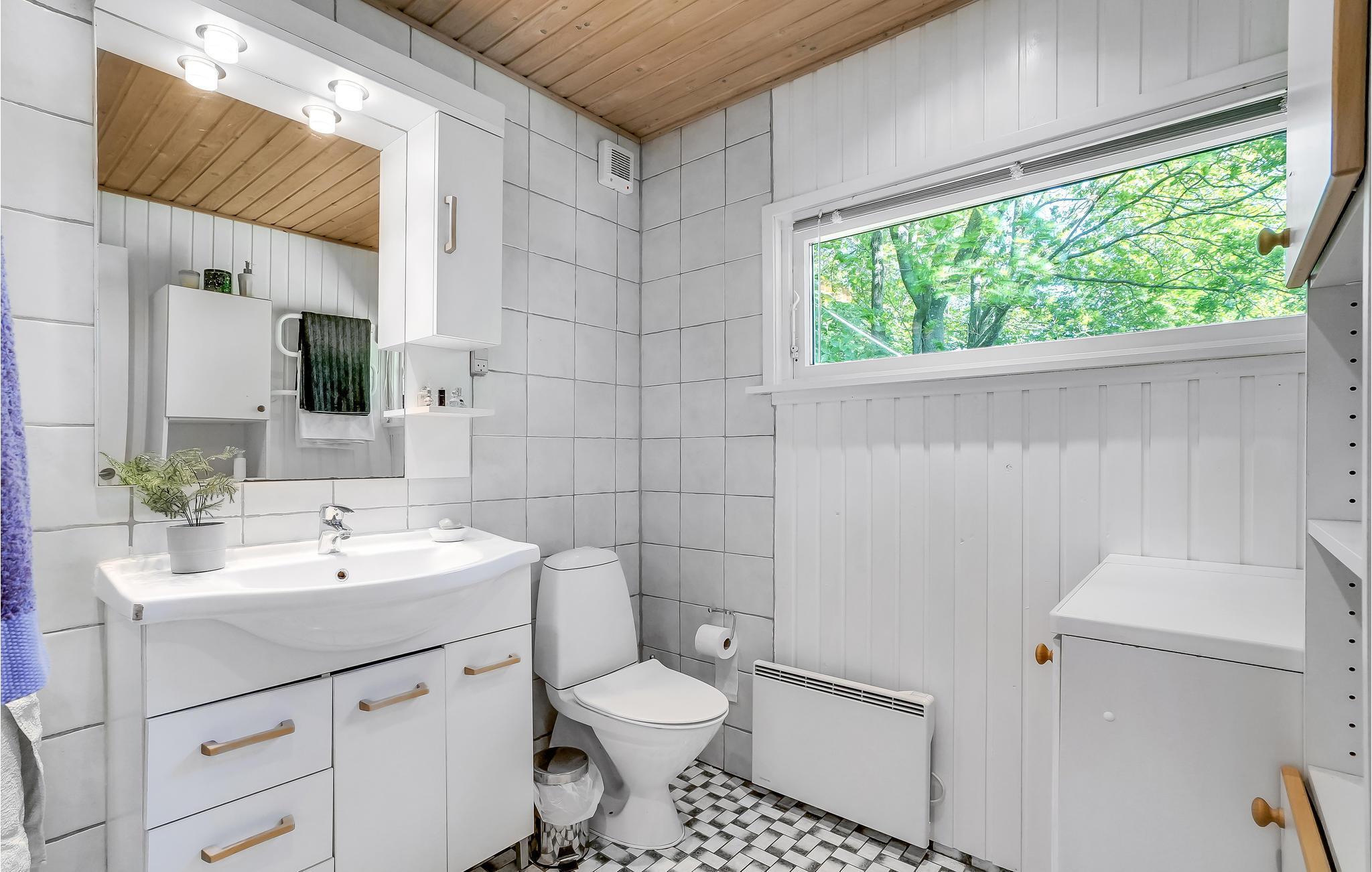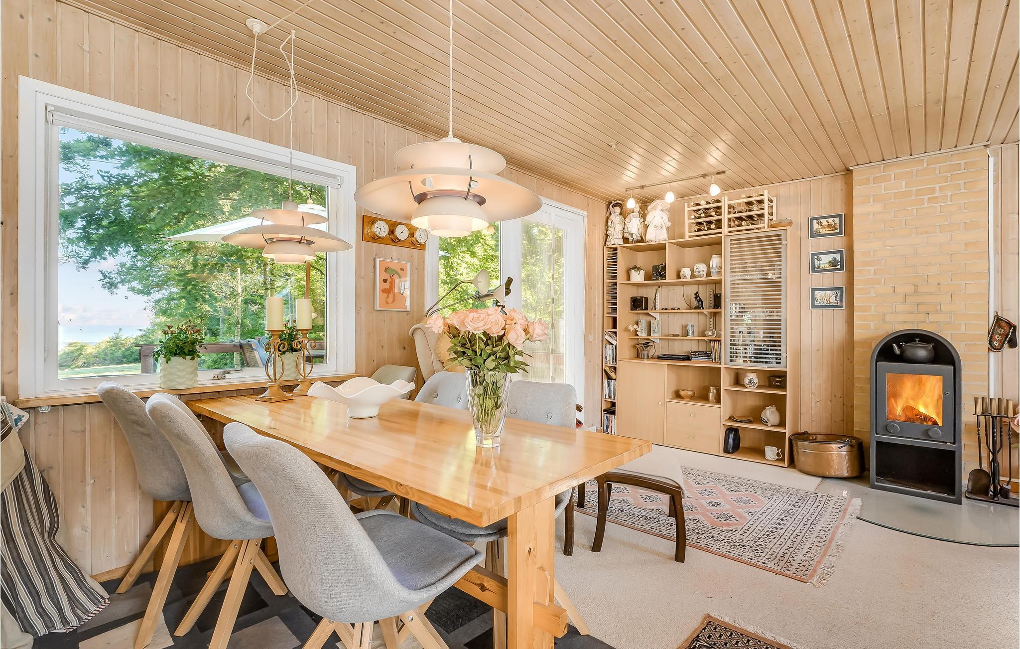 Mange store vinduer lukker masser af dejlig dagslys ind i sommerhuset. Trævæggene skaber en hjemlig, rustik atmosfære. På køligere aftener kan I slappe af og nyde varmen fra brændeovnen i stuen.