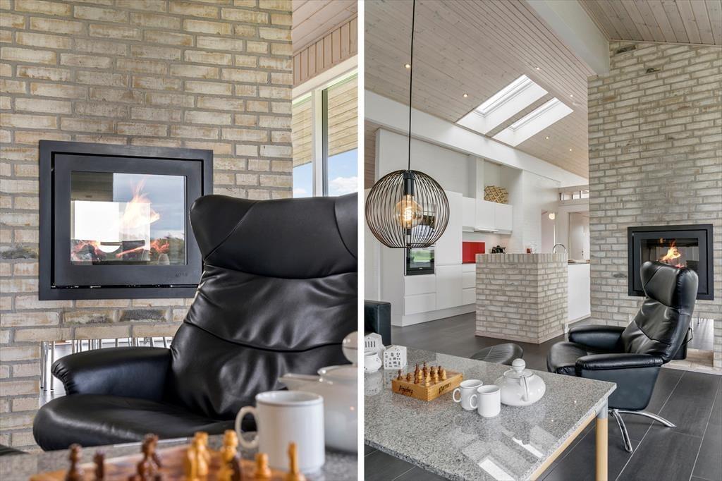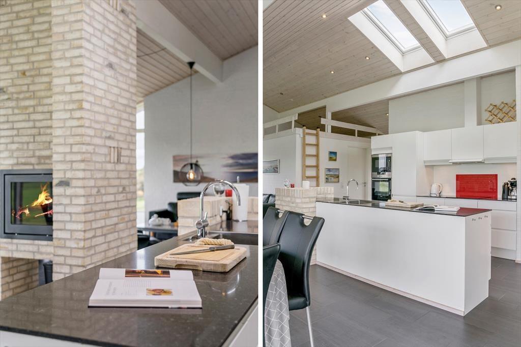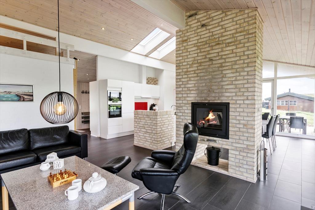 Når du træder ind i Bræmmen 8, bliver du mødt af en lys og indbydende indretning, der sætter tonen for din ferie. Det moderne sommerhus er bygget med fokus på kvalitet og funktionalitet, og den åbne planløsning mellem køkken, spiseplads og stue skaber en harmonisk og rummelig atmosfære. Store vinduespartier lader dagslyset strømme ind og giver et dejligt lysindfald i hele huset, så du kan nyde den smukke udsigt over landskabet. Køkkenet er pænt og veludstyret, og det åbner op til spisepladsen, hvor du kan samles omkring bordet og hygge dig med god mad og samtale. I stuen er der en brændeovn, som indbyder til hygge på de kølige aftener, og du kan også finde et roligt hjørne til afslapning. Sommerhuset har desuden to badeværelser, hvilket giver ekstra komfort, og forstuen med vaskemaskine og tørretumbler gør praktiske opgaver lettere under ferien.
