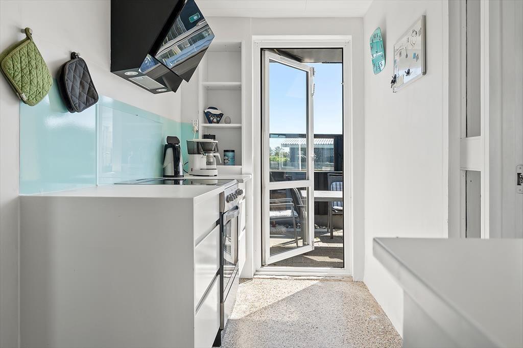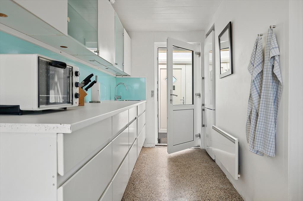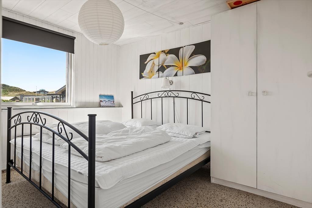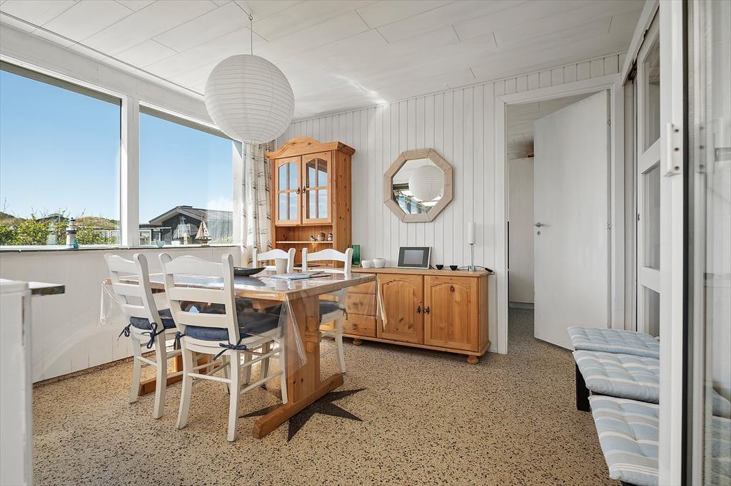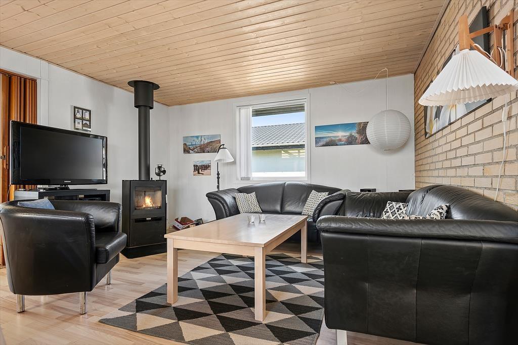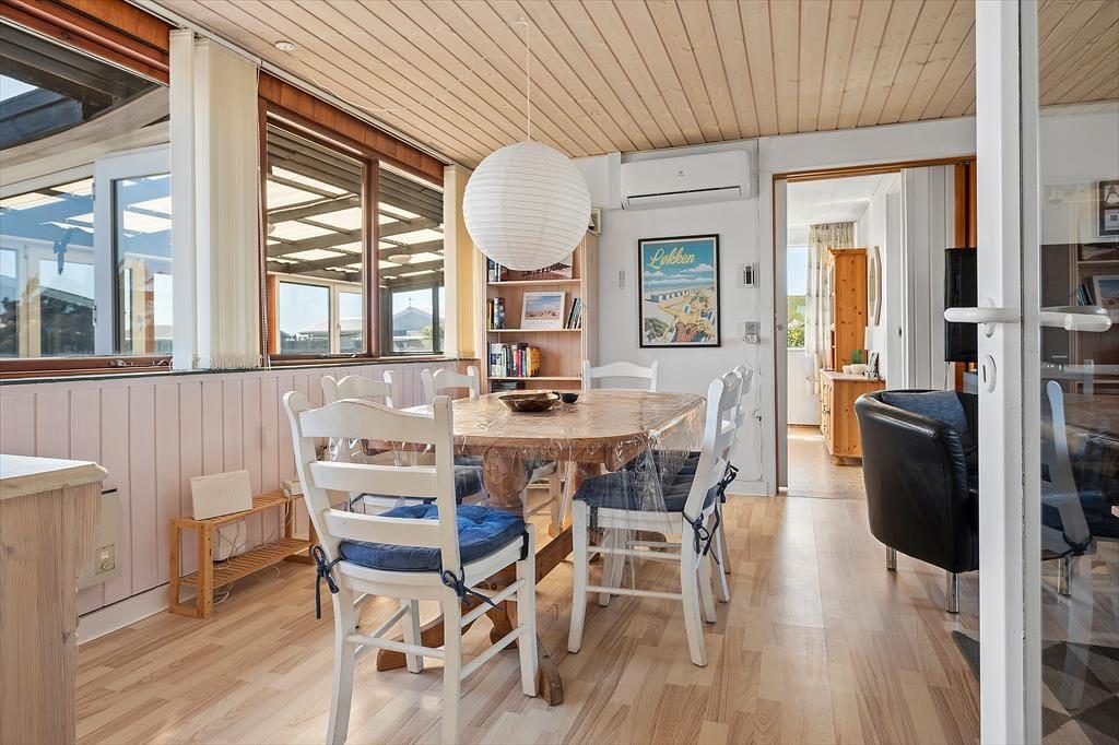 Det 85 m2 store sommerhus er indrettet i lyse farvetoner, så det fremstår pænt og indbydende. Den velfungerende planløsning byder på tre soveværelser med sengepladser til fem personer og et badeværelse med bruser. Køkkenet er veludstyret med blandt andet opvaskemaskine, vaskemaskine og mikroovn, og ved siden af ligger en hyggelig stue, hvor i kan samles til gode måltider, filmaftener og hyggestunder nær brændeovnen. I kan også slå jer ned i den tilstødende stue, som har udsigt til Furrebys høje klitter – og samme fine udsigt kan nydes fra udestuen, som er en herlig opholdsplads, når vejret er mildt og solrigt.