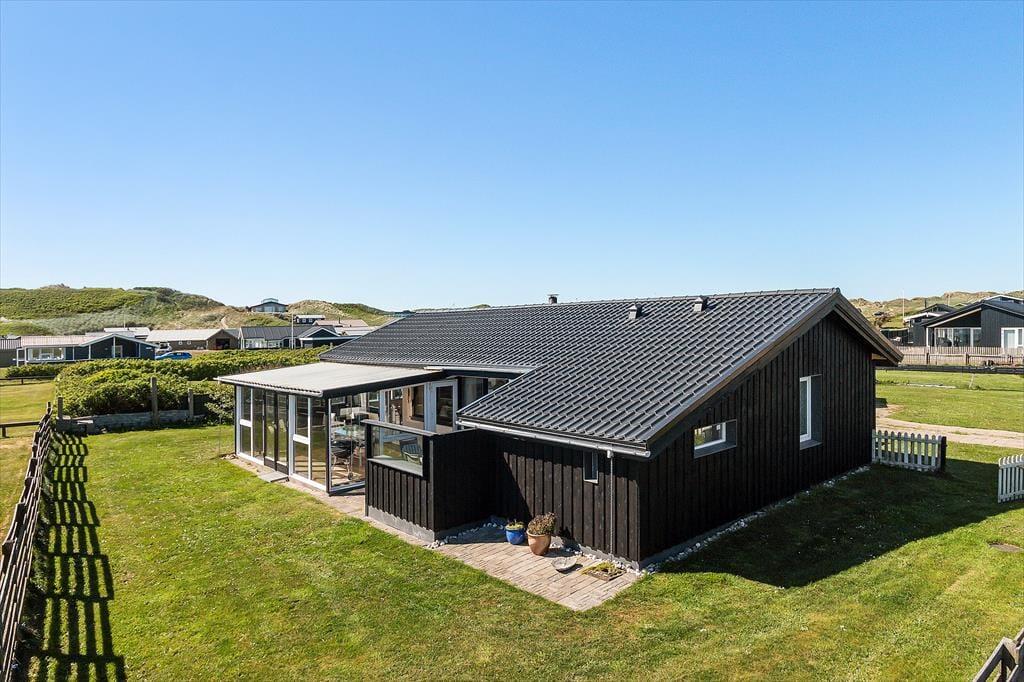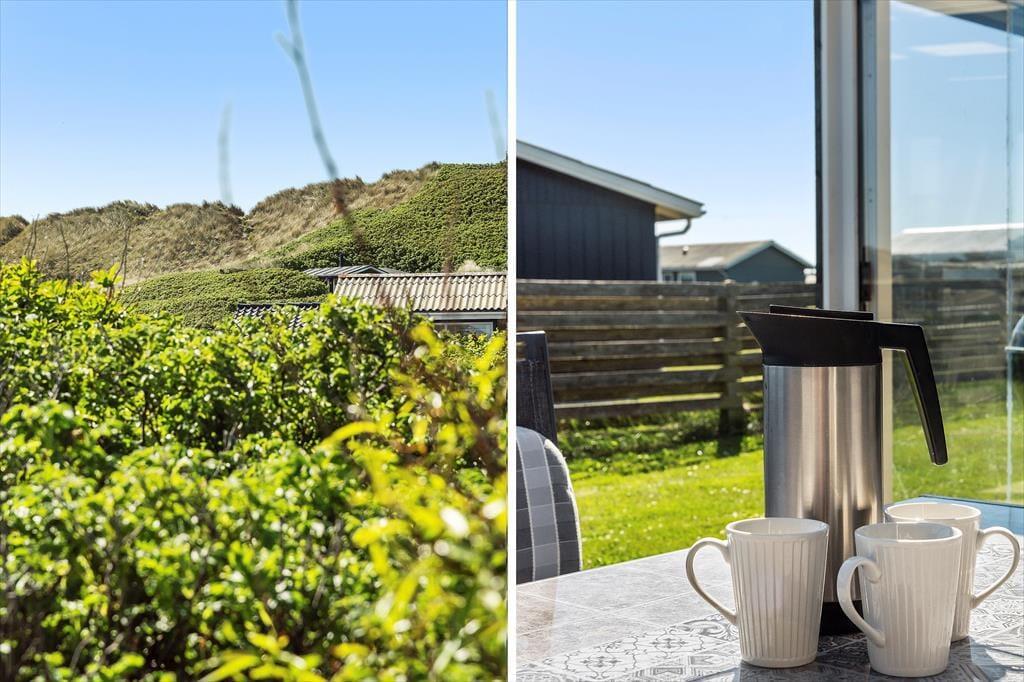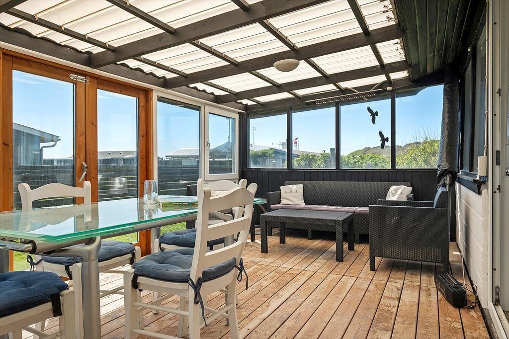 Vågner I op til solskin og lune temperaturer, kan I overveje, om morgenmaden skal serveres ude i det fri. Sommerhusets terrasse er orienteret mod syd og ligger i læ af udestuen, så der er skønt at være det meste af dagen. En del af den 1.063 m2 store grund er helt lukket af med stakit, og det er rart, hvis I har hund med på ferie. Hele grunden er for øvrigt enkelt anlagt med græsplæne, og så er der garage til bilen.