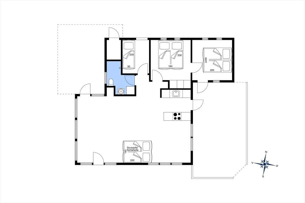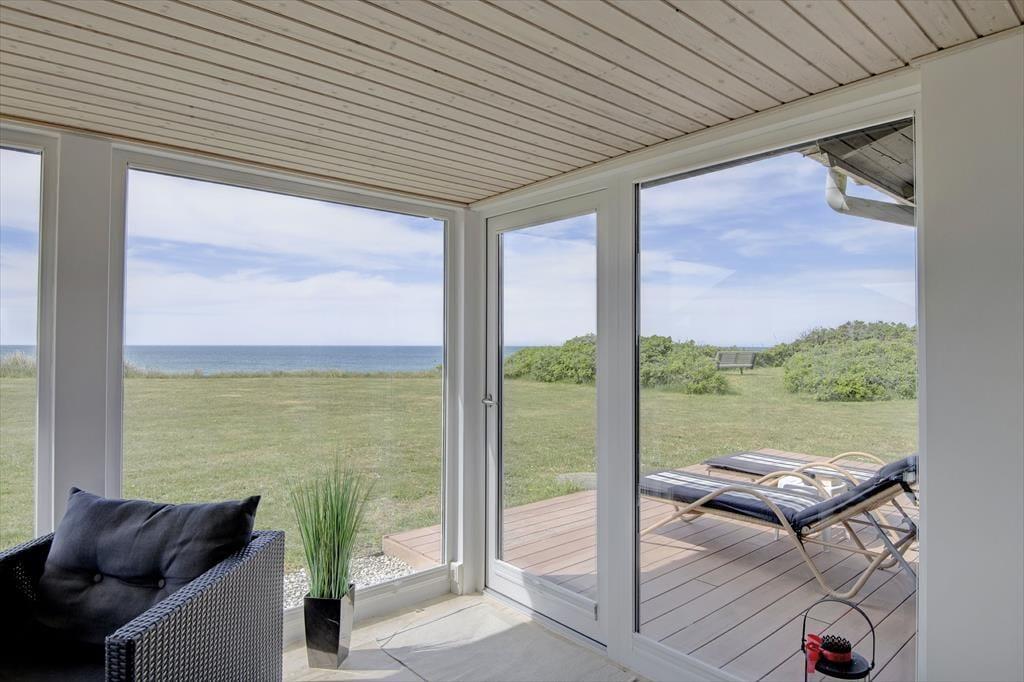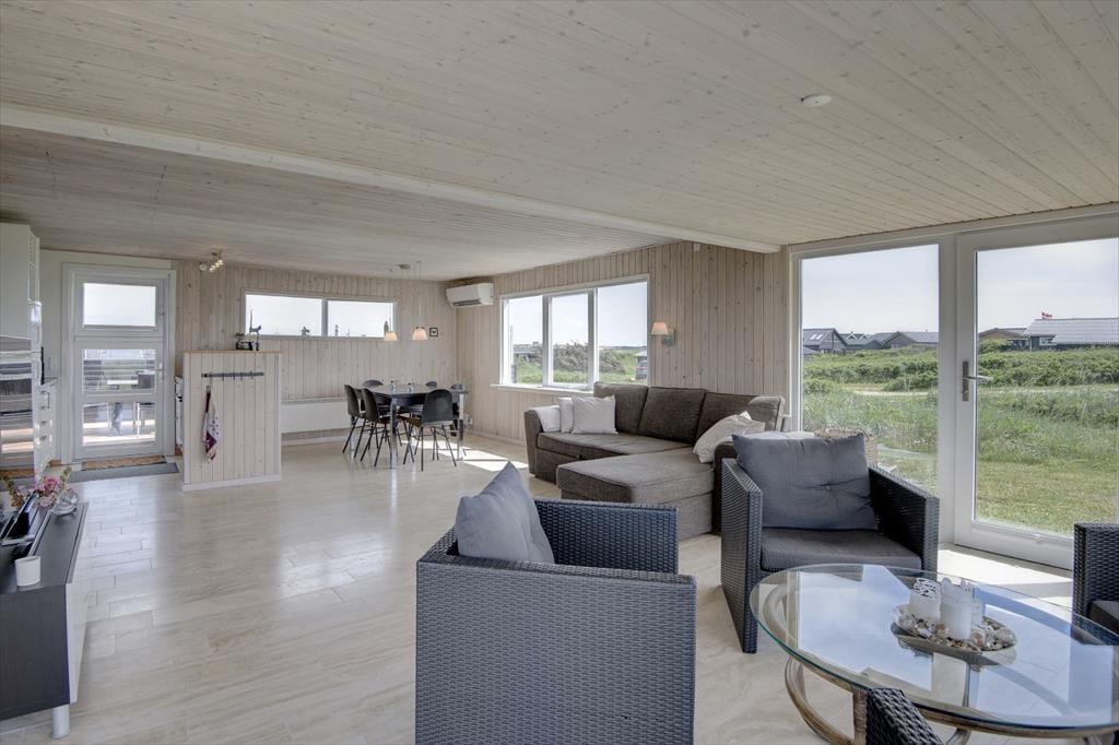 Det er svært at bo meget nærmere stranden end dette, for det er kun en skrænt, der adskiller sommerhusgrunden fra stranden. Derfor får I en ret unik mulighed for at nyde synet af Vesterhavets blå bølger, når I hygger jer inden døre – og rent arkitektonisk er der naturligvis taget hensyn til havudsigten, for sommerhusets stue er udstyret med store vinduer fra gulv til loft. Når I ellers kan løsrive jer fra det smukke syn, er der en fladskærm med Apple TV i stuen, og hvis I kan lide at kokkerere, er det hyggeligt at stå og kræse om maden i det åbne køkken. Et badeværelse hører også med til planløsningen foruden tre soveværelser.