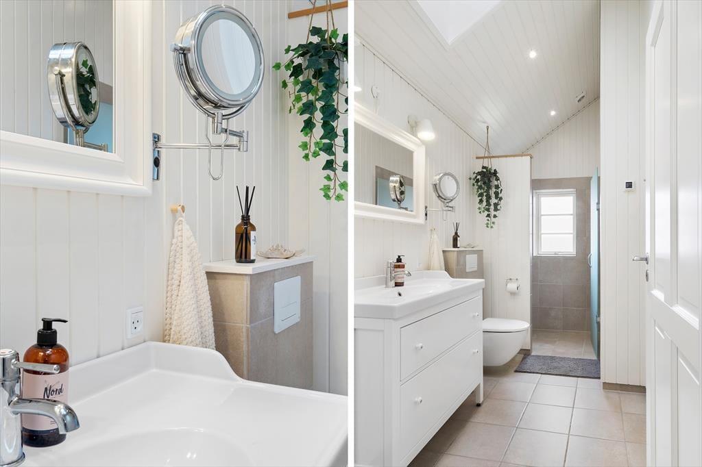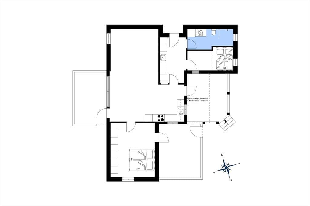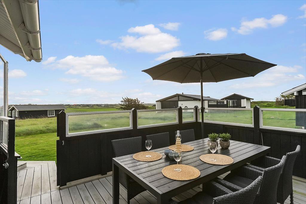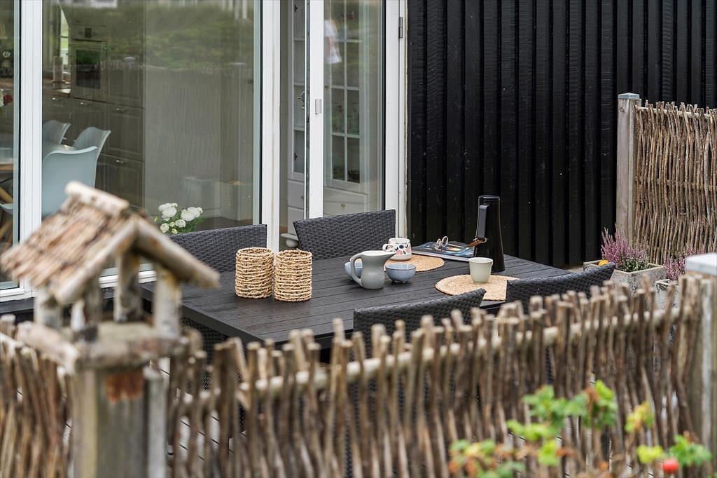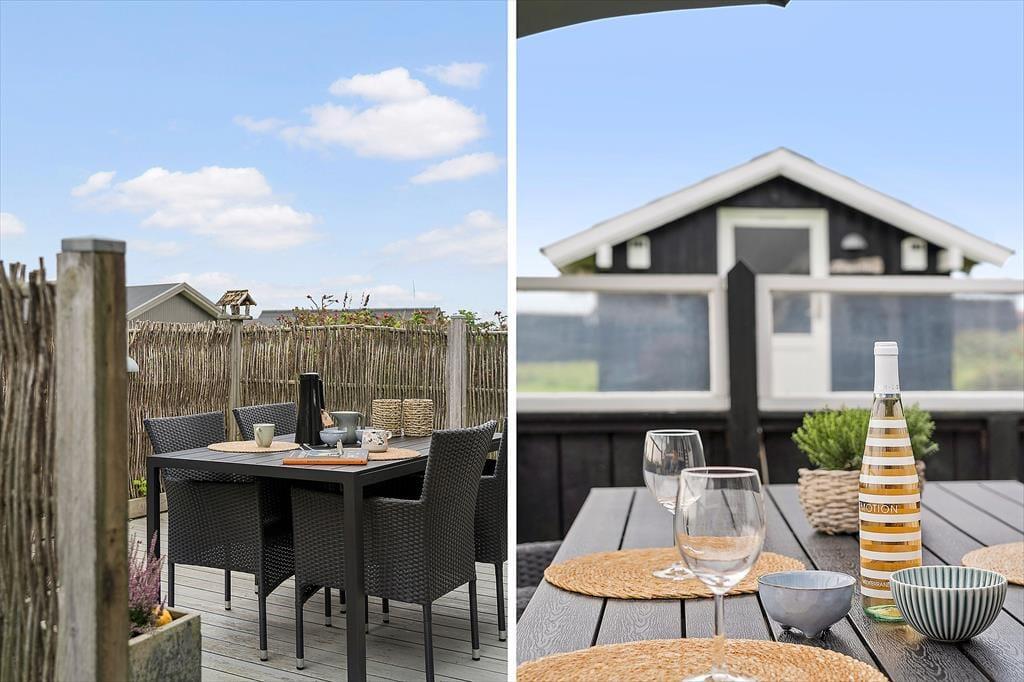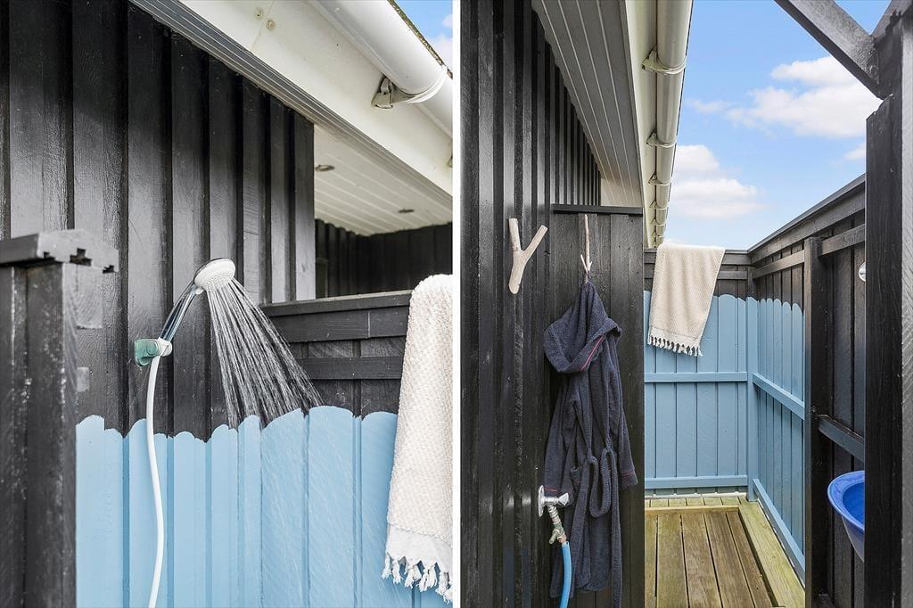 Terrasserne er smart placeret på begge sider af sommerhuset, og derfor kan I finde en solrig opholdsplads hele dagen lang. Afskærmningen sørger for læ, og der er også et overdækket areal, hvis I får brug for at finde ly for en forbipasserende byge. Grunden er enkelt anlagt med en god græsplæne, og der er også en udendørs bruser, så I nemt kan skylle sand og saltvand af efter strandturen.
