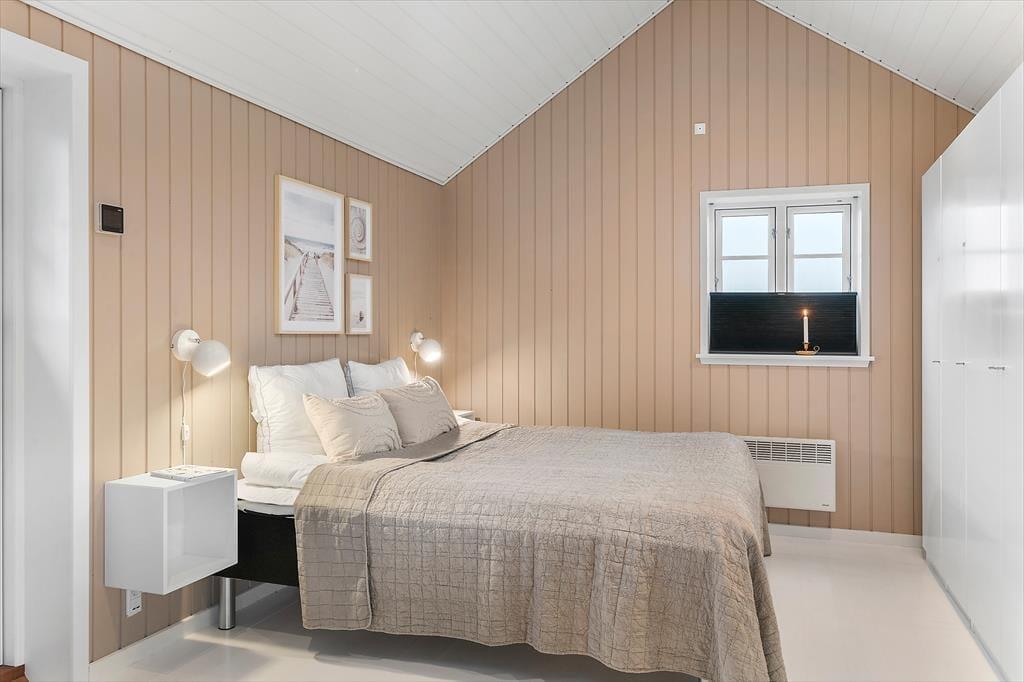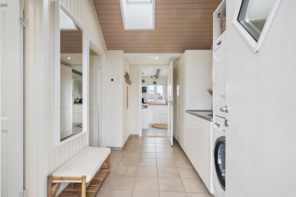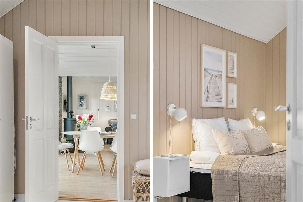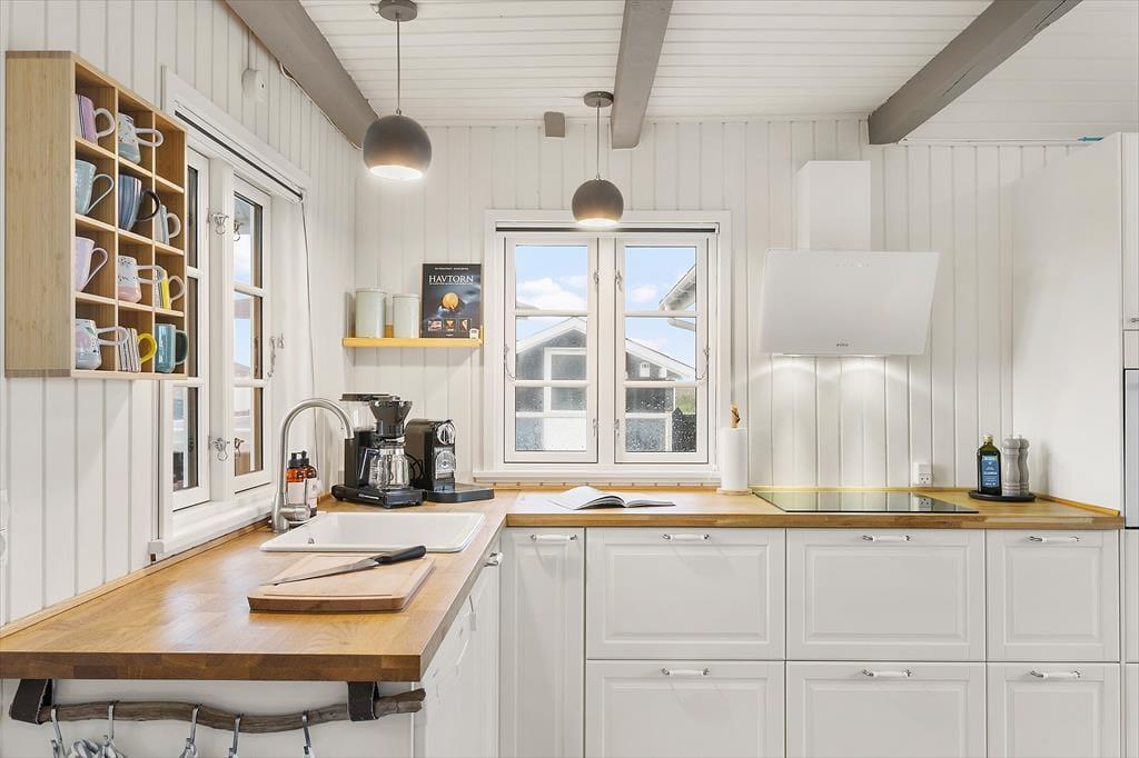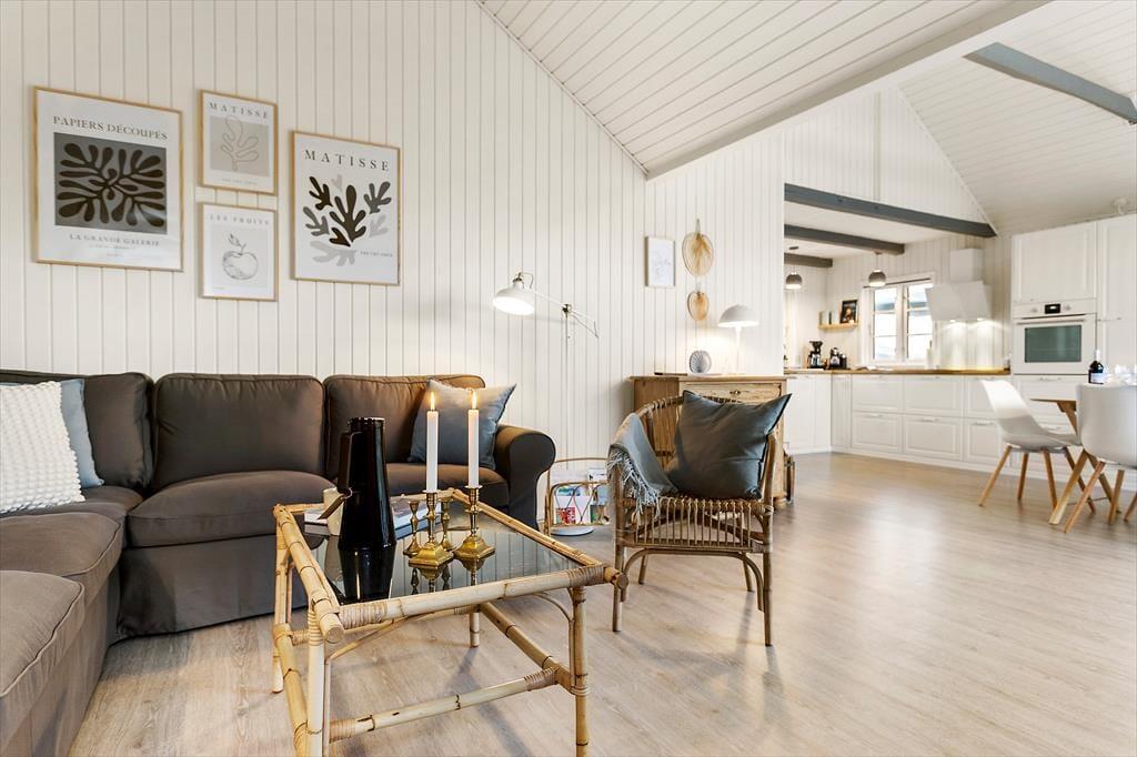 Atmosfæren er lys og venlig overalt i det 89 m2 store sommerhus, der er opført i 2015. Det pæne møblement passer godt til de lyse trævægge og loftet, der går helt til kip, og stuens brændeovn er med til at understrege hyggestemningen. I stuen hænger for øvrigt et fladskærms-tv, og så er der åben forbindelse til et pænt og veludstyret køkken, hvor I sagtens kan være flere om at kræse om maden. Et godt brusebadeværelse og en entré med vaskesøjle hører med til planløsningen, og endelig er der to gode soveværelser, der i alt har sengepladser til fire voksne og to børn.