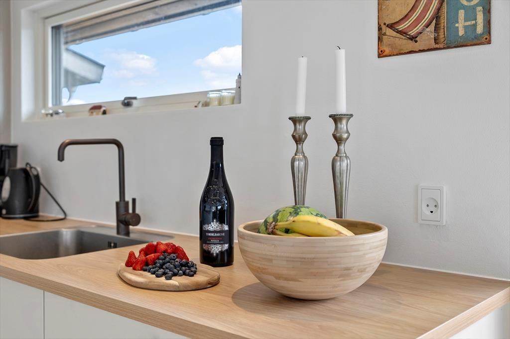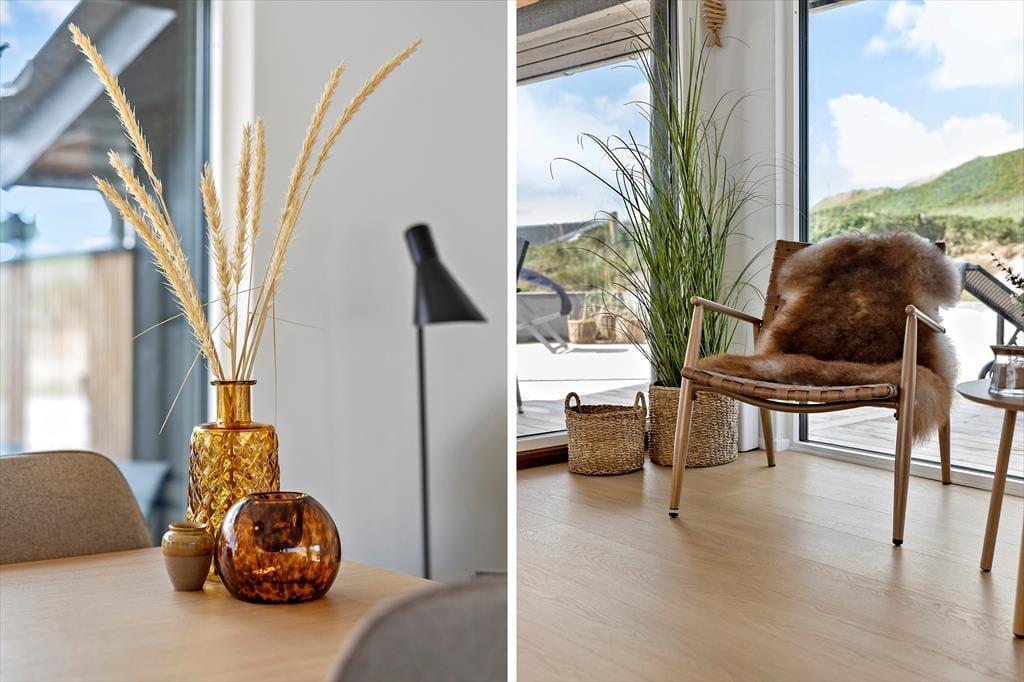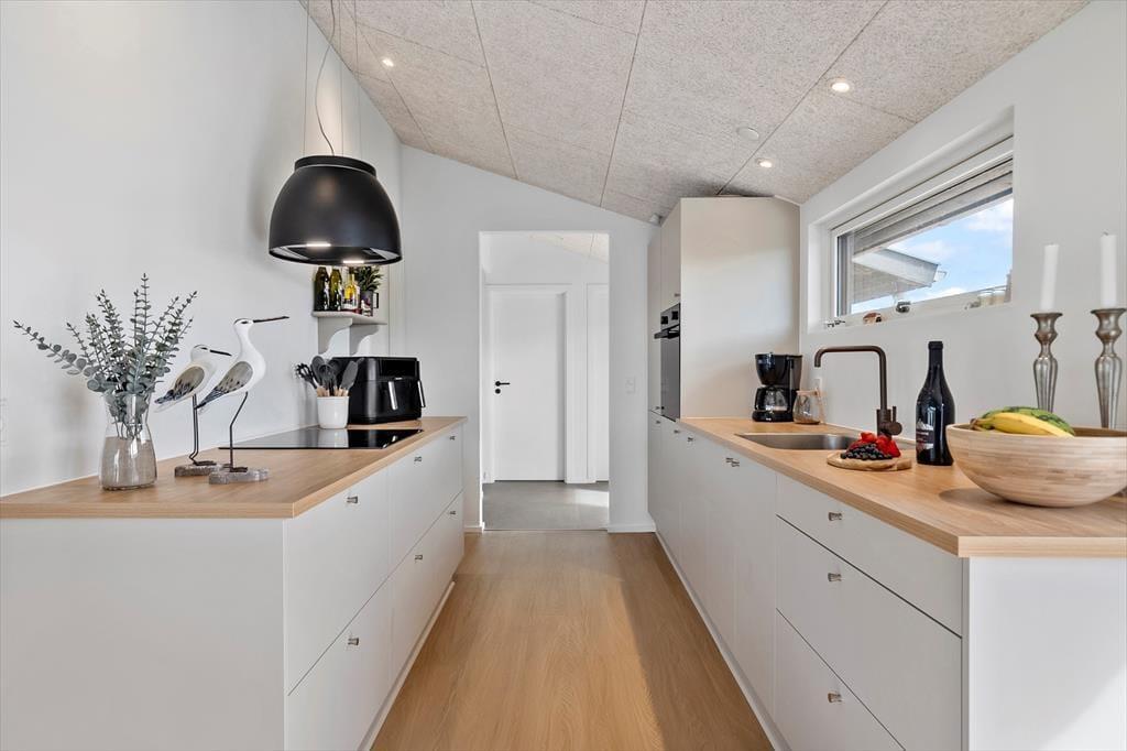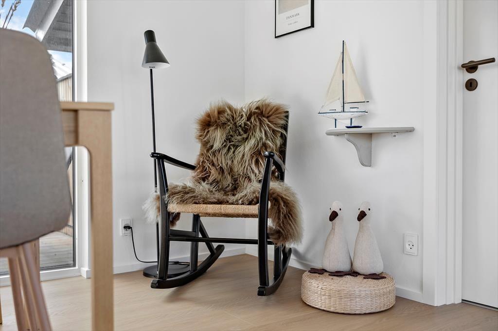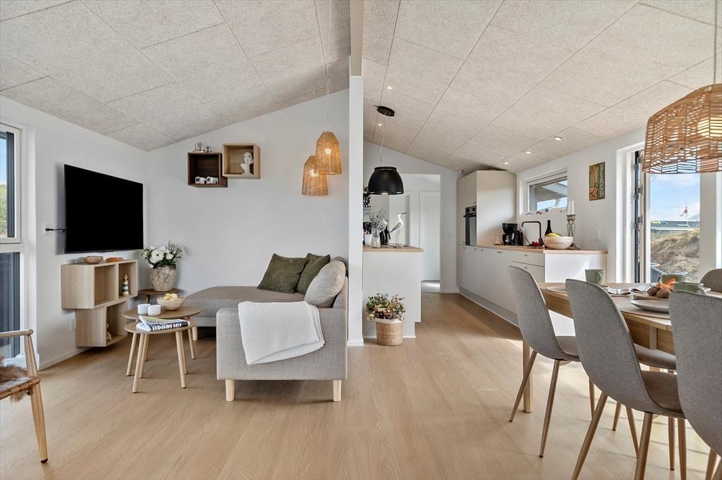 Indendørs bliver du mødt af en lys og behagelig atmosfære med en indretning, der lægger op til afslappet ferie i godt selskab. Opholdsrummet danner et naturligt samlingspunkt med køkken, spiseplads og stue i ét, så I kan lave mad, hygge og slappe af sammen uden at være adskilt. Her er højt til loftet – både i overført og bogstavelig forstand – og store vinduespartier lukker lyset ind og giver udsigt til de grønne omgivelser. Køkkenet er funktionelt og veludstyret, og stuen indbyder til både fællesskab og fordybelse, hvad enten det er med en god bog, brætspil eller en film på skærmen. Når dagens eventyr er forbi, er det rart med praktiske faciliteter som vaskemaskine og tørretumbler – og ikke mindst at kunne trække sig tilbage til rolige sovepladser og lade op til en ny feriedag.