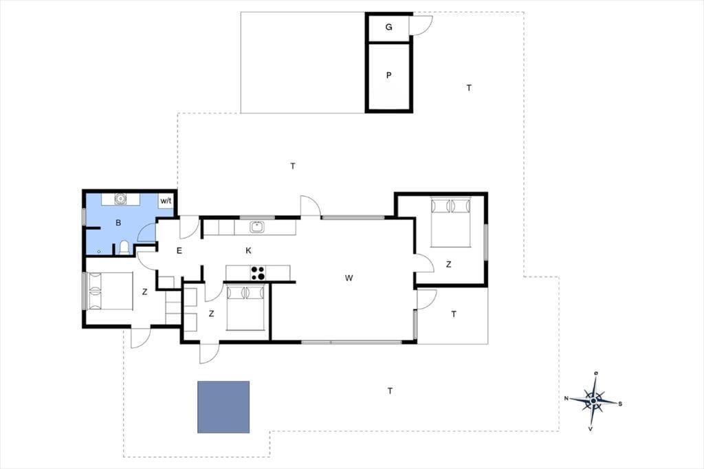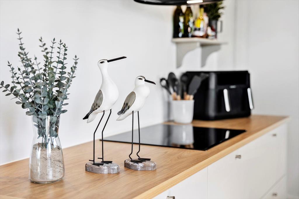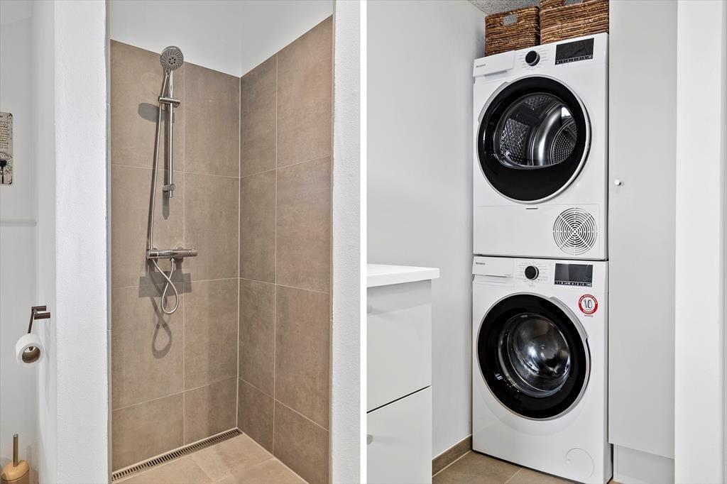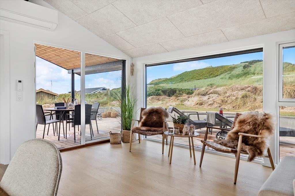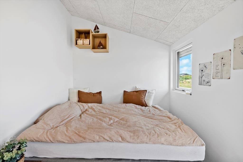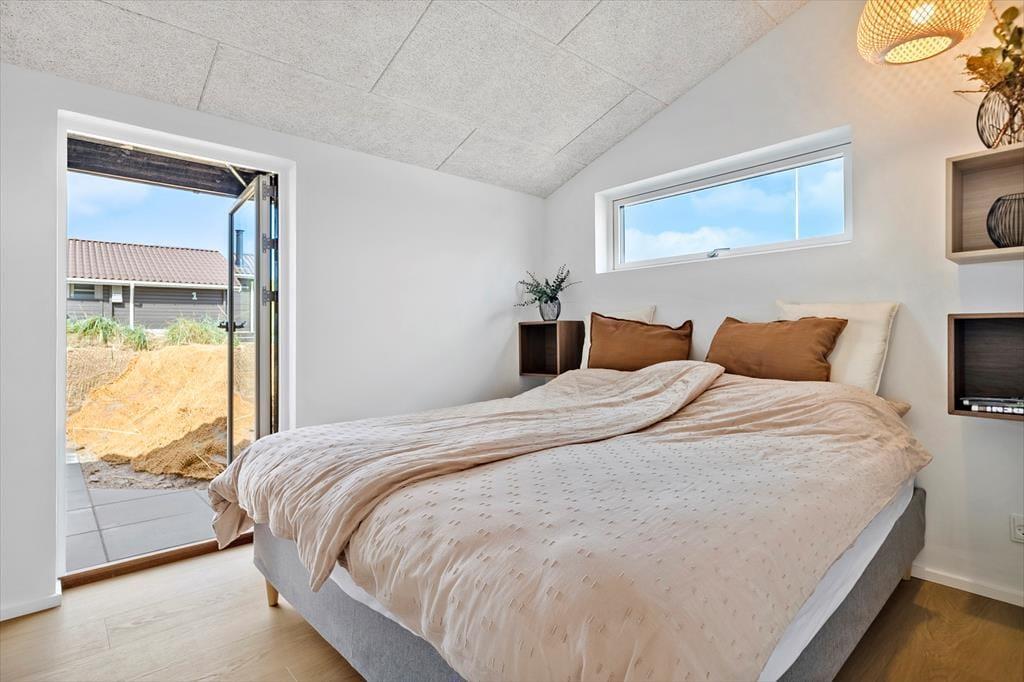 Indendørs bliver du mødt af en lys og behagelig atmosfære med en indretning, der lægger op til afslappet ferie i godt selskab. Opholdsrummet danner et naturligt samlingspunkt med køkken, spiseplads og stue i ét, så I kan lave mad, hygge og slappe af sammen uden at være adskilt. Her er højt til loftet – både i overført og bogstavelig forstand – og store vinduespartier lukker lyset ind og giver udsigt til de grønne omgivelser. Køkkenet er funktionelt og veludstyret, og stuen indbyder til både fællesskab og fordybelse, hvad enten det er med en god bog, brætspil eller en film på skærmen. Når dagens eventyr er forbi, er det rart med praktiske faciliteter som vaskemaskine og tørretumbler – og ikke mindst at kunne trække sig tilbage til rolige sovepladser og lade op til en ny feriedag.