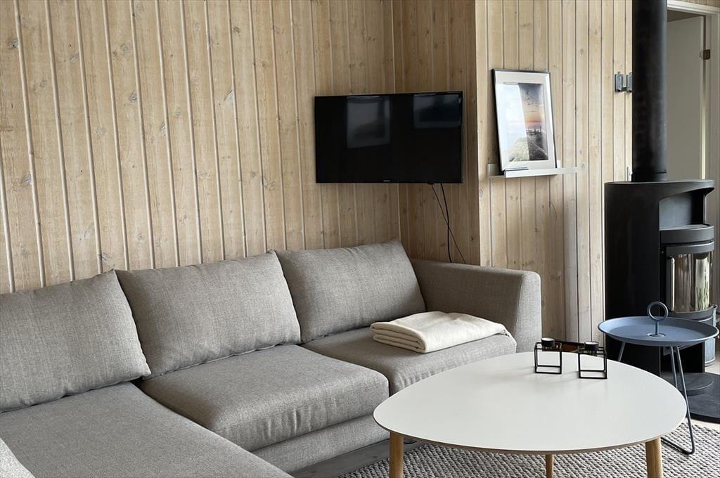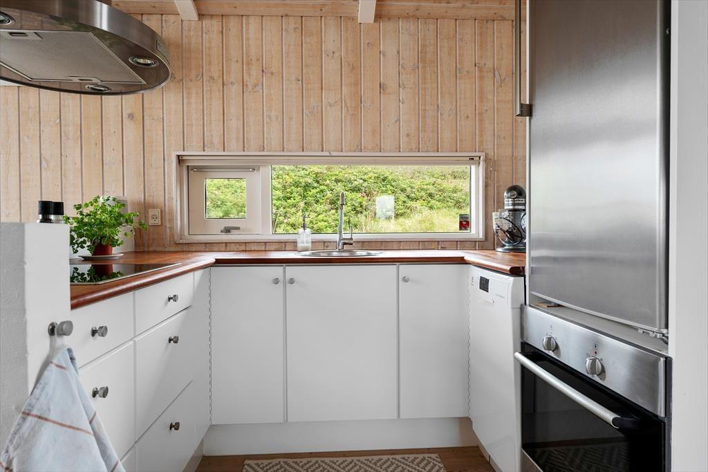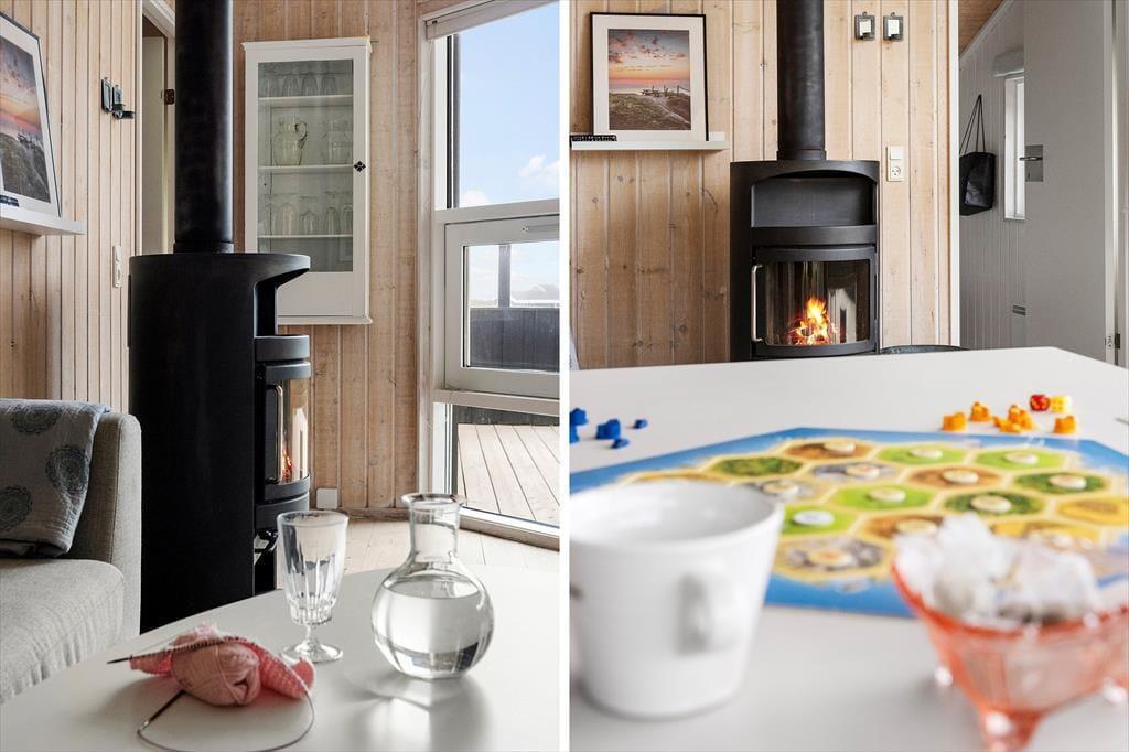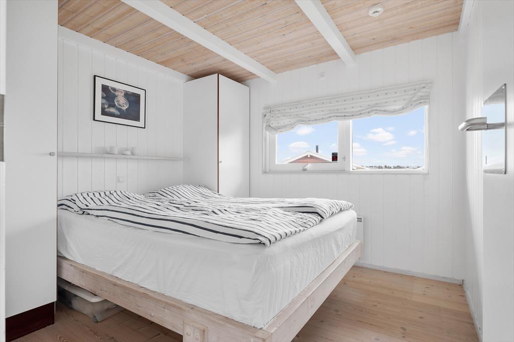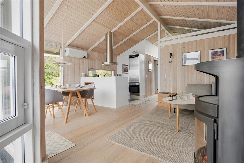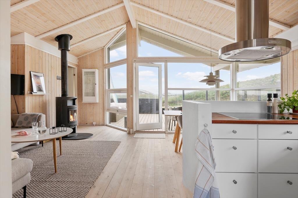 Indendørs bliver du mødt af en lys og indbydende indretning, hvor der er kælet for detaljerne og skabt en rar feriestemning. Det fantastiske lysindfald fra de store vinduespartier fylder rummet med varme og gør det nemt at følge dagens gang fra morgen til aften – uanset om solen skinner eller skyerne driver over himlen. Køkkenet ligger i åben forbindelse med stuen, og netop denne åbne planløsning skaber et naturligt samlingspunkt for både samtale, fælles madlavning og afslapning. Duften af friskbrygget kaffe om morgenen, lyden af brændeovnen der knitrer i aftentimerne, og følelsen af at være sammen – det hele går op i en højere enhed her. Sommerhuset indeholder to gode soveværelser samt et pænt badeværelse – lige til at flytte ind i og nyde med det samme.