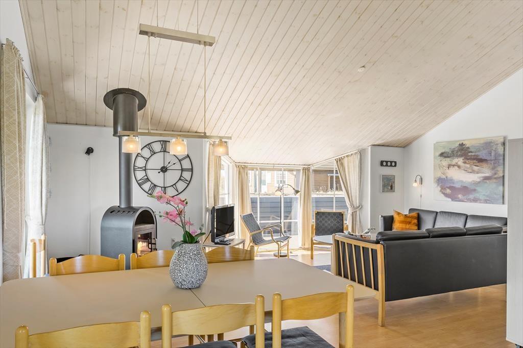 Omkring entreen ligger tre soveværelser, et gæstetoilet og badeværelset med brusekabine og et spabad, hvor man kan slappe af og lade kroppen få ny energi efter en lang dag på tur rundt i det nordjyske. Efter entreen kommer det sidste soveværelse og det åbne køkken- og opholdsrum. Køkkenet er godt udstyret med skabsplads og hårde hvidevarer, også vaskemaskine og tørretumbler, og man kan lukke op til terrassen og tage maden med udenfor på de varme dage. Stuen er domineret af et sofaarrangement foran tv’et og brændeovnen og lægger op til mange afslappende og hyggelige stunder i familiens tegn. Der er en varmepumpe, som sikrer en behagelig temperatur i opholdsrummet, og endelig har man adgang til husets trådløse internetforbindelse, så det er en god ide at medbringe pc eller tablet hjemmefra.